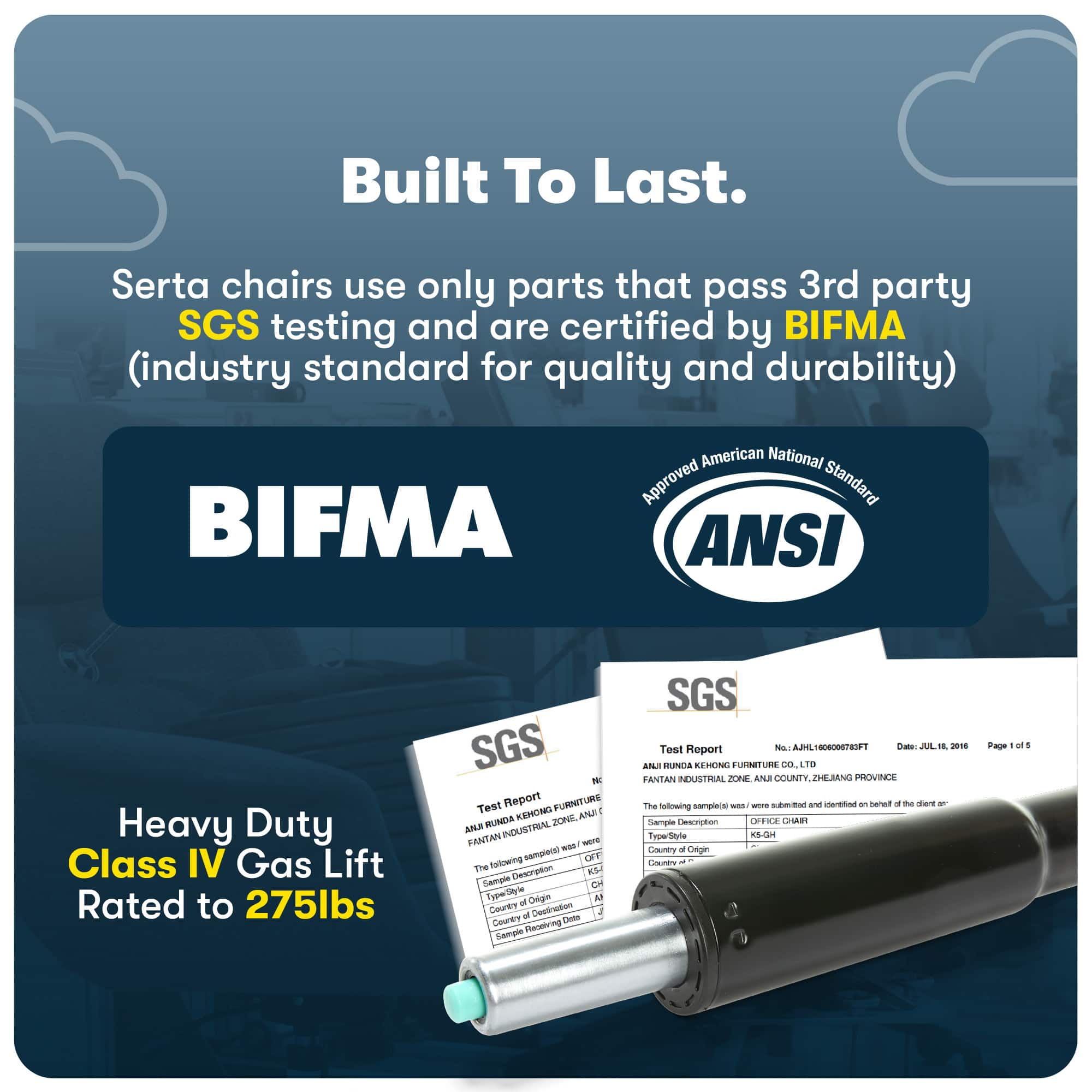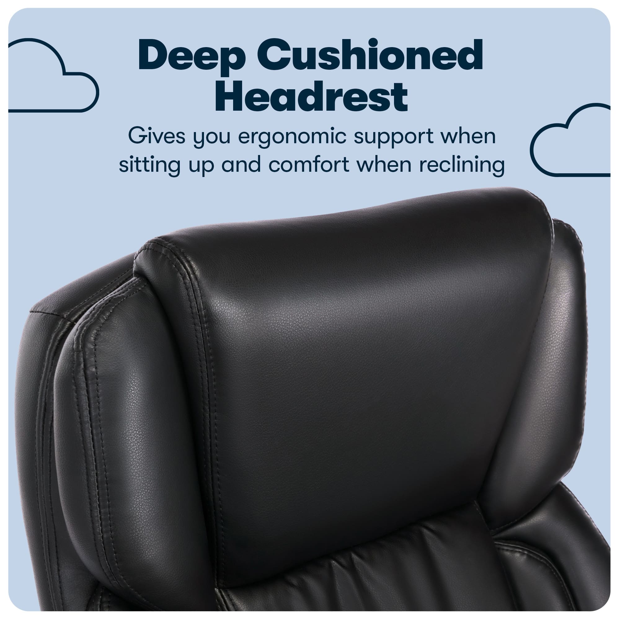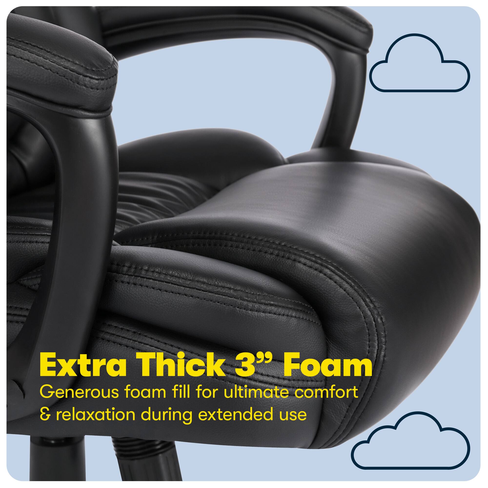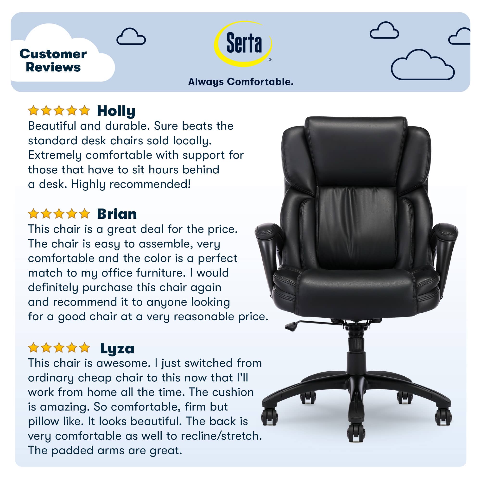 Bring relaxation to your busy workday with the Serta Garret Executive Office Chair. Serta kept comfort in mind while designing this desk chair with luxurious layered body pillows, a contoured lumbar zone, and padded armrests for all day ease and exceptional support during long periods of sitting. The waterfall seat edge reduces pressure on the back of the legs and increases circulation, which helps decrease fatigue while seated. The ergonomic office chair features both recline and seat-height adjustment settings, allowing you to find your optimal seating position. The heavy-duty painted base with scuff-resistant foot pads is designed for long-lasting, reliable use. This desk chair is upholstered in supple bonded leather with contrast stitching for comfort and style in any workspace.