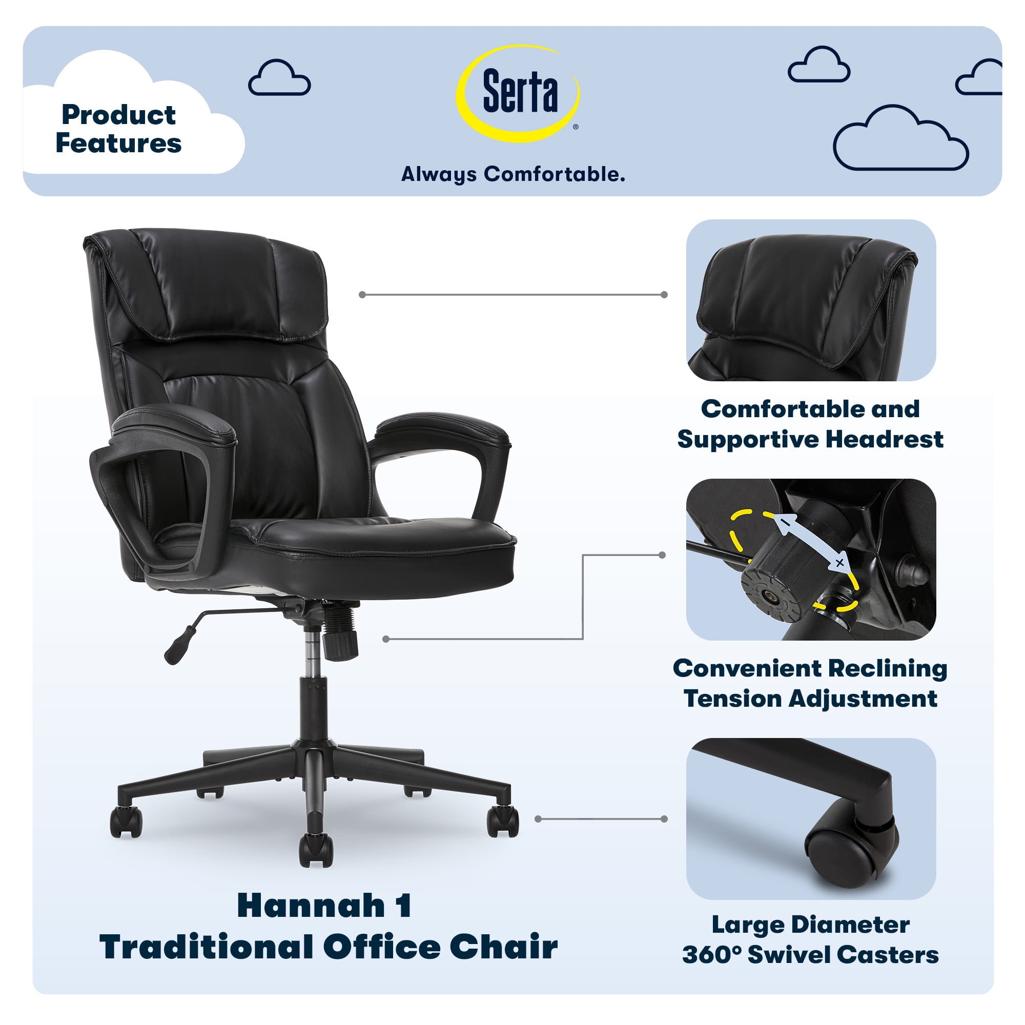 Elevate your workspace with the Serta Swivel Chair – ultimate ergonomic office chair for adults. Get an instant office make-over with the Serta Hannah Bonded Leather High Back Office Chair. Crafted with care, upholstered in luxurious bonded leather. Smooth, supple leather for comfortable seating. Plush body pillows and pillowed headrest provide support. Adjustable height and recline controls for customizable seating with durable casters swivel 360 degrees for easy mobility. Heavy-duty chair supports up to 250 lbs. Wide seat and computer chair design for ample space. Sleek, modern executive chair adds sophistication with a swivel base allows for easy movement. Ergonomic lumbar support for added comfort. Office chair for back pain designed to keep you productive.