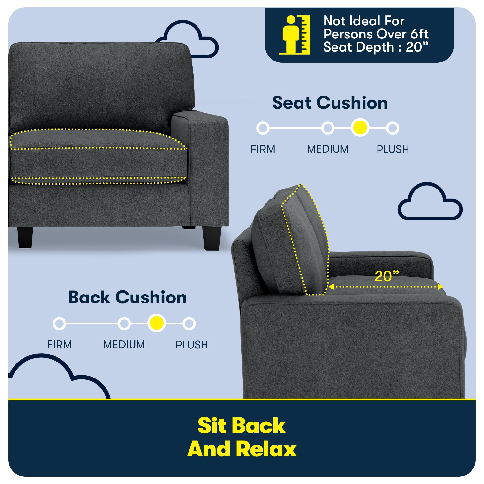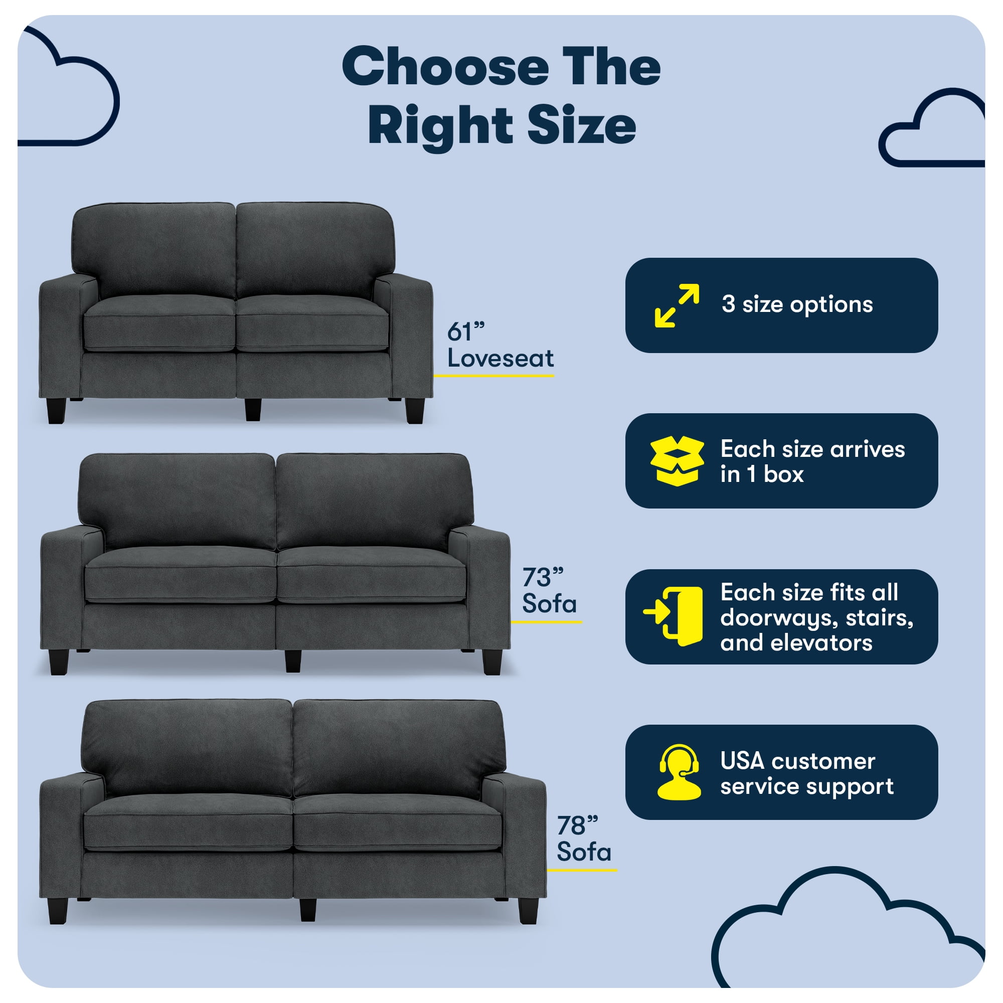 Whether you’re furnishing your first home or seeking a space-saving solution for your existing space, Serta delivers. Our conveniently packaged sofas arrive directly at your door in one carton, and they provide the perfect blend of style and comfort you’ve come to expect from Serta. Don’t let living in a modestly sized apartment, or being on a managed budget, be the limiting factors to creating a welcoming home. The Serta Palisades collection is designed specifically for smaller living spaces, offering 61″, 73″ and 78″ length options. With a seat depth of 20.5″ you can still relax comfortably without the sofa taking up too much space. However, this means the sofa’s proportions are better-suited for users under 6 feet tall. The unopened box will fit any doorway, hall, stairwell, or elevator. Once in your home, it will thrive in smaller living rooms or home offices, but is a versatile choice for dorms, kid’s rooms, den, and family rooms. Plus, its low-profile will make any smaller space feel open and airy, giving the freedom to mix and match with other furniture pieces. This inviting sofa features clean lines and track arms for a timeless look. Upholstered in an anti-pilling polyester fabric or durable bonded leather, the Palisades is easy to care for and spills are simple to clean. 16 color options are available to complement your décor. Please note that the actual color may differ slightly from what appears online depending on the amount of light and the positioning of the sofa in any space. Soft pillow backs, generously filled with soft fibers, rest against a backrest with structured webbing to keep things comfortable and supportive. The seat cushions are filled with high-density, non-recycled Serta quality foam, which cover individually wrapped pocket coils for a supportive core and semi-plush sit. Welcome the Serta Palisades Sofa into your home for modern style and comfort with space-saving functionality. Lounging or relaxing has never been so convenient. Features: SPACE-SAVING DESIGN: Its compact size and low-profile (73″ wide x 33″ deep x 36″ high) make this two-seater couch a great choice for smaller apartments or lofts, living rooms, or home offices. Fits all doorways, halls, stairs or elevators. Better-suited for users under 6ft tall. MODERN CLASSIC: Combines modern and minimalist design with track arms for a sleek and streamlined look. Upholstered in a no-pill polyester fabric or smooth bonded leather with piped edges for a tailored finish in 16 color options. SIT BACK & RELAX: The loose pillow backs are generously filled with soft fibers and supported by structured webbing within the backrest for comfort and support. The pocket coil seat cushions filled with high-density foam provide a semi-plush sit and have removable covers for effortless cleaning. SERTA FOAM & BUILD: Made of a solid wood frame fitted with sinuous springs for extra support and sturdy solid wood legs that can handle up to 500 lbs. All Serta sofas use quality, non-recycled foam for breathability and safety. EASY ASSEMBLY: Simple and quick assembly with hardware kit included. We offer USA Customer Support. Specifications: Product Weight: 74.96