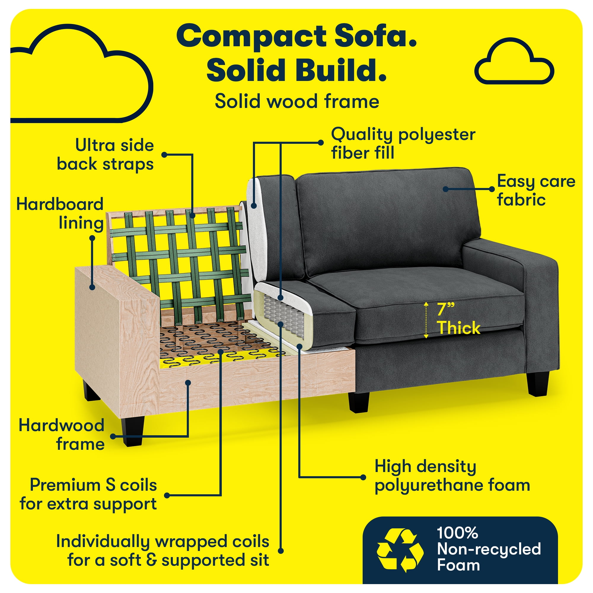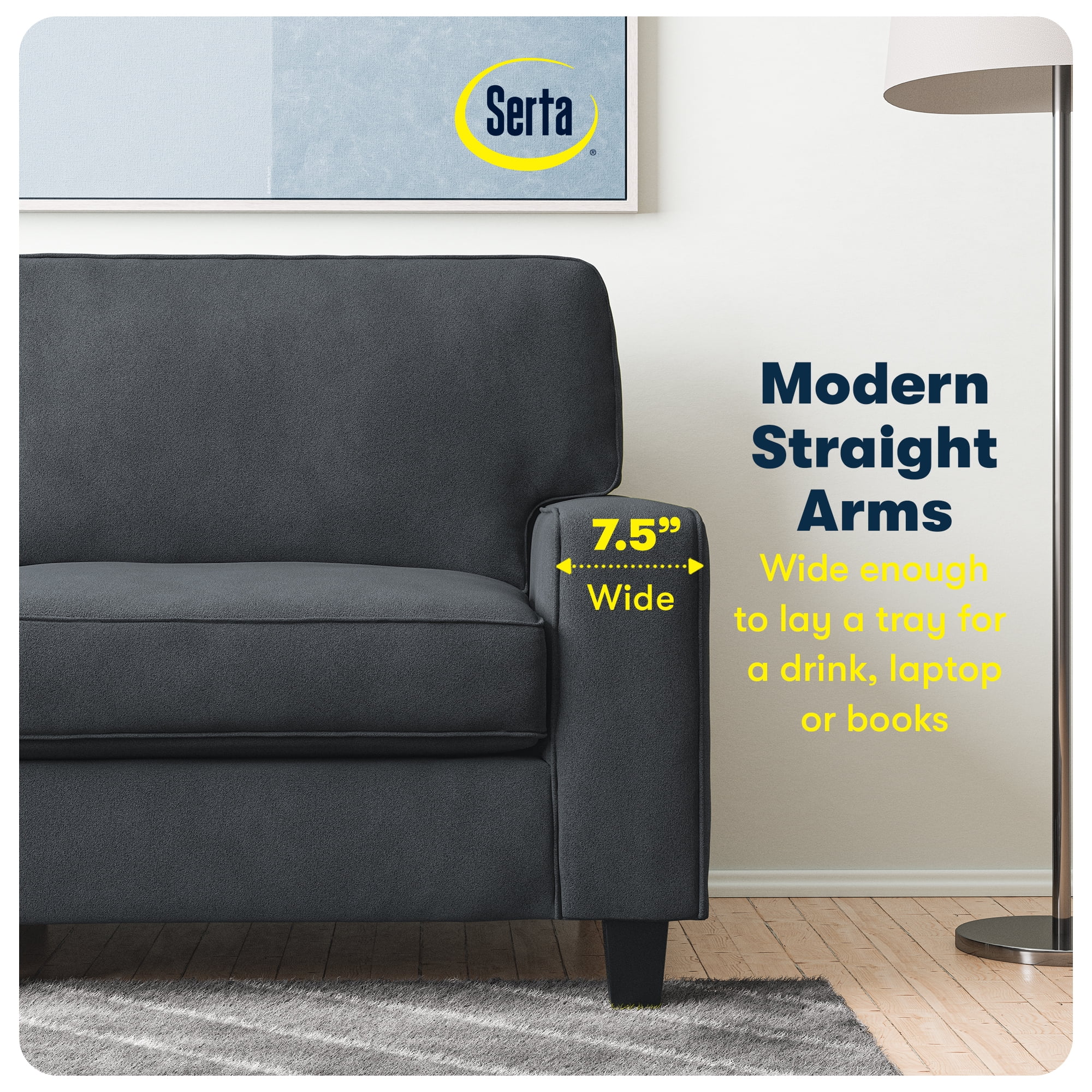 SPACE-SAVING DESIGN: Its compact size and low-profile (73″ wide x 33″ deep x 36″ high) make this two-seater couch a great choice for smaller apartments or lofts, living rooms, or home offices. Fits all doorways, halls, stairs or elevators. Better-suited for users under 6ft tall. MODERN CLASSIC: Combines modern and minimalist design with track arms for a sleek and streamlined look. Upholstered in a no-pill polyester fabric or smooth bonded leather with piped edges for a tailored finish in 16 color options. SIT BACK & RELAX: The loose pillow backs are generously filled with soft fibers and supported by structured webbing within the backrest for comfort and support. The pocket coil seat cushions filled with high-density foam provide a semi-plush sit and have removable covers for effortless cleaning. SERTA FOAM & BUILD: Made of a solid wood frame fitted with sinuous springs for extra support and sturdy solid wood legs that can handle up to 500 lbs. All Serta sofas use quality, non-recycled foam for breathability and safety. EASY ASSEMBLY: Simple and quick assembly with hardware kit included. We offer USA Customer Support.