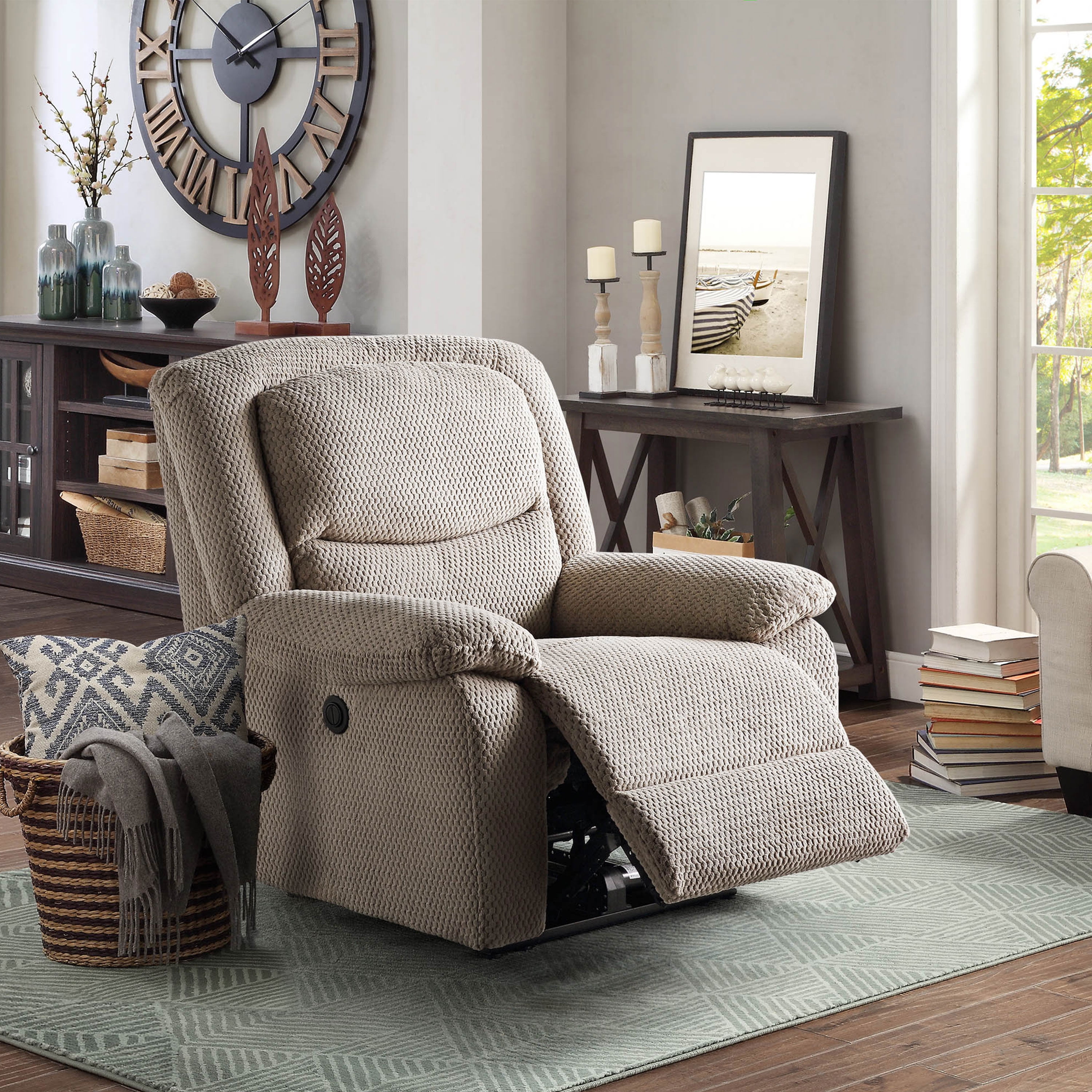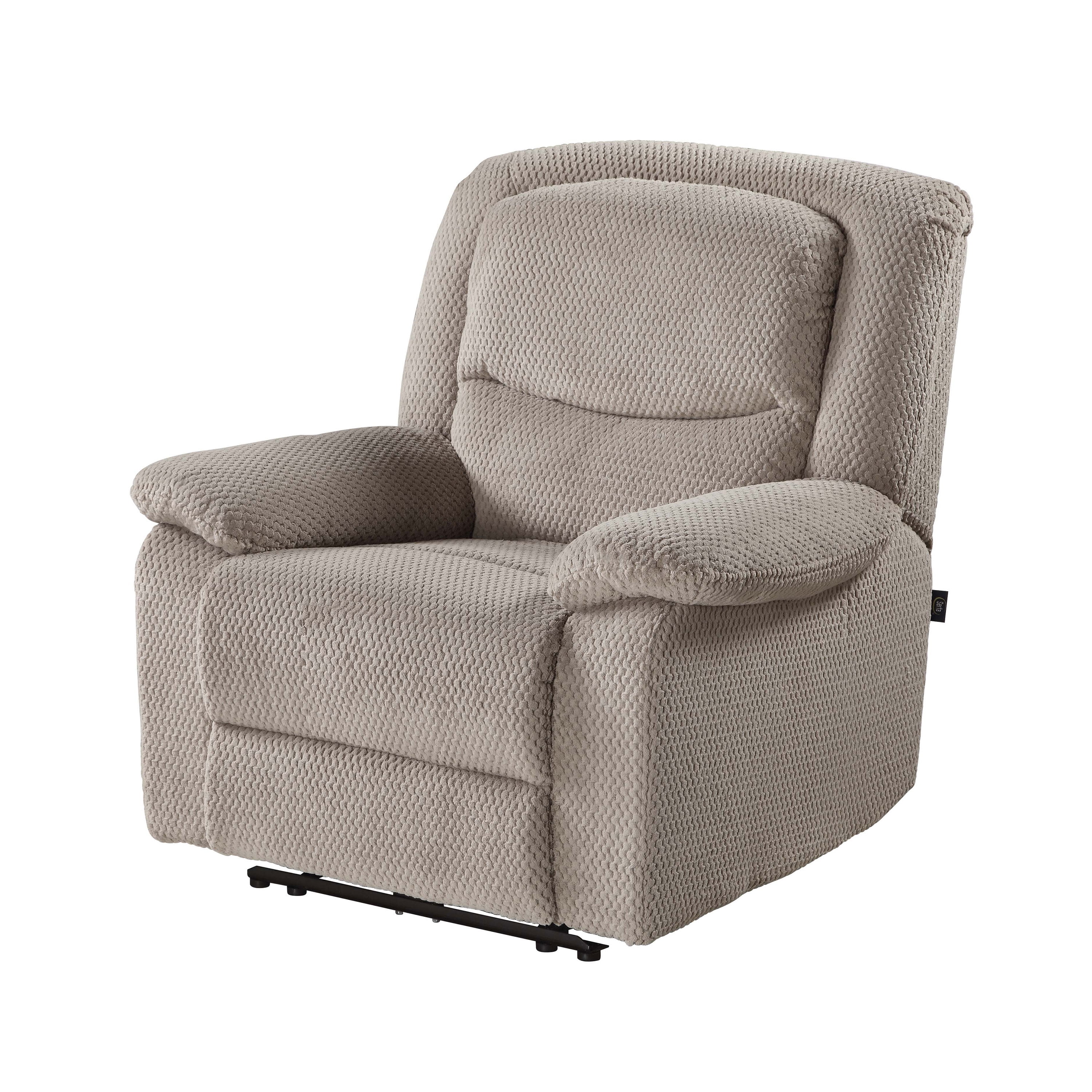 This recliner features deep body cushions that are upholstered in a plush fabric with soft pillow arm rests that provide optimal comfort. High quality chair with simple, push-button power recline control, and full recline feature is a fabulous addition to your living room, family room or any room in your home. Durable steel mechanism. Our recliners offer the best in comfort and style. From modern and contemporary to rustic and traditional, we have high quality indoor furniture that will complement your style. Available in multiple colors: Beige, Brown, Gray Fabric and Brown Leather 1-year warranty Dimensions: 37.75″ W x 38″ D x 41″ H Product Weight: 95.81 lb (43.45 kg) Packaging Dimensions: 35.5″ L x 31.5″ W x 29″ H Packaging Weight: 82.5 lb (37.42 kg) Model #s: CR-47714, CR-48044,1542-3537-56