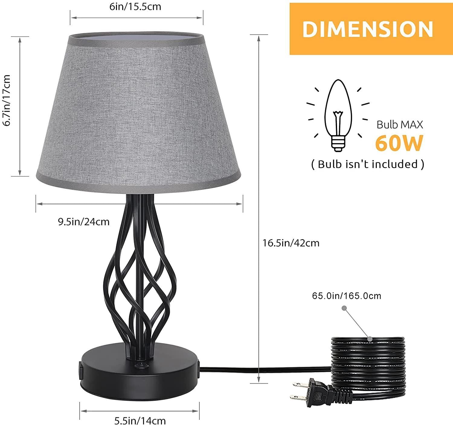 ãDual USB Charging Portsã Built-in dual USB charging ports (5V/2.1A) on the lamps base. It is convenient to charge your 2 devices at once. Such as mobile phones, tablets, kindle readers, speaker, diffuser, and other electronic devices. The USB ports can charge your devices whether the bedside lamp is turned on or off. (Note:Button on the Base) ãIdeal Lamps SizeãLamps dimension – 16.5 (H) x 6 (W) x 5.5 (D) inches, this simple and elegant style table lamp is just right in size and saves space. It is very suitable as a bedside lamp, reading lamp, office lamps, nightstand table lamps, guest room lamp. (Please be clear about the size when you browse) ãUL ListedãThese lamps set can be only equipped with E26 standard size bulbs(not included), Max 60 watts, 120V. It’s compatible with a variety of incandescent, halogen, LED or CFL light bulbs. The cord and plug of bedside table lamps are UL listed. (Bulb isn’t included in the package). ãHome Decoration and Best GiftãThe flawless black spray painted metal twisted pattern base and the gray fabric lampshade combine modern and retro styles. This bedside lamp with usb port is an ideal decoration for your home, and it is also a perfect gift for your family or friends! Specifications USB Output: DC 5V/2.1A (Max) Voltage:. AC 120V~ 60Hz Light Power: Max 60W Light Source: E26 (Bulb Not Included) Power Up State: US Plug AC Power Cord: 65 inches Switch Type: Button Switch on the base Material: Fireproof Plastics and Linen Lamp Size: 16.5 (H) x 6 (W) x 5.5 (D) inches Shade Size: 6.7 (H) x 9.5 (W) x 6 (D) inches Package Included 2 x Lamps with USB Ports(Bulbs Not Included)
