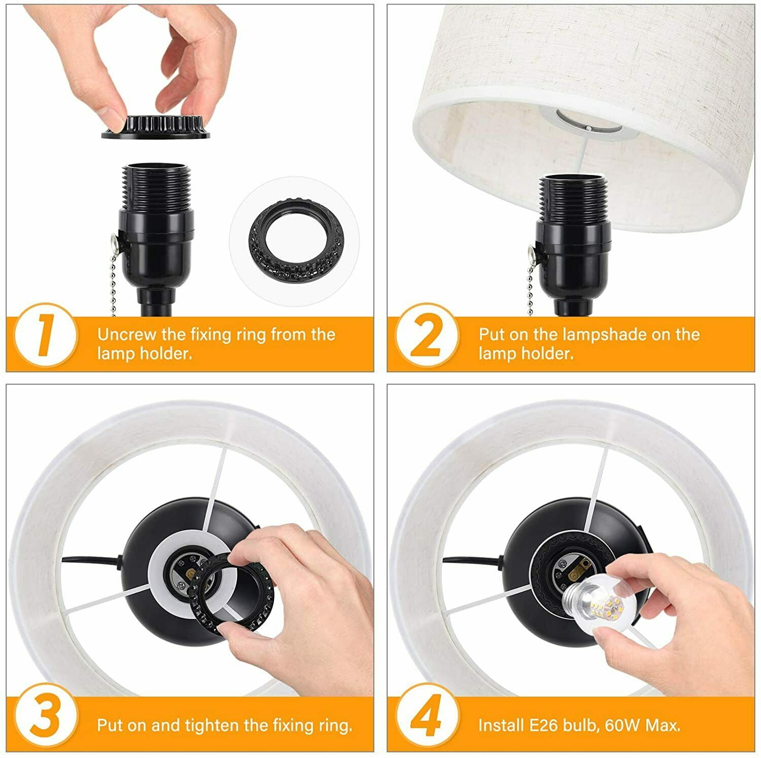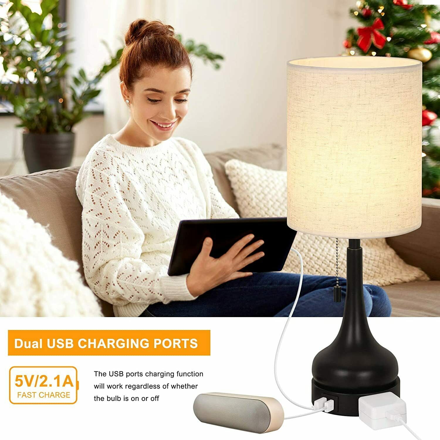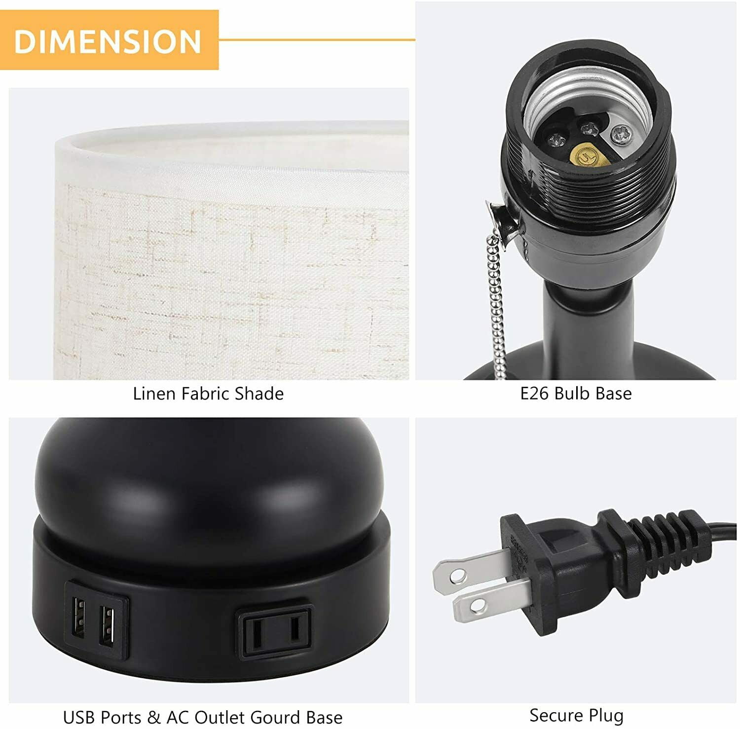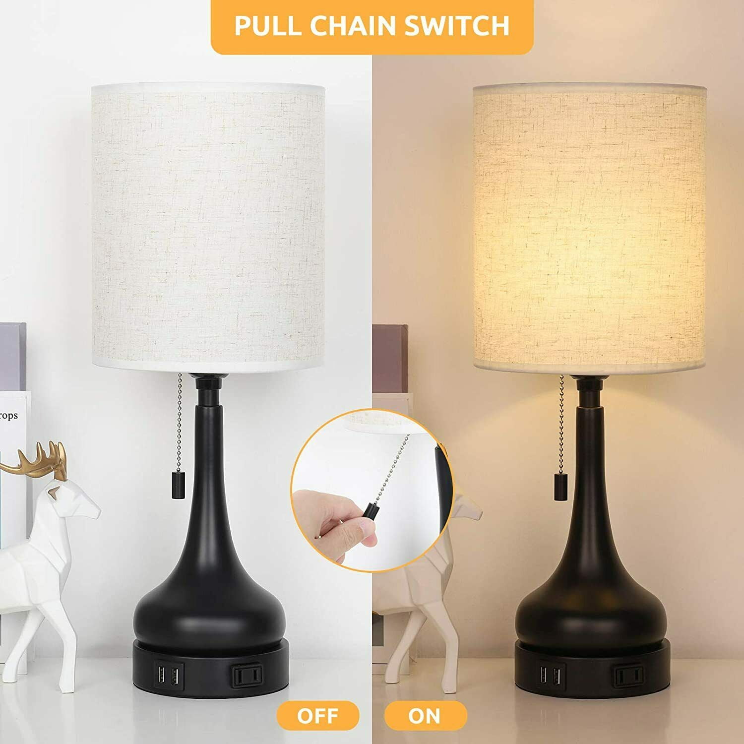 [Dual USB Charging Ports] Built-in dual USB charging ports (5V/2.1A) on the lamps base. It is convenient to charge your 2 devices at once. Such as mobile phones, tablets, kindle readers, speaker, diffuser, and other electronic devices. The USB ports can charge your devices whether the usb lamp is turned on or off. [Pull-chain Lamp Design] Size: 17.9 (H) x 6.9 (W) x 8.3 (D) inches,the bedside lamps are designed with a stylish pull chain makes it easy to turn the light ON/OFF without getting up, its convenient to read in bed, study at desk or work in office. While the pull chain lamps are constructed of high-quality fabric shade, metal frame and lamp base, enduring, durable and aesthetic. [UL Listed] This set of 2 USB table lamps need E26 standard size bulbs(not included), Max 60 watts. Its compatible with a variety of incandescent, halogen, LED or CFL light bulbs. Both cord and plug of bedside table lamps are UL listed. (Bulb isnt included in the package). [Natural Harmless Material] Made of linen fabric shade is soft and cozy material that can transform the room into a cozy and relaxed environment.And black finish vase base is anti-rust metal. It is perfect as nightstand lamps, office lamps, living room lamps, bedroom lamps.