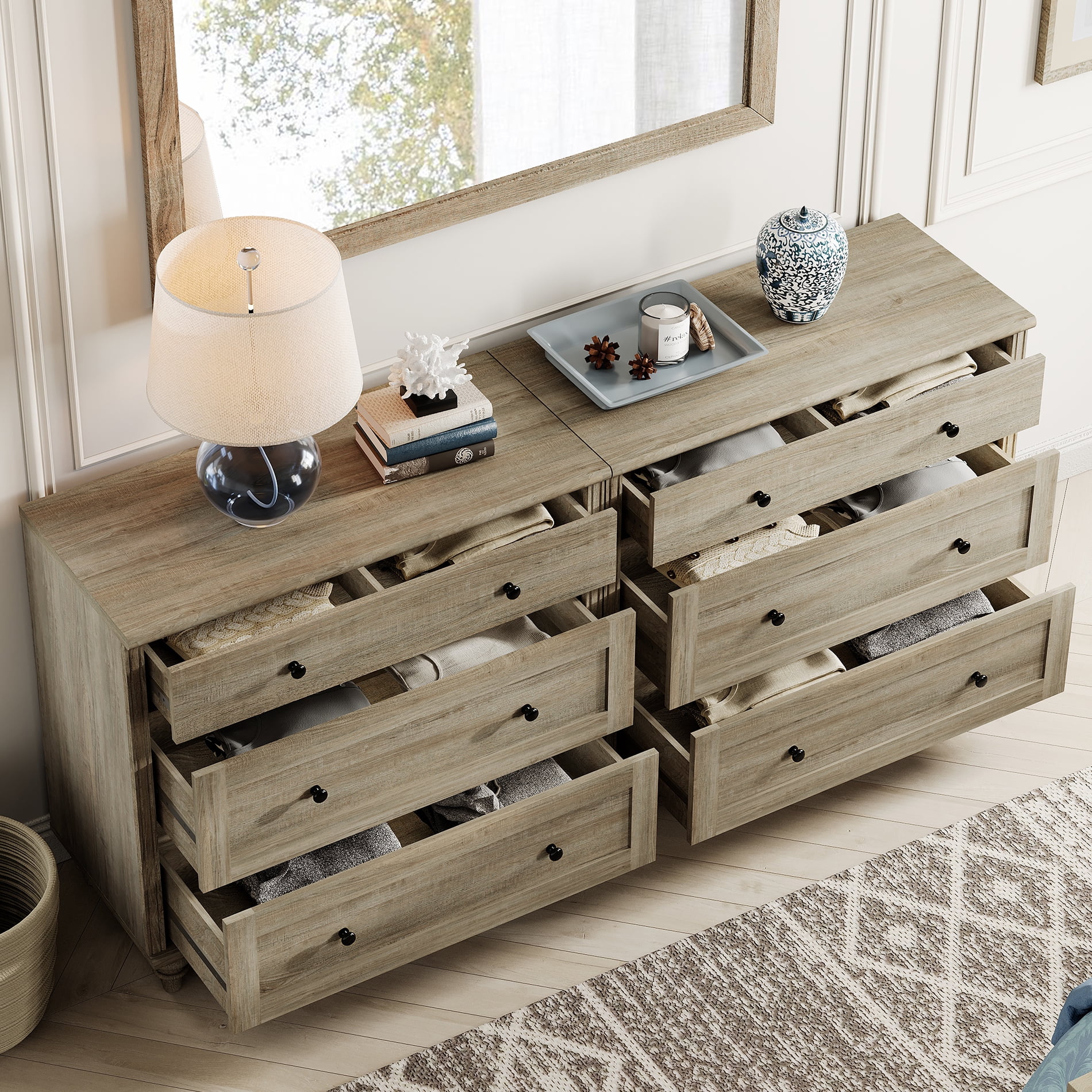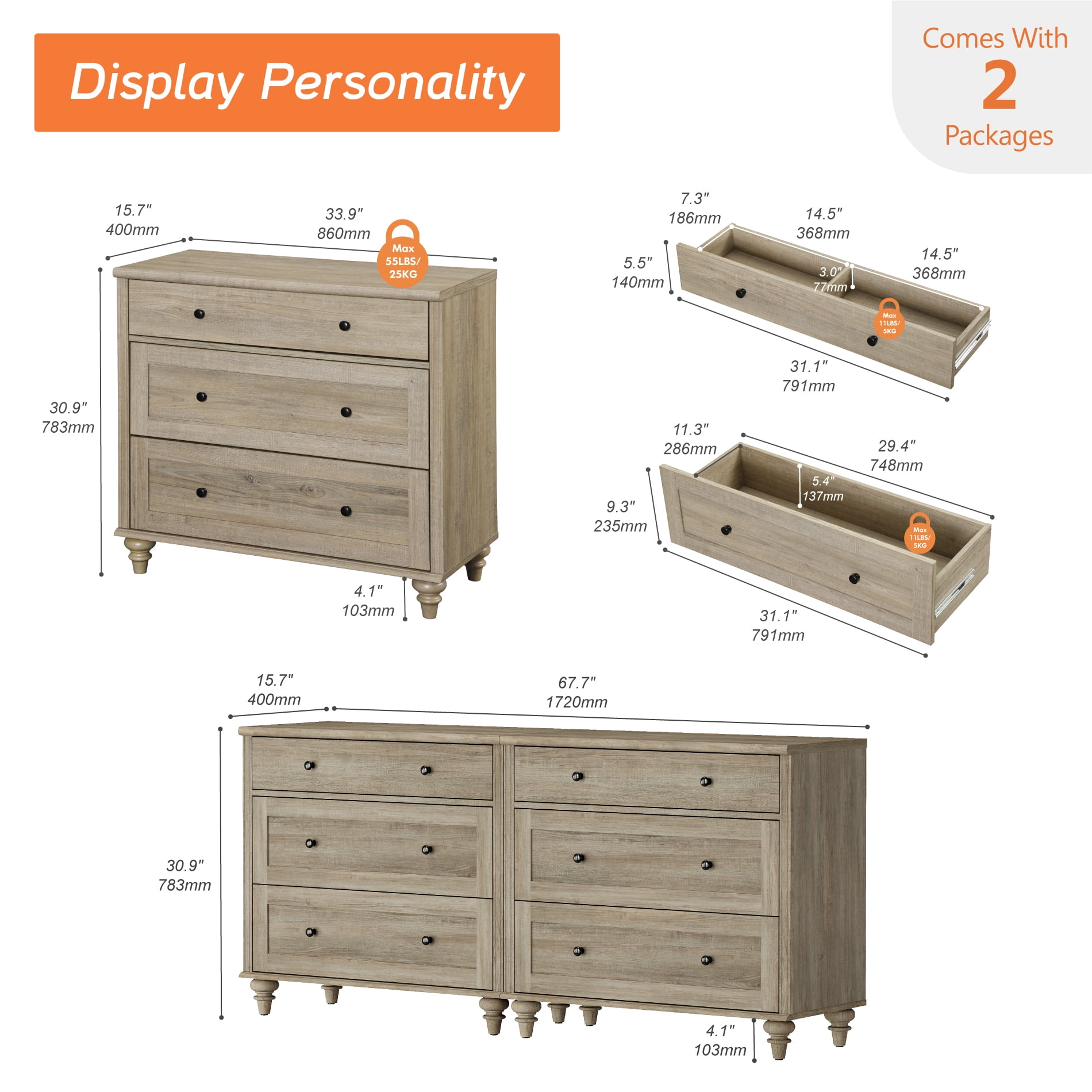 【Convenience & Versatility】This set of 2 end tables with a distressed surface is not only classic and elegant, but also versatile. It can easily blend with any decor and can be used as a kid’s dresser, storage cabinet, or console table. It’s perfect for the bedroom, hallway, living room, kid’s room, office, and more. The overall dimensions are 33.9”L×15.7”W×30.9”H. 【Ample Storage Space】With 3 deep drawers, this gray end table provides great storage for your clothes, blankets, and more. It maximizes vertical storage space, keeping your daily essentials and decorations organized. 【Premium Material & Easy to Clean】This chest of drawers is made with high-quality P2 MDF material and a distressed surface, ensuring sturdy construction and a long lifespan. The smooth, waterproof surface of the end table makes it easy to clean with a soft, damp cloth, making your daily cleaning tasks easier. 【Quick Assembly & 2 Packages】This end table set is shipped in 2 packages, which may arrive at different times. It comes with pre-assembled drawer glides for easy assembly. The drawers of the dresser are equipped with smooth metal slides and handles, making them easy to open and close.