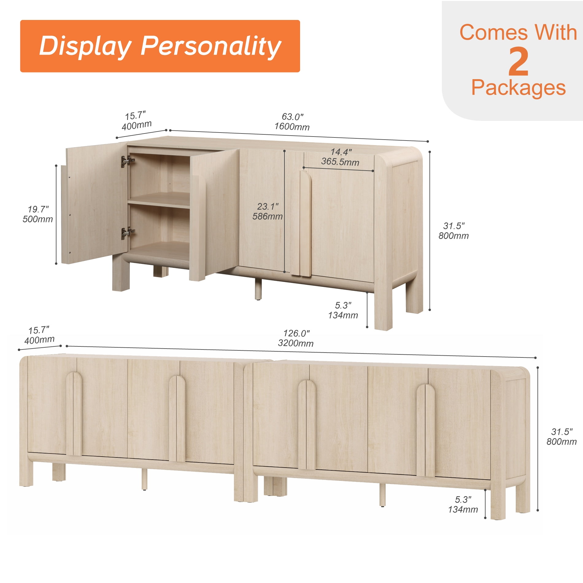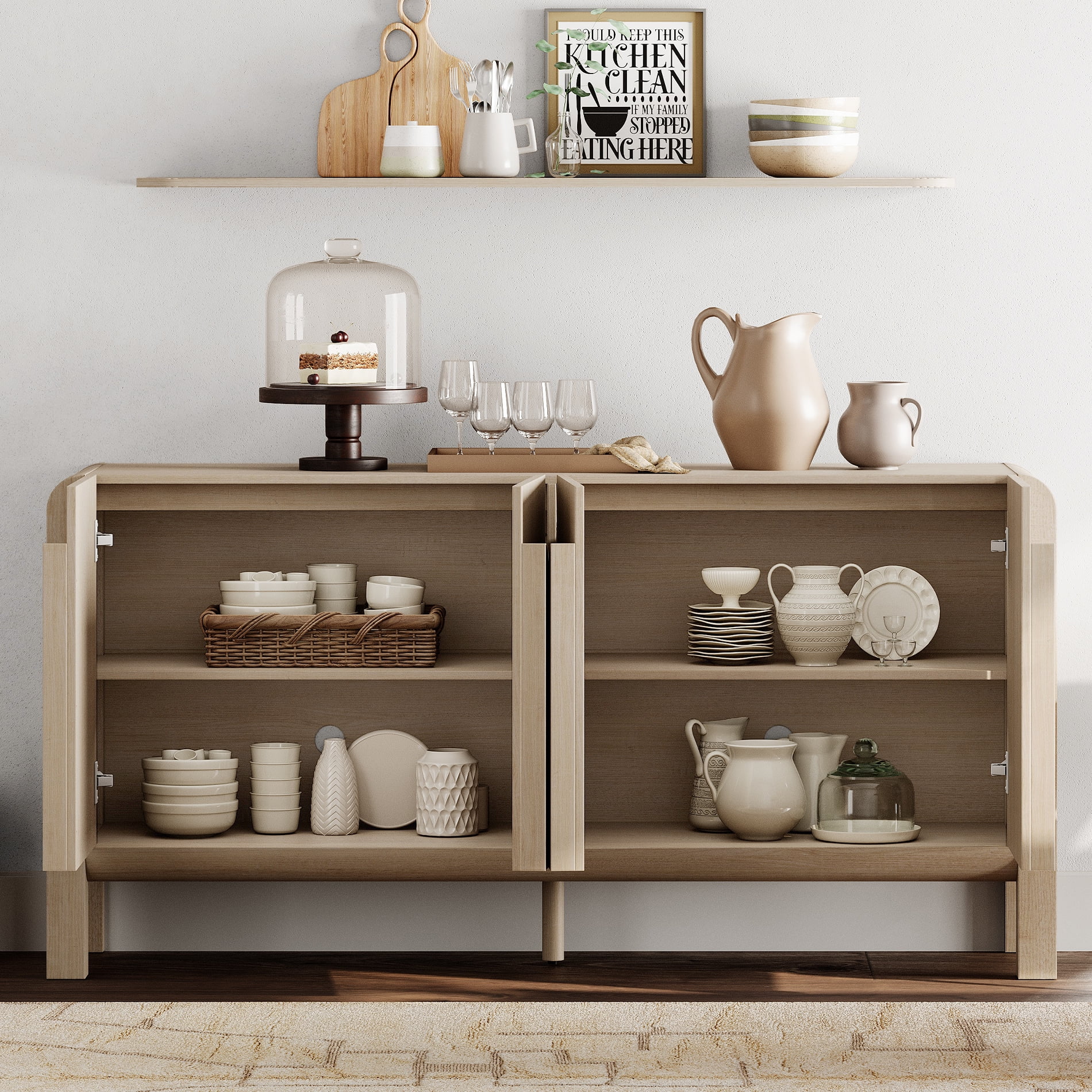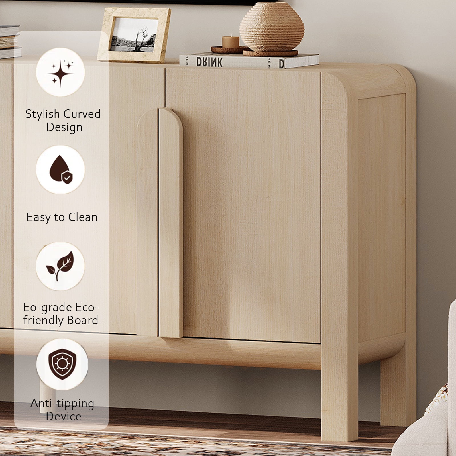 French Style Design: Our mid-century buffet table set of 2 features a unique curved profile design and vertical handles that seamlessly blends elegant lines with a smooth, textured surface, enhancing visual appeal and modern aesthetics. The elevated legs make it easy for your robotic vacuum to clean underneath, keeping your rooms looking pristine and fresh. Spacious Storage: This wood cabinet set features four doors, adjustable and wide tabletop, providing ample storage space for a variety of items like dinnerware, glassware, books, and other items. Perfect for organizing your kitchen, living room, or dinning room. Stable and Sturdy: Constructed from optimal sturdy P2-grade MDF and solid wood legs. The top can hold up to 120lbs and the drawers can hold up to 30lbs. The high-quality finish ensures that the kitchen buffet cabinet is easy to clean and resistant to daily wear and tear, extending its lifespan.The inclusion of an anti-tip device ensures stability and safety, further adding warmth and peace of mind to your home.