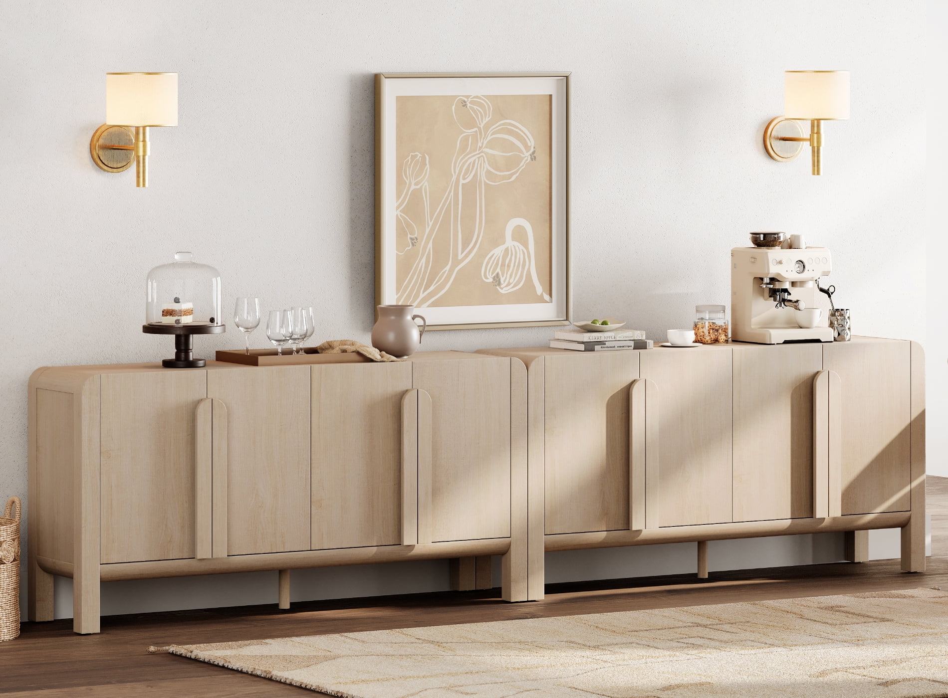 Elevate your dinner parties with the chic Modern 126″ Sideboards Cabinet Set. Its classic soft finish on the painted MDF and real wood legs seamlessly complements your existing décor, while vertical pulls and a waterfall design add a touch of sophistication. The wide and long surface, combined with adjustable interior shelves and convenient cable management, offers ample and flexible storage options. Its water-resistant and scratch-proof surface ensures durability, and high legs allow robotic vacuums to pass underneath with ease. Designed for everyday use, this buffet cabinet set combines elegance with practicality, ensuring your home is always ready for guests.
