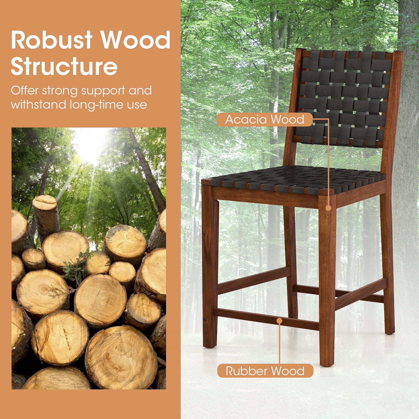 Introducing our set of two counter height bar stools, meticulously crafted to blend comfort, style, and durability. Each stool features a generously sized seat and a thoughtfully designed backrest to ensure a comfortable sitting experience, ideal for long dinners or conversations around the kitchen island. The unique PU leather woven seat not only adds a distinctive touch to these stools but also ensures breathability and ease of maintenance. Constructed from high-quality acacia and rubber wood, these stools are built to last and complement any indoor setting with their elegance and robust structure. Key Features: Comfortable Design: Enjoy superior comfort with a seat dimension of 20.5″ x 18.5″ (L x W), featuring a curved backrest with a 100-degree incline that contours to your body, and a convenient footrest for relaxed seating. PU Leather Woven Seat: Experience the unique blend of style and functionality with the well-woven PU leather straps, offering tight connection, high resilience, and excellent air ventilation. The water-resistant nature of PU leather simplifies cleaning and maintenance. Robust Wood Structure: Crafted from select acacia wood and rubber wood, known for their natural beauty and durability. These materials ensure a strong, supportive, and long-lasting frame, free from burrs for a smooth finish. Versatile Indoor Use: With their elegant appearance and comfortable seating, these bar stools are perfectly suited for a variety of indoor spaces, including kitchens, dining rooms, and restaurants. Anti-slip footpads are included to protect your floors from scratches. Easy Assembly: Assembly is made easy with clear, detailed instructions, allowing for quick and efficient setup. Designed with a seat height of 24 inches, these stools are compatible with counter heights ranging from 34 to 39 inches. Elevate your indoor seating with these stylish and comfortable acacia wood bar stools. Whether you’re enjoying a meal, working from home, or hosting guests, these stools provide a cozy and attractive seating option that enhances the ambiance of your space.