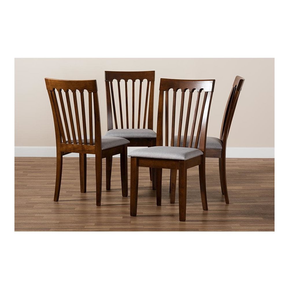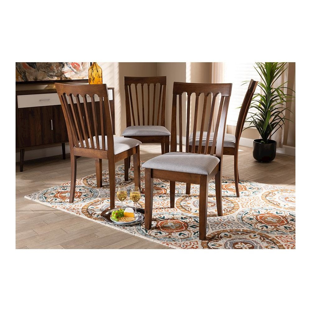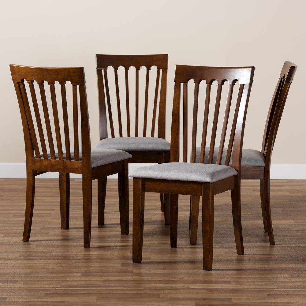 Modern and contemporary set includes four (4) dining chairs Constructed from rubberwood Walnut brown finish Upholstered in polyester fabric and padded with foam Cut-out back design Assembly required Made in Malaysia