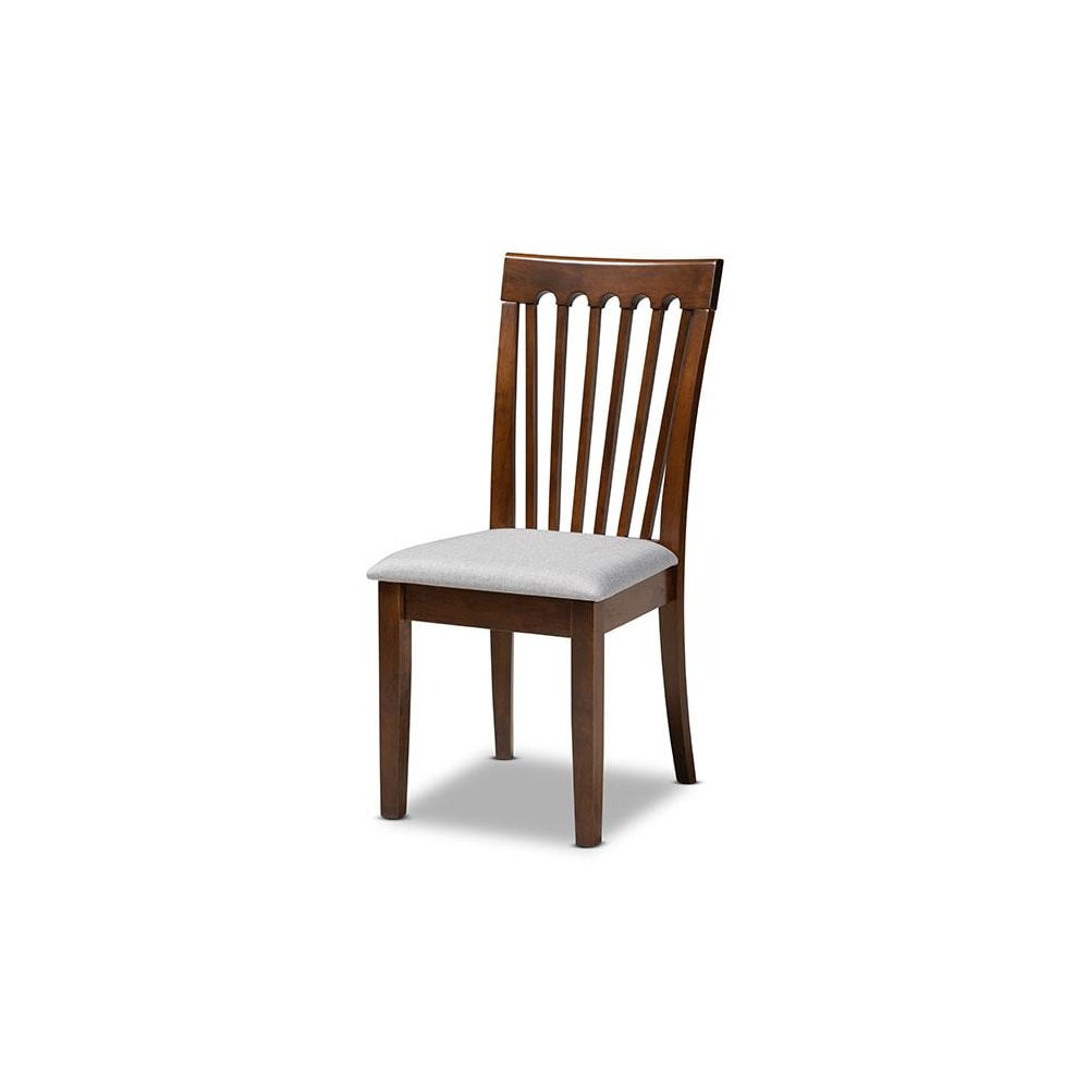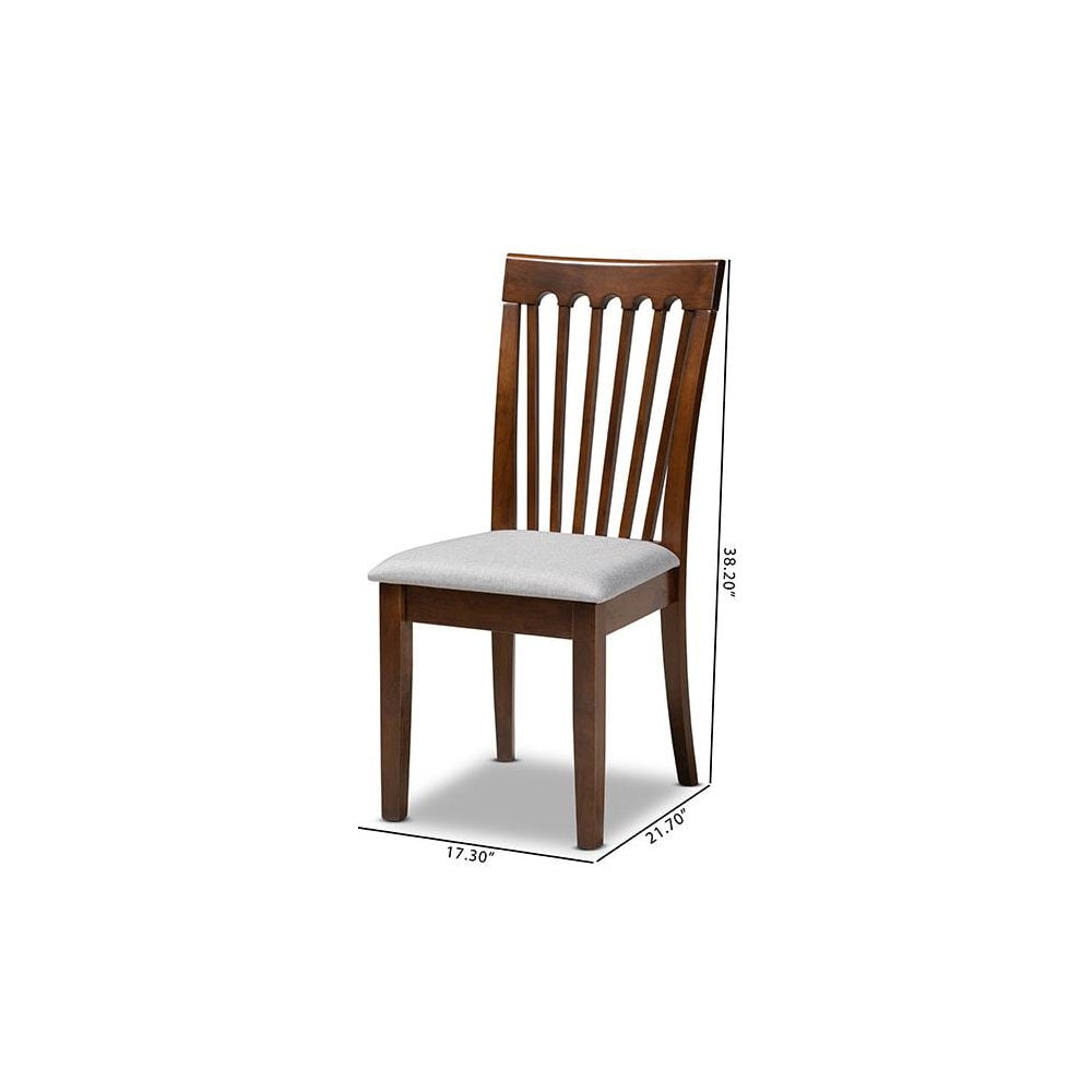 Timeless design is merged with modern comfort in the Minette dining chair. This solid rubberwood chair features a warm walnut brown finish that complements the light polyester fabric upholstery. An optimal balance of comfort and style, the Minette features a plush foam-padded seat, as well as a striking cut-out design on its back for enhanced visual appeal. Whether used for chic dinner parties or casual family dinners, the Minette chair is sure to elevate any dining experience. The Minette dining chair is made in Malaysia and requires assembly. Features: Modern and contemporary set includes four (4) dining chairs Constructed from rubberwood Walnut brown finish Upholstered in polyester fabric and padded with foam Cut-out back design Assembly required Made in Malaysia Specifications: Product Dimensions: Dimensions: 38.19″ high x 17.32″ wide x 21.65″ deep; Seating dimensions: 18.5″ wide x 16.14″ deep x 18.5″ high (from Floor); Legs: 16.93″ high; Product Weight: 15.43 lbs Upholstery Material: Fabric “100% Polyester”