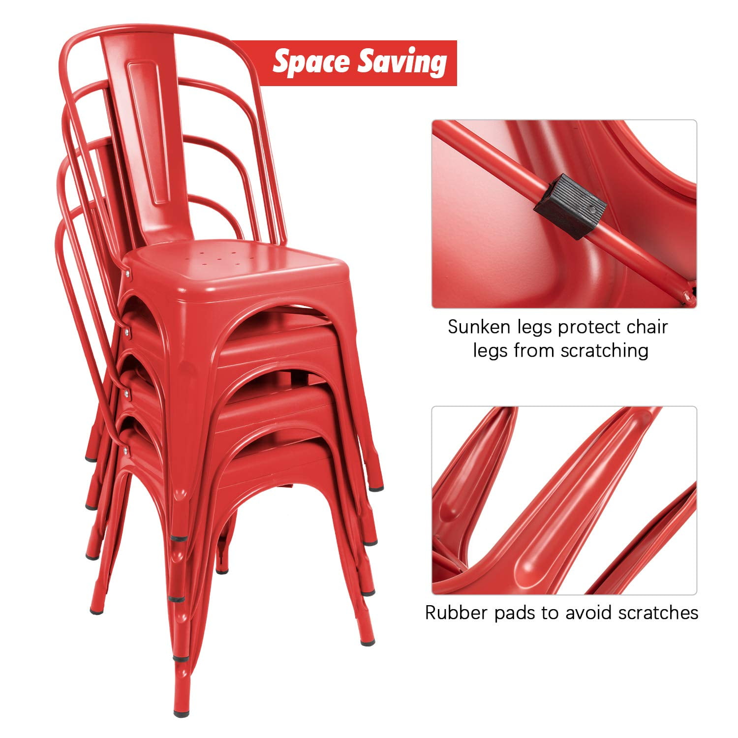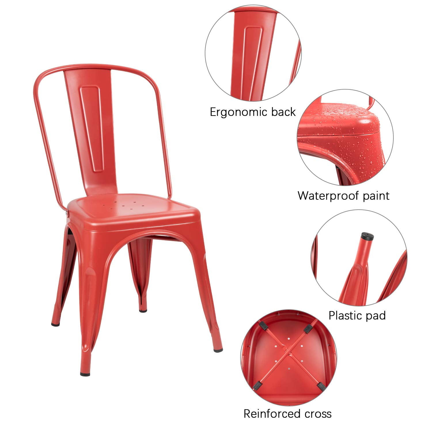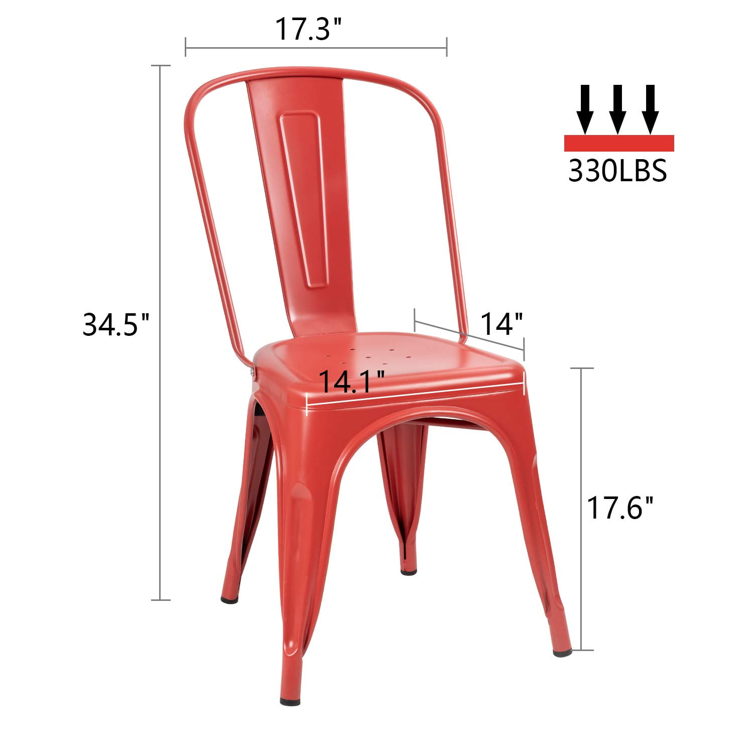 Product Description: Stylish modern metal chairs ideal for kitchen, dorm, shop & bar. Stackable chairs for convenient storage & space saving use. Each Lightweight but sturdy stool weighs 12lbs, while with 330 lbs weight capacity. X-brace support under the seat provides additional stability & durability. Non-mar rubber feet prevent from sliding and scratching floors. Durable scratch-resistant finish. Heavy duty metal construction. Each metal bar stools 18” tall, seat size 14 x 14” (LxW) Made with holes on the seat to allow water to drain after the rain. Specification: Material:Iron. Seat Height: 18”. Set Dimension: 14” x 14”(L x W). Overall Dimension: 17*17*33.5(L x W x H). G.W.: 21.6Kg/47.62Lb. Weight Capacity: 150 Kg / 330 Lb. Quantity: 4x metal chairs. Features & details: Best home and restaurant chairs. All-around bistro,patio,café and restaurants chairs. Scratch and mar resistant steel with excellent polish finish. Assembly Required,Each metal chair has a X-brace under the seat that provides additional support and stability. Stackable for Space Saving,No-mar rubber feet keep them from sliding and scratching hardwood floors. Great for Indoor and outdoor use, double varnish painted water-resistant and rust-resistant.