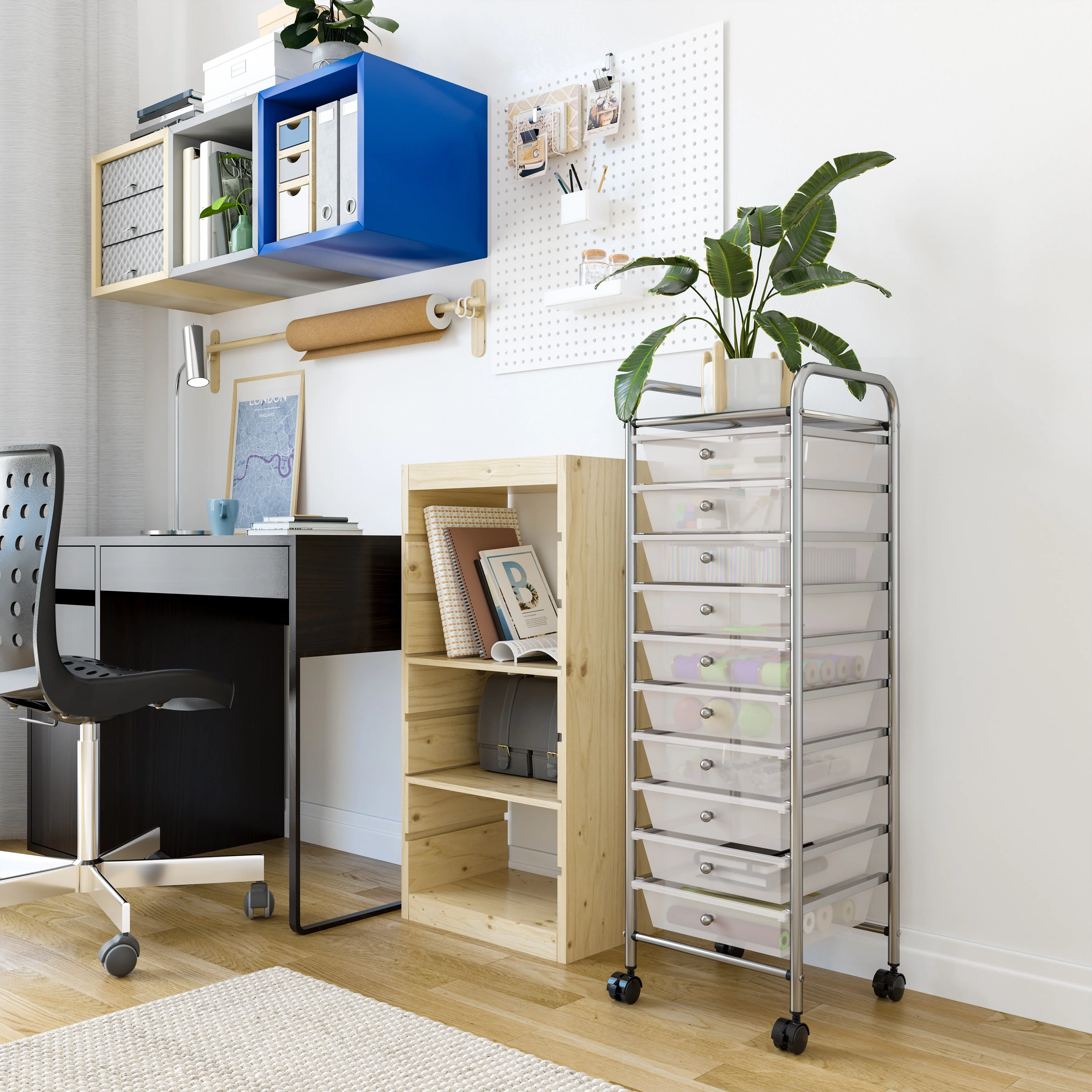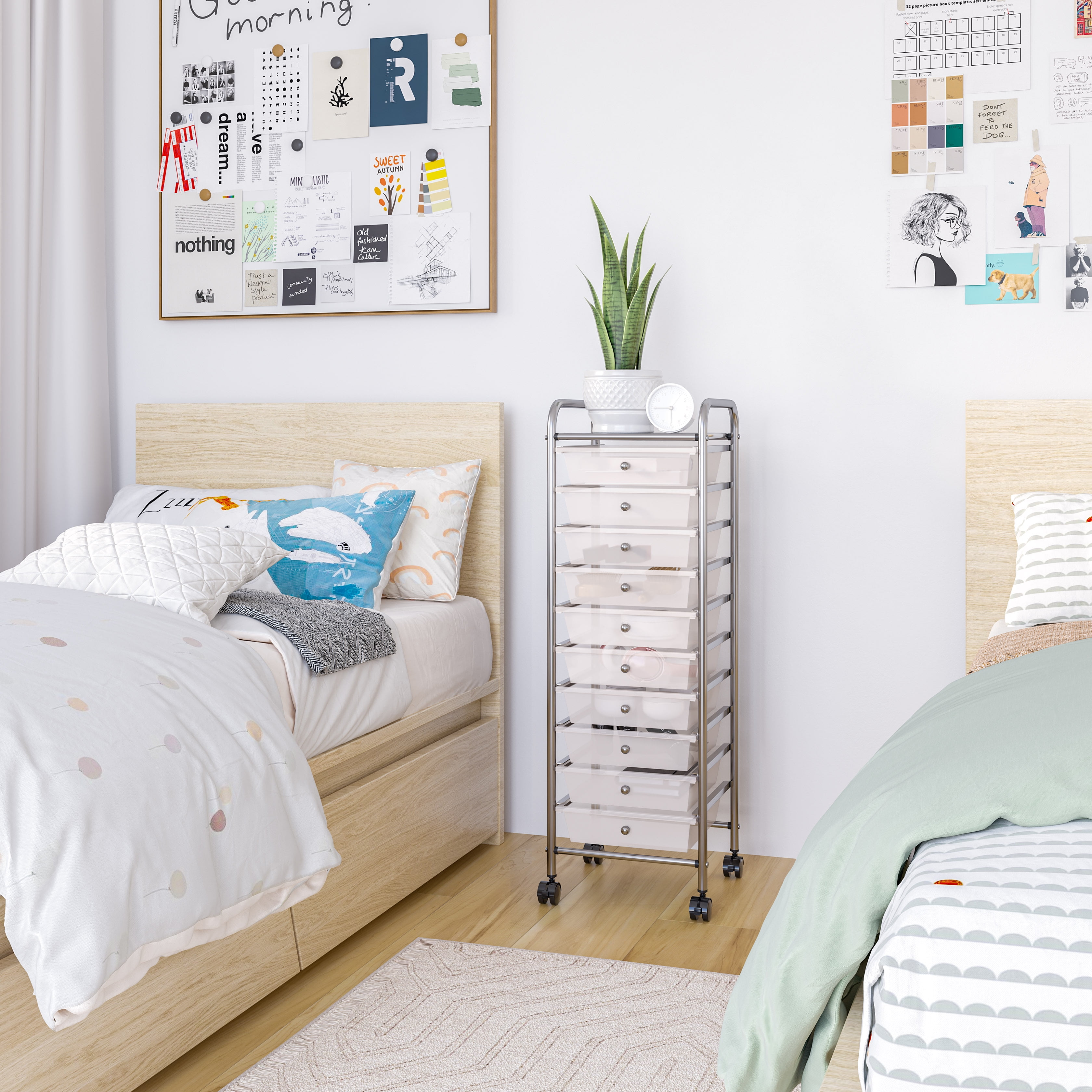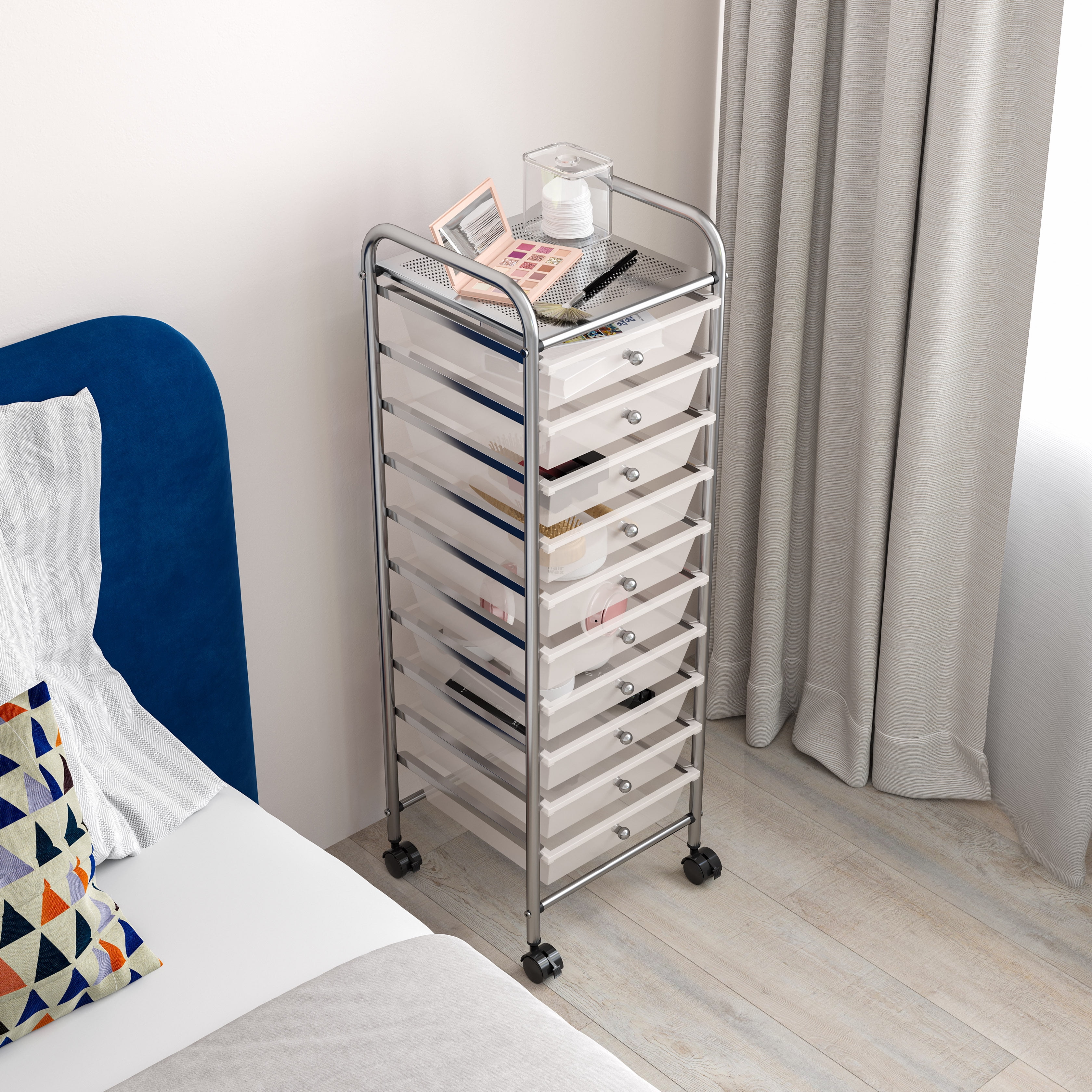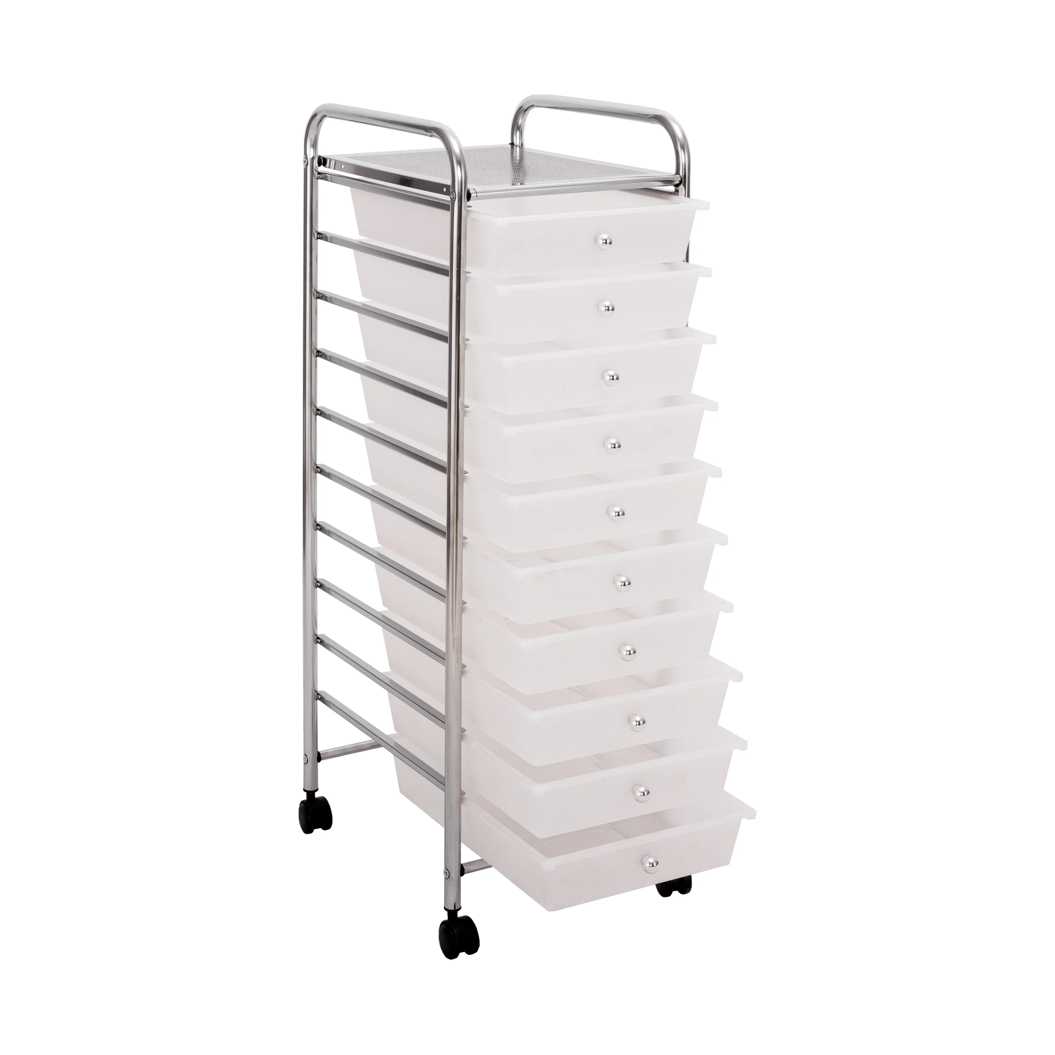 PURE ORGANIZATION – 10 drawers provide plenty of space for keeping your home office supplies tidy and close, organizing makeup and cosmetics, storing arts and crafts supplies, and arranging tools for use in the garage ORGANIZER DIMENSIONS – 15.5″ W x 15.4″ D x 38.2″ H; inner drawer dimensions: 12.5″ W x 14.0″ D x 2.5″ H TRANSLUCENT FINISH – Semi-transparent polypropylene drawers in frosted white allow you to determine if a drawer is empty at a glance REMOVABLE DRAWERS – Easy to install and easy to remove, the drawers slide unattached through metal channels. Take your stuff with you when you need it MOBILE STORAGE SOLUTION – Four casters (two locking) allow the cart to go where you need; tall handles make it easy to push and pull