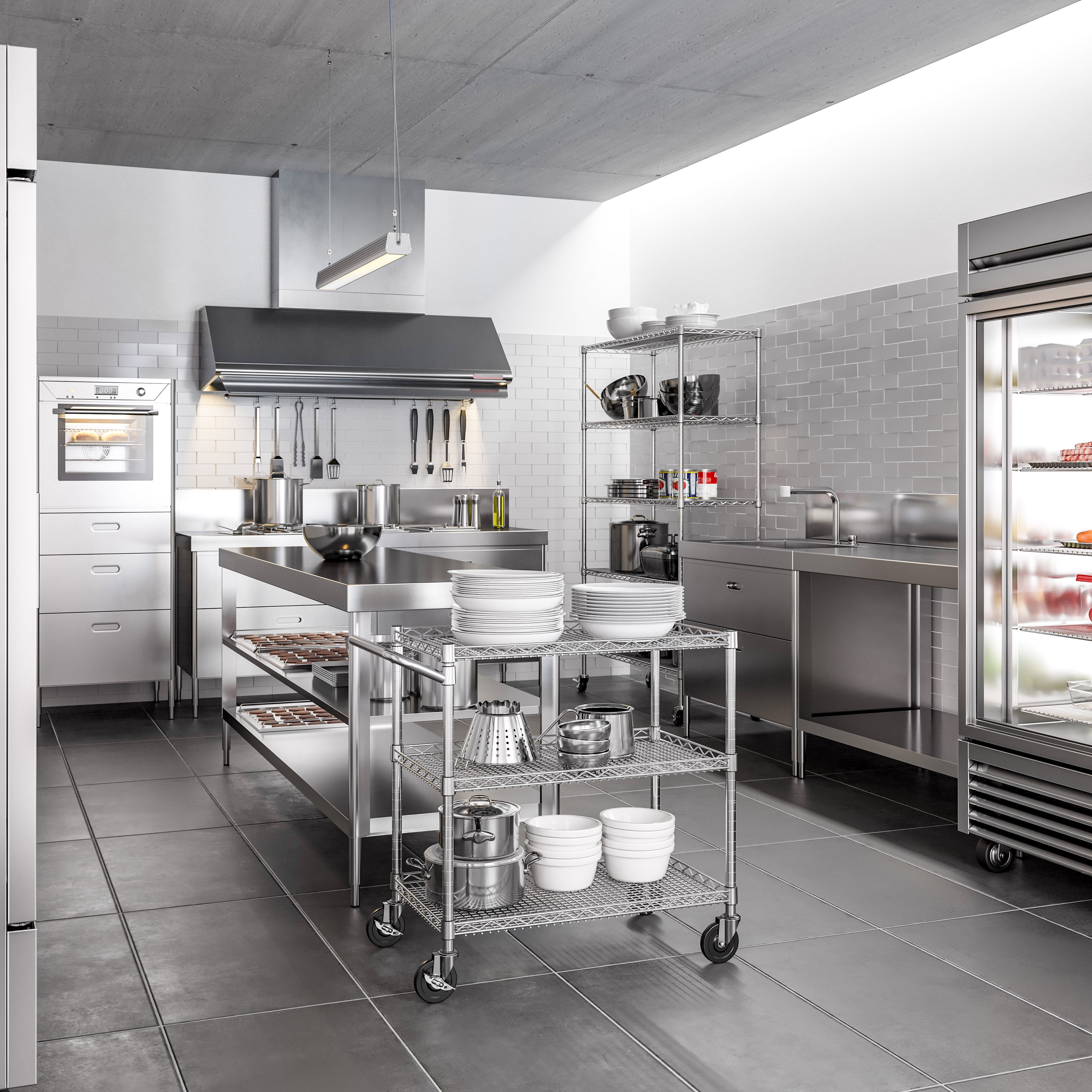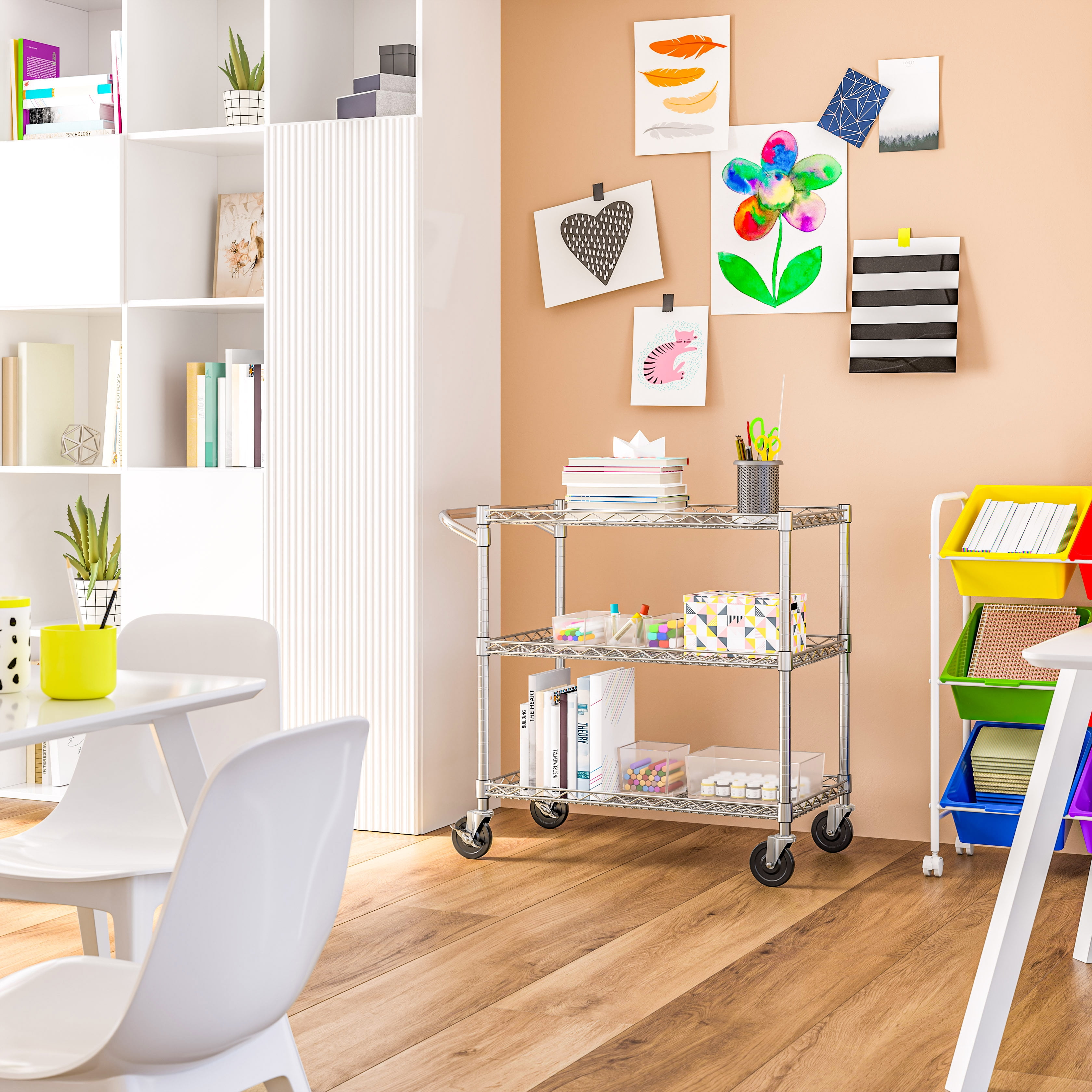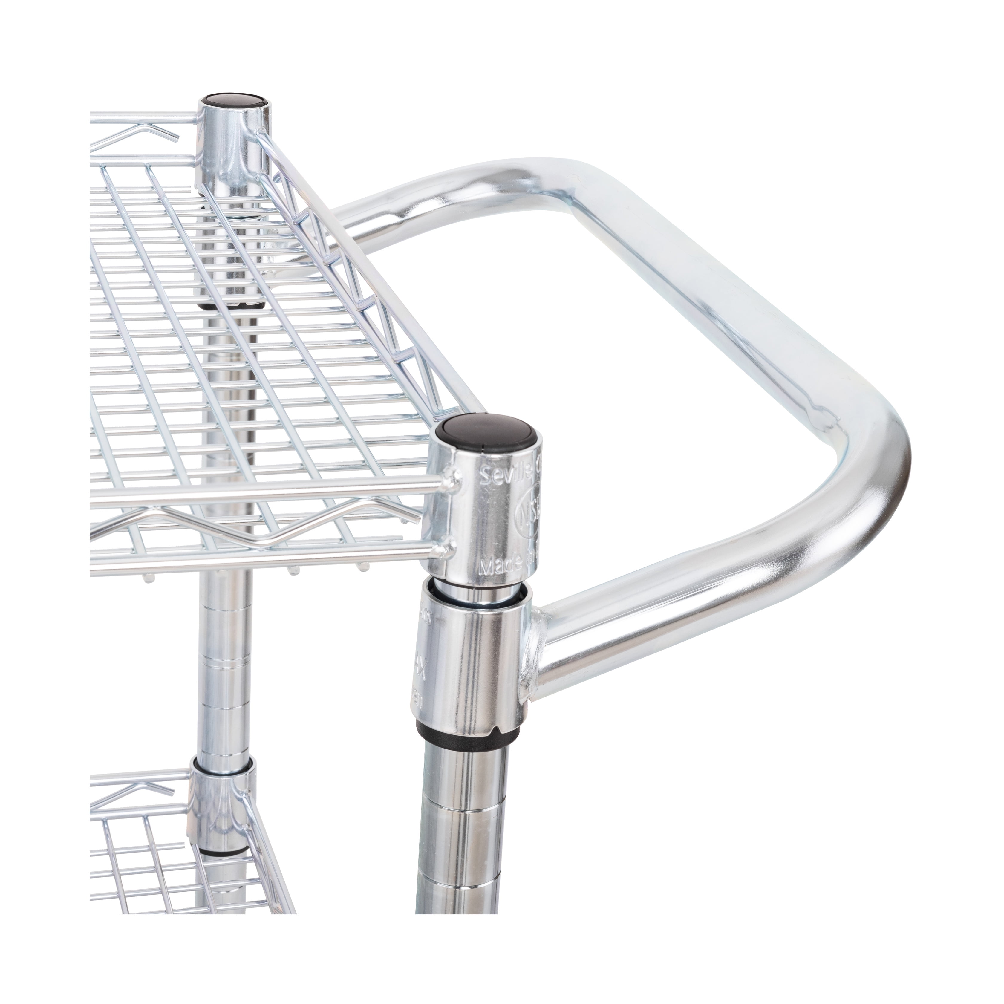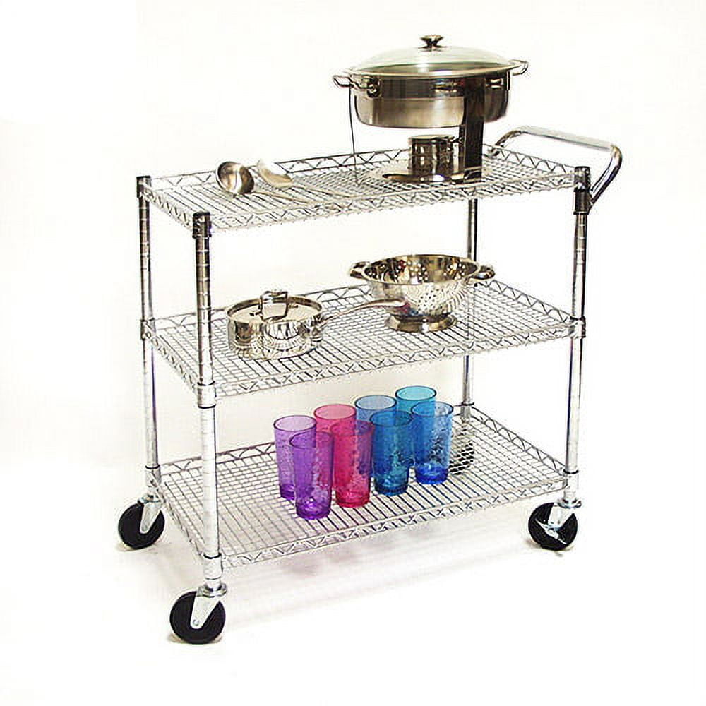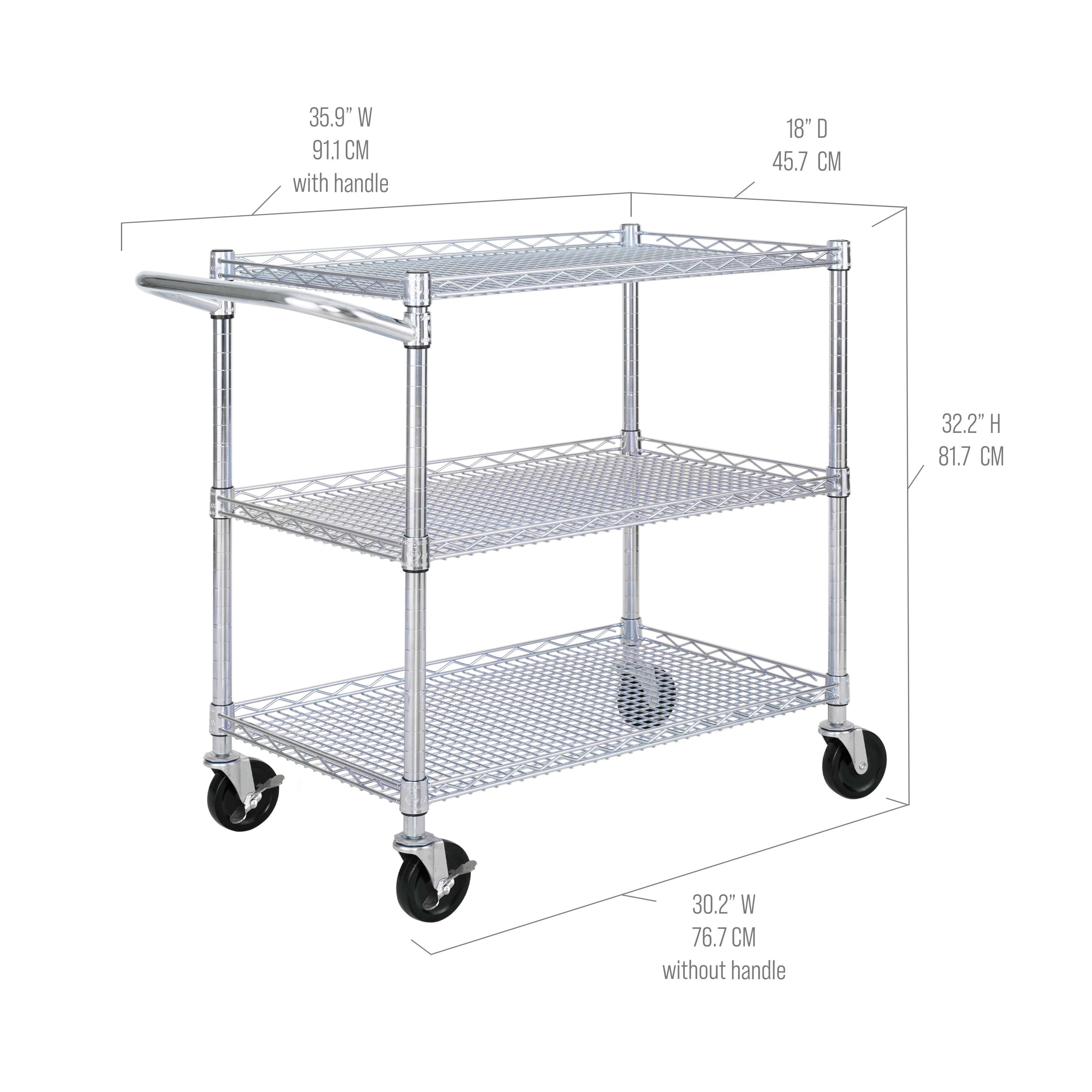 DIMENSIONS – 35.9” W (30.25” W – without handle) x 18” D x 32.2” H (without handle) 3 ADJUSTABLE SHELVES – three wire shelves (interior dimensions: 27.7” W x 15.4” D x 1” H), height adjustable at 1” increments. HEAVY-DUTY DURABILITY – This 3-tier cart is constructed from a commercial-grade steel frame to ensure long-lasting use and finished with zinc plating. MOBILE DESIGN – Equipped with four sturdy 4” diameter swivel wheels (two locking). NSF CERTIFIED – Utility cart is NSF-certified for commercial use. WEIGHT CAPACITY – 500 lb. total weight capacity, evenly distributed.