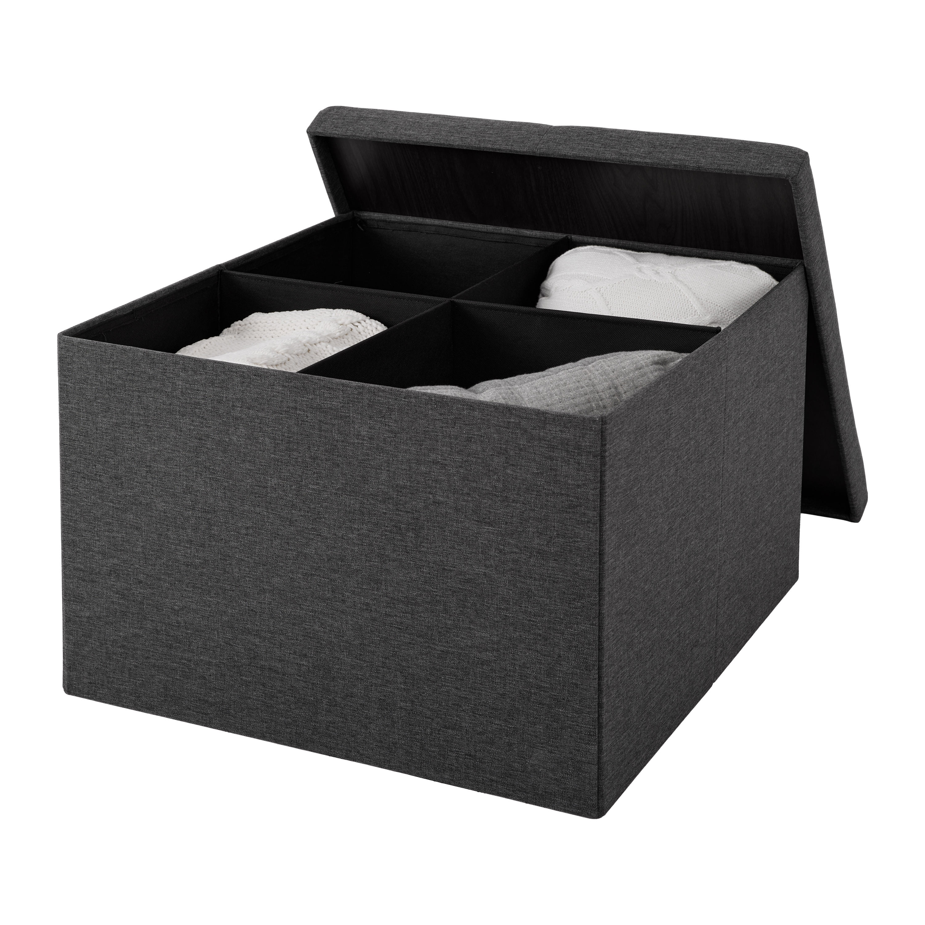 DIMENSIONS – Overall dimensions are 25” W x 25″ D x 18″ H. ELEGANT DESIGN – Upscale modern grey upholstered fabric with tufted cushion top adds style to your living room, entryway, office, study, or dorm. REVERSABLE LID TABLE TRAY – The underside of the lid has a solid laminated tray surface (24” x 24” x 1” deep). WEIGHT CAPACITY – Supports sitting up to 500 lbs. on the lid and up to 50 lbs. for the interior base. STURDY BUILD – Featuring a modern grey fabric with premium cushioned foam in the lid supported by a solid MDF frame. INTERIOR STORAGE – Under the cushioned top is a large compartment with a 4-piece removable divider for neatly organizing blankets, magazines, books, remote controls, toys, clothing, and shoes. FOLDABLE OTTOMAN – Ottoman can fold away easily for compact storage in closets, and under beds, when not in use.