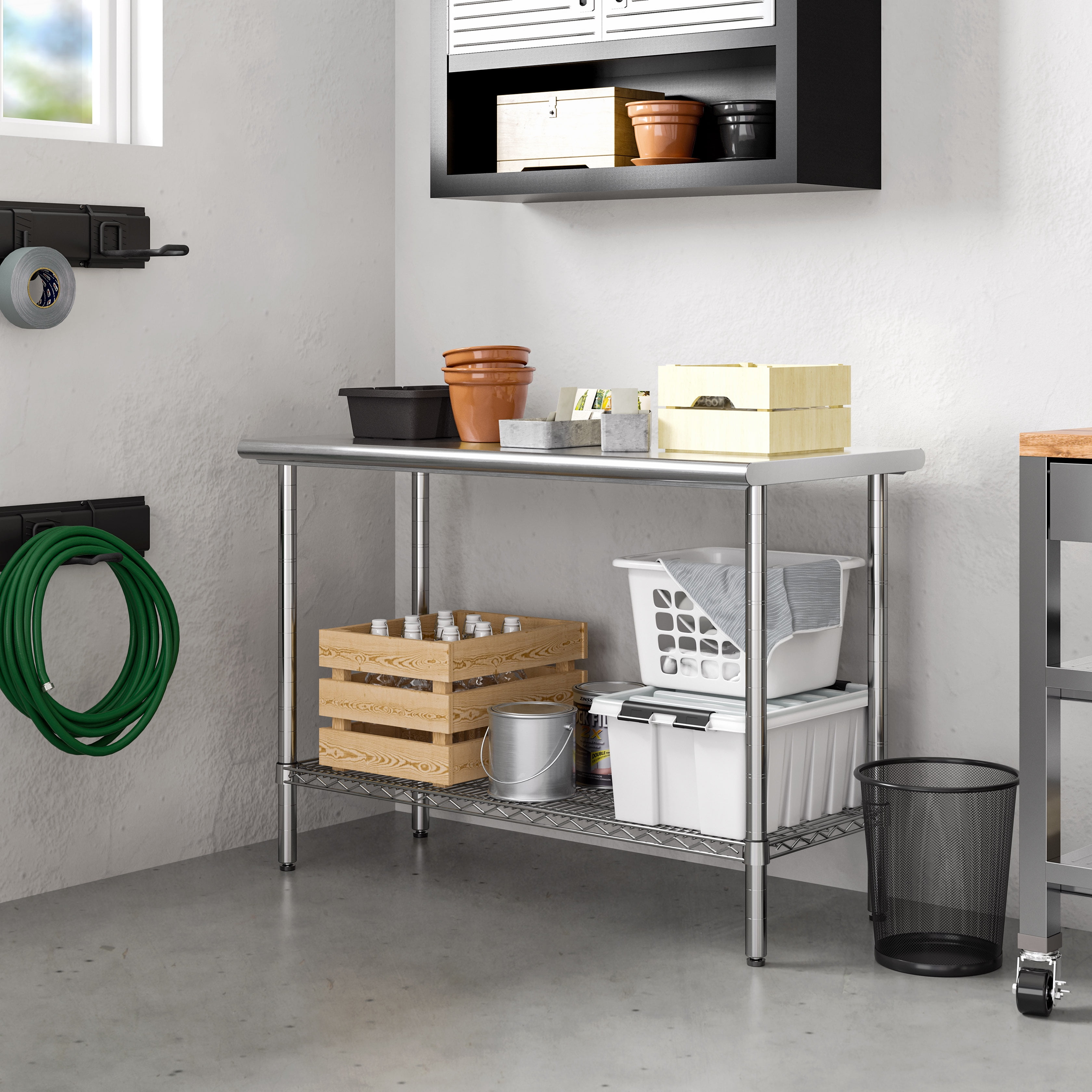 Seville Classics Stainless Steel Top Worktable NSF Work on a durable, reliable surface for any task with Seville Classics’ Stainless Steel Top Worktable NSF. Certified to be used in commercial kitchens and works well in residential settings. Expand your storage space with commercial-quality materials that give your space a polished look. Store items at your desired height on the adjustable steel wire shelf. The worktable is ideal for laundry rooms, offices, commercial kitchens, garages, workshops, warehouses, and more.