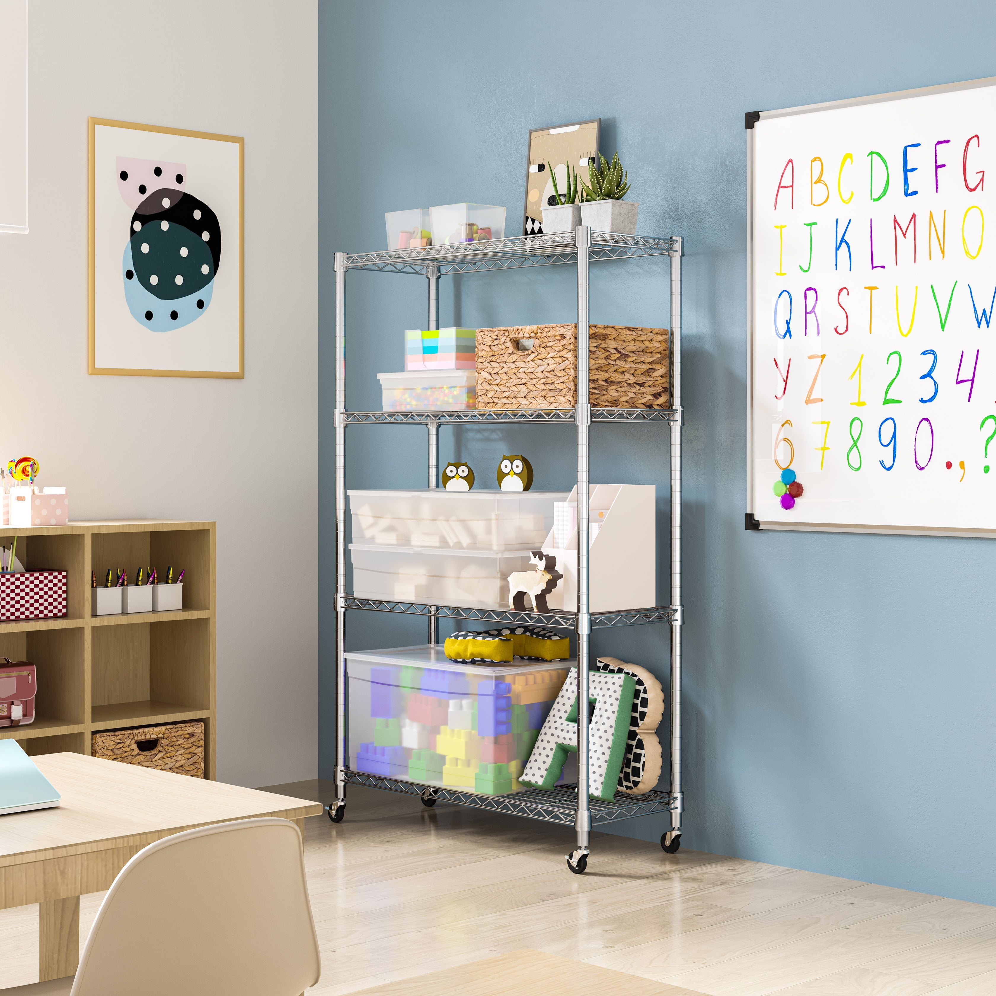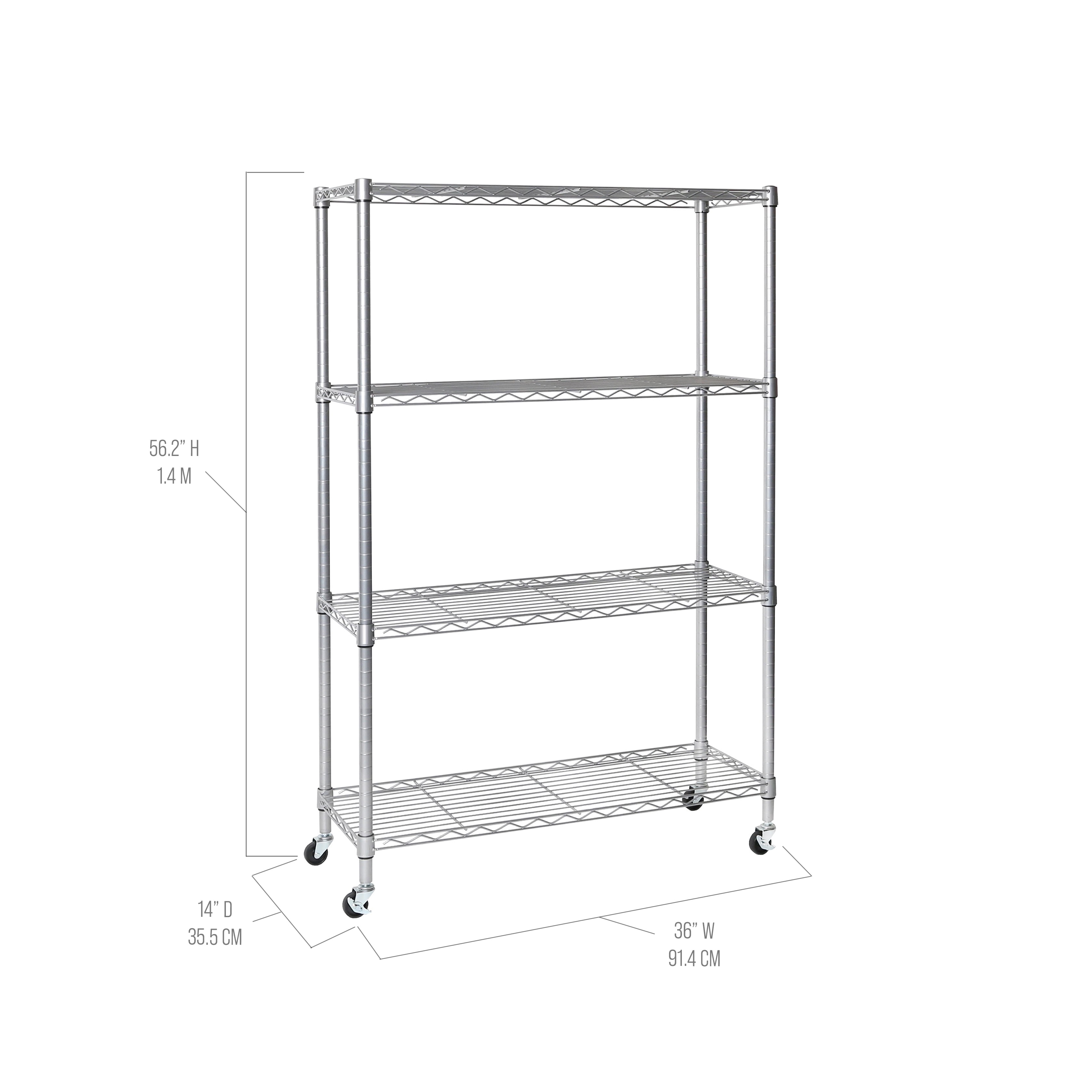 Store more at home or at the office with the Seville Classics 4-Tier Steel Wire Shelving System. This multipurpose shelving unit is ideal for use around the home, garage and office. Units are built with commercial-grade steel and finished in plated chrome for added durability and resistance to corrosion in dry storage environments. The system features wide (36″ x 14″) shelves engineered from heavy-duty steel wire for strength and low weight. The shelves attach to 1″ thick poles with clip-on, slip sleeves and can be adjusted at 1″ height increments. This model includes wheels and leveling feet for mobility and stability when you need it. Durable and Strong Each tier holds up to 300 lbs. in units assembled with leveling feet for a total weight capacity of 1200 lbs. evenly distributed. Assemble the unit with the included 2″ caster wheels for added mobility and a weight capacity of 330 lbs for the whole unit. Wheels feature steel hardware and include two that lock for stability when you need it. The system stands approximately 54″ tall on leveling feet and 56.5″ tall on wheels. This unit is designed for heavy-duty commercial-grade use and has been certified by the NSF to NSF/ANSI 2, the food equipment standard for dry storage and heated environments. Our shelves are engineered for professional use in restaurants and food service industry while being easy to use in your home. Convenient and Flexible This metal shelving is designed to be freestanding with multipurpose use and utility in mind. The chrome plated finish is perfect for blending in with home décor and makes an excellent indoor decorative storage unit for plants, appliances, boxes, bulk goods and more. Organize your garage, pantry or basement with these easy to assemble shelves. Cleaning the shelves are easy. Assembly is easy to complete alone, but faster with a friend. No tools required for assembly. Make the most of your space with Seville Classics. Shelves measure 14″ D x 36″ W Industrial-strength steel wire construction for multipurpose storage Chrome plating provides necessary corrosion resistance in dry environments NSF certified for commercial, residential and office environments Wheels allow for easy positioning in the kitchen, garage, or office Shelves adjust at 1″ increments Includes 4 wheels (with 2 locking) and leveling feet No tools required for assembly Limited 10 year warranty