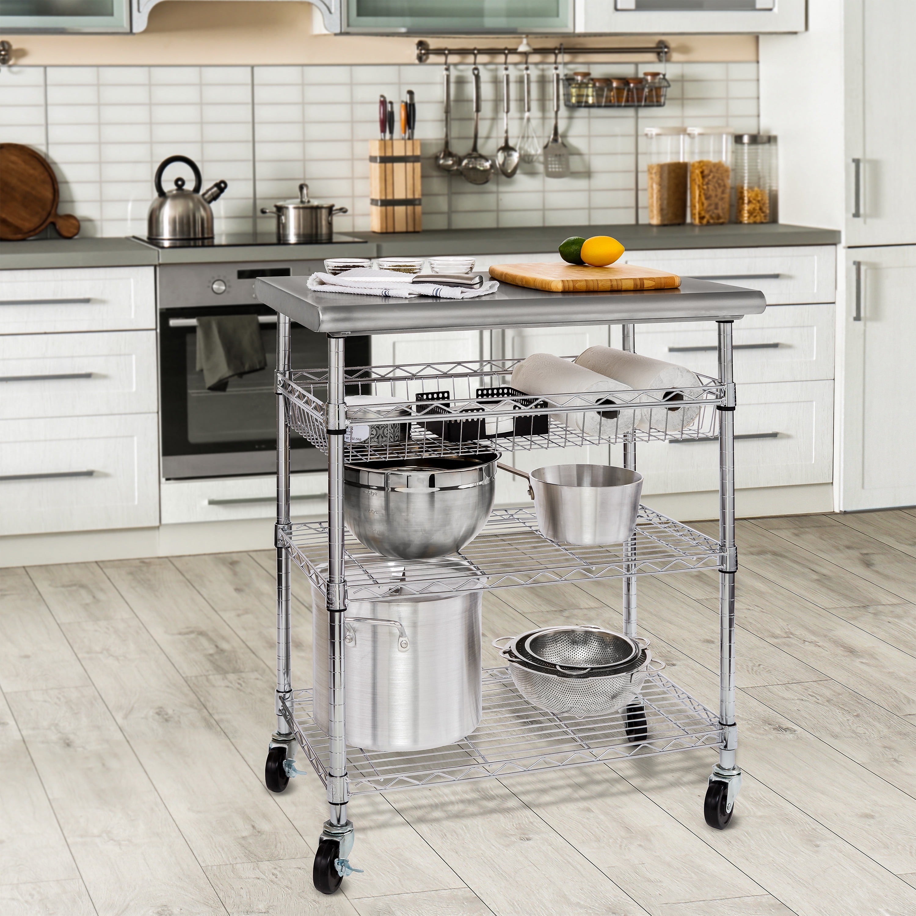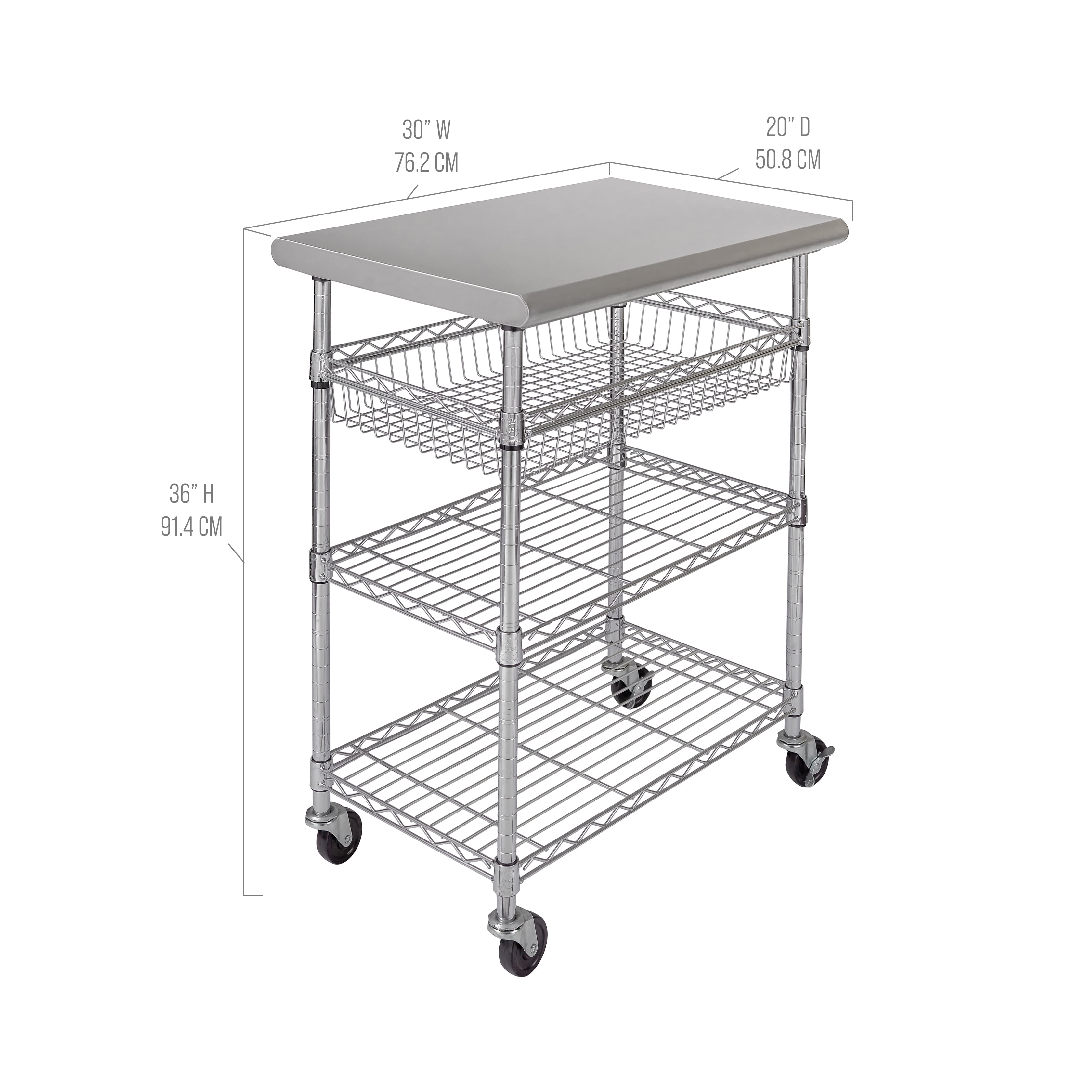 Seville Classics Stainless-Steel Utility Cart NSF, 30″ W x 20″ D x 36″ H This versatile stainless-steel cart features heavy-duty commercial grade construction. The brushed finished bullnose stainless-steel top measures 20” x 30” x 1.5” thick. The two wire shelves and one wire basket are height adjustable in 1” increments in chrome plated for a durable finish. The cart is NSF certified for use in commercial restaurants, home, and office environments. Includes smooth-rolling 3″ diameter rubber swivel wheels (2 locking) for easy positioning. The cart can hold up to 475 lbs. evenly distributed (250 lbs. stainless steel top, 74.9 lbs. basket, 74.9 lbs. per shelf). No tools required for assembly.