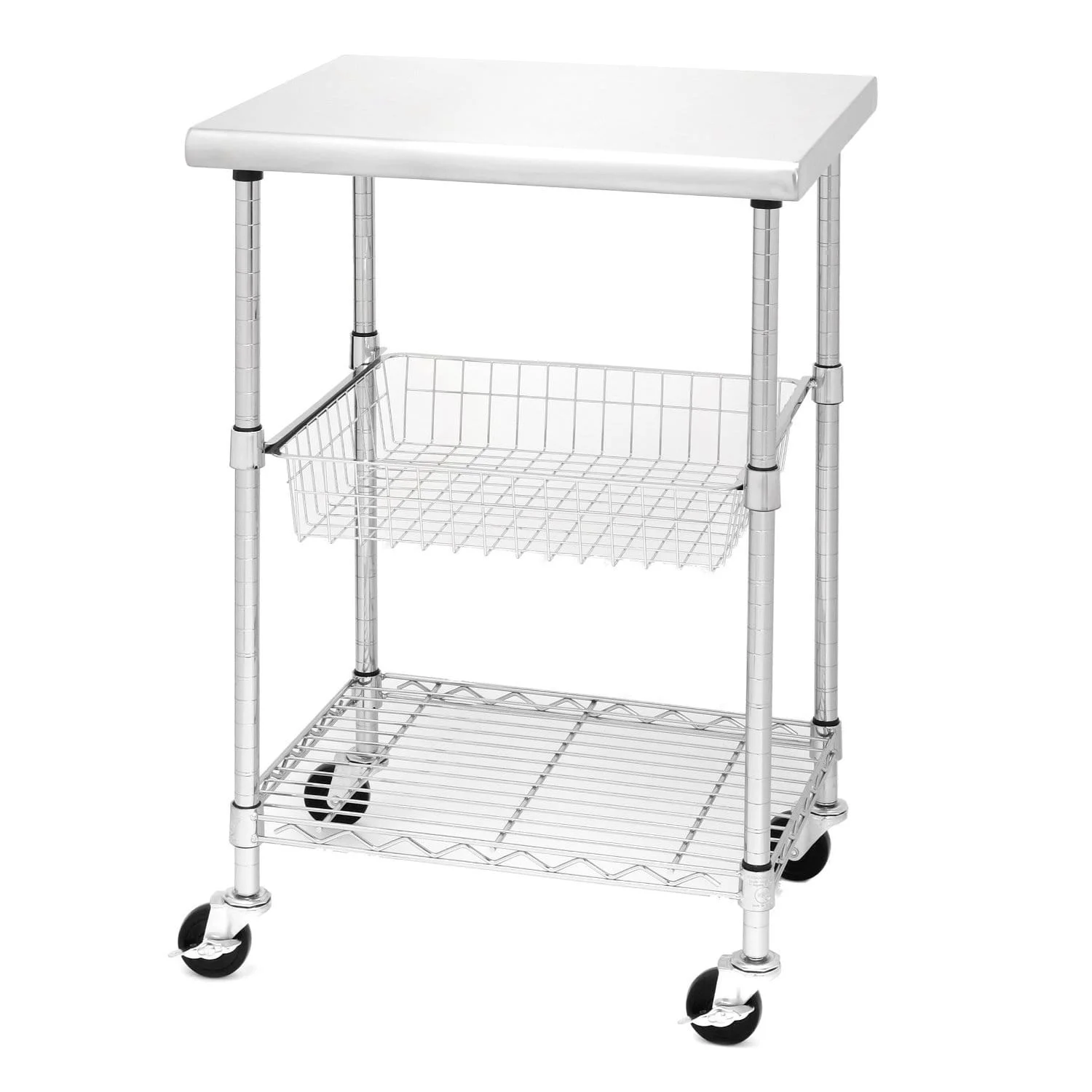 DIMENSIONS – 24″ W x 20″ D x 36″ H SLIDING WIRE BASKET AND SHELF – Includes a pull-out storage basket (18.25″ x 14.5″ x 4″ H) and steel wire shelf (24″ x 20″) both height adjustable at 1″ increments. GRADE 443 STAINLESS STEEL – Table top (24″ x 20″ x 1.5″ thick) features solid, grade 443 stainless-steel construction with a brushed finish and bullnose front and rear sides. BONUS 3″ WHEELS – Includes smooth-rolling 3″ diameter rubber swivel wheels (2 locking) for easy positioning in your garage, office, warehouse, workshop or home. NSF-CERTIFIED STORAGE – Certified by the NSF to NSF/ANSI Standard 2 – Food Equipment for use in dry and heated storage environments.