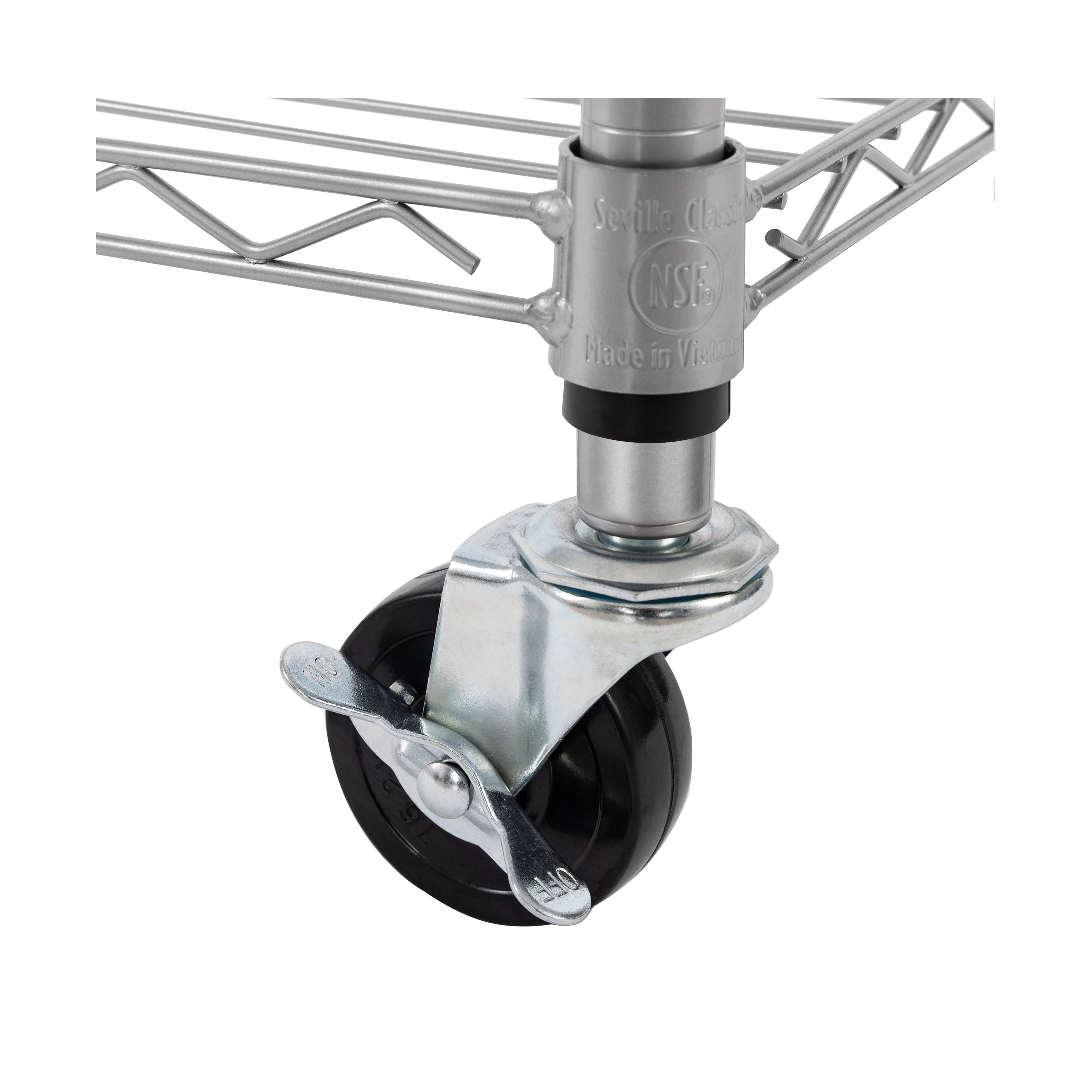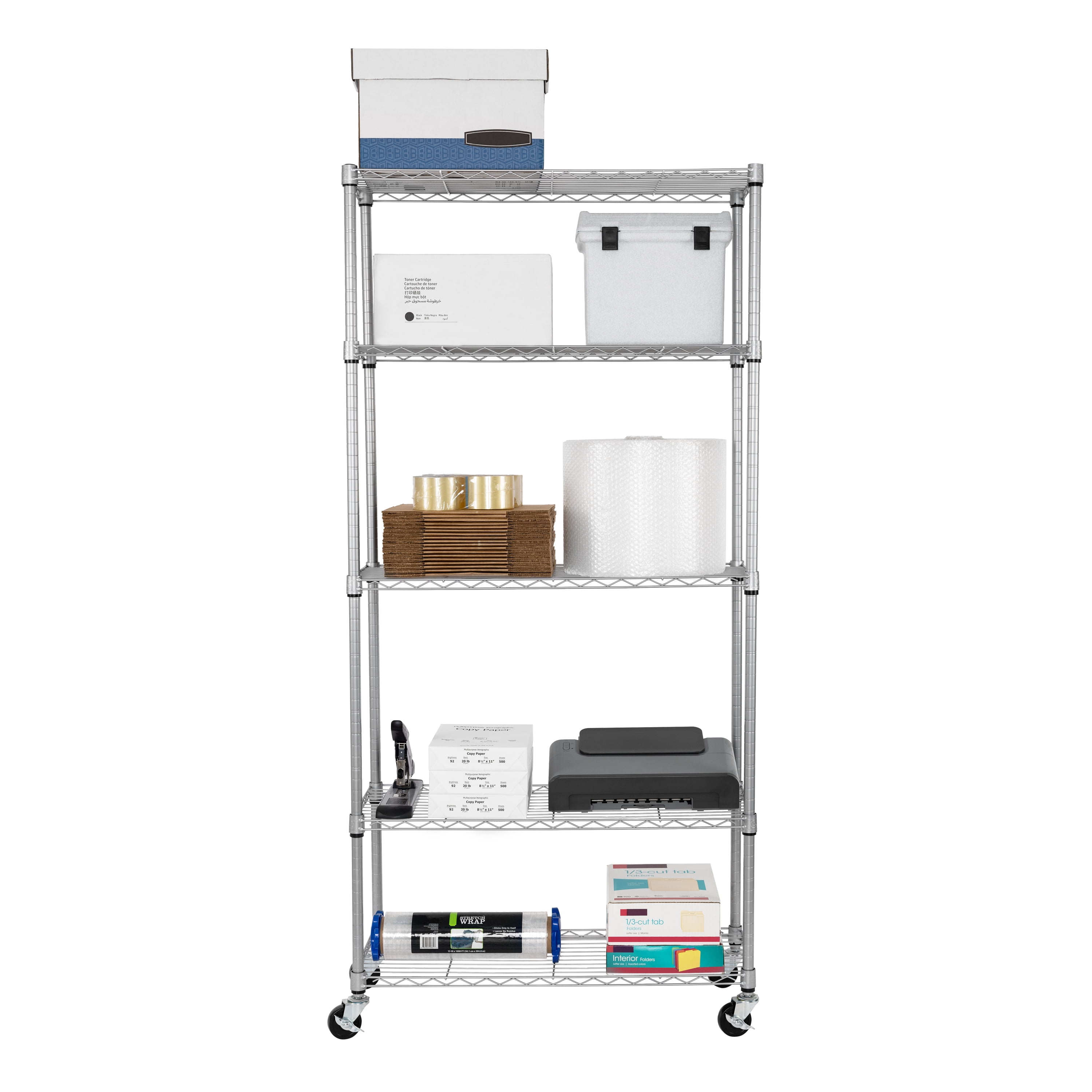 Seville Classics UltraDurable® 5-Tier NSF Steel Wire Shelving, 36″ W x 14″ D x 76″ H, Silver Organize any space with Seville Classics UltraDurable® 5-Tier Commercial-Grade NSF-Certified Steel Wire Shelving System. This heavy-duty shelving is constructed from industrial-strength steel and measures 36” wide by 14” deep by and 76” high fully assembled on wheels (72” high on leveling feet). The 5 shelves and 4 poles are plated steel for protection against corrosion in dry environments. Shelves are adjustable in 1” increments. Includes four 4” heavy-duty rubber wheels and four adjustable leveling feet. NSF Certified – NSF/ANSI Standard 2 – Food Equipment for commercial and restaurant use. This shelving system can store up to 800 lbs. per shelf on leveling feet (4,000 lbs. total). On wheels this shelving system can store up to 500 lbs. total. No tools are required for assembly.