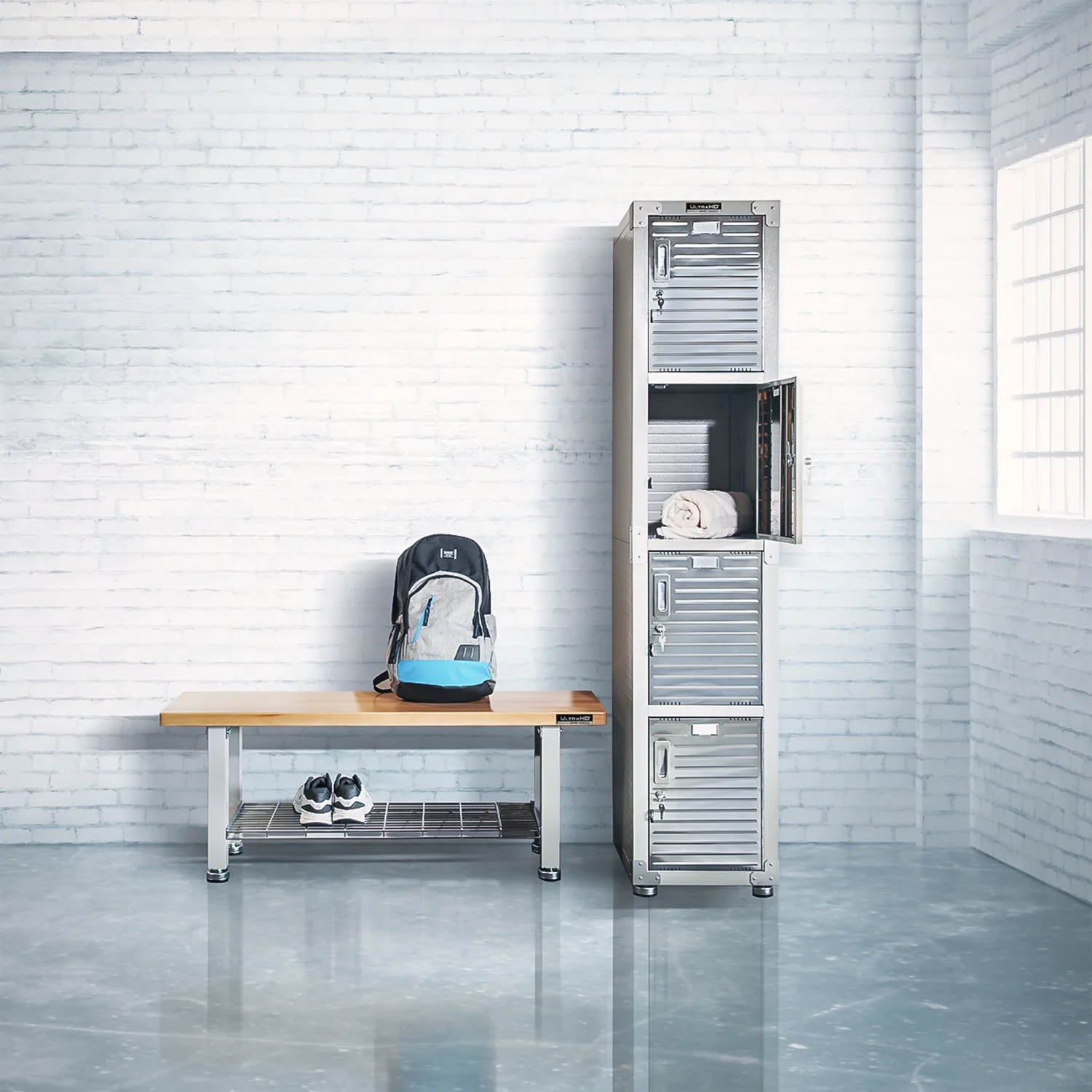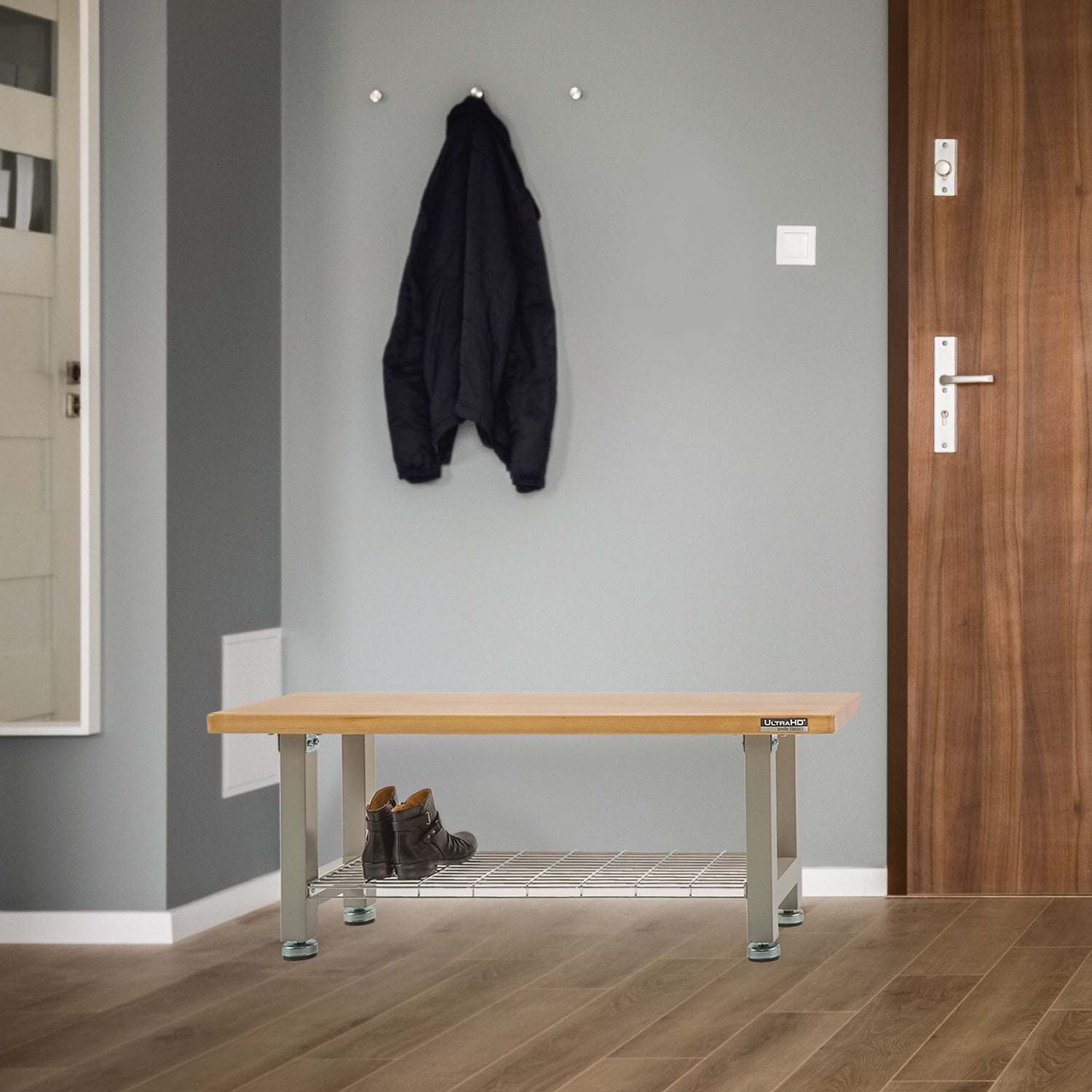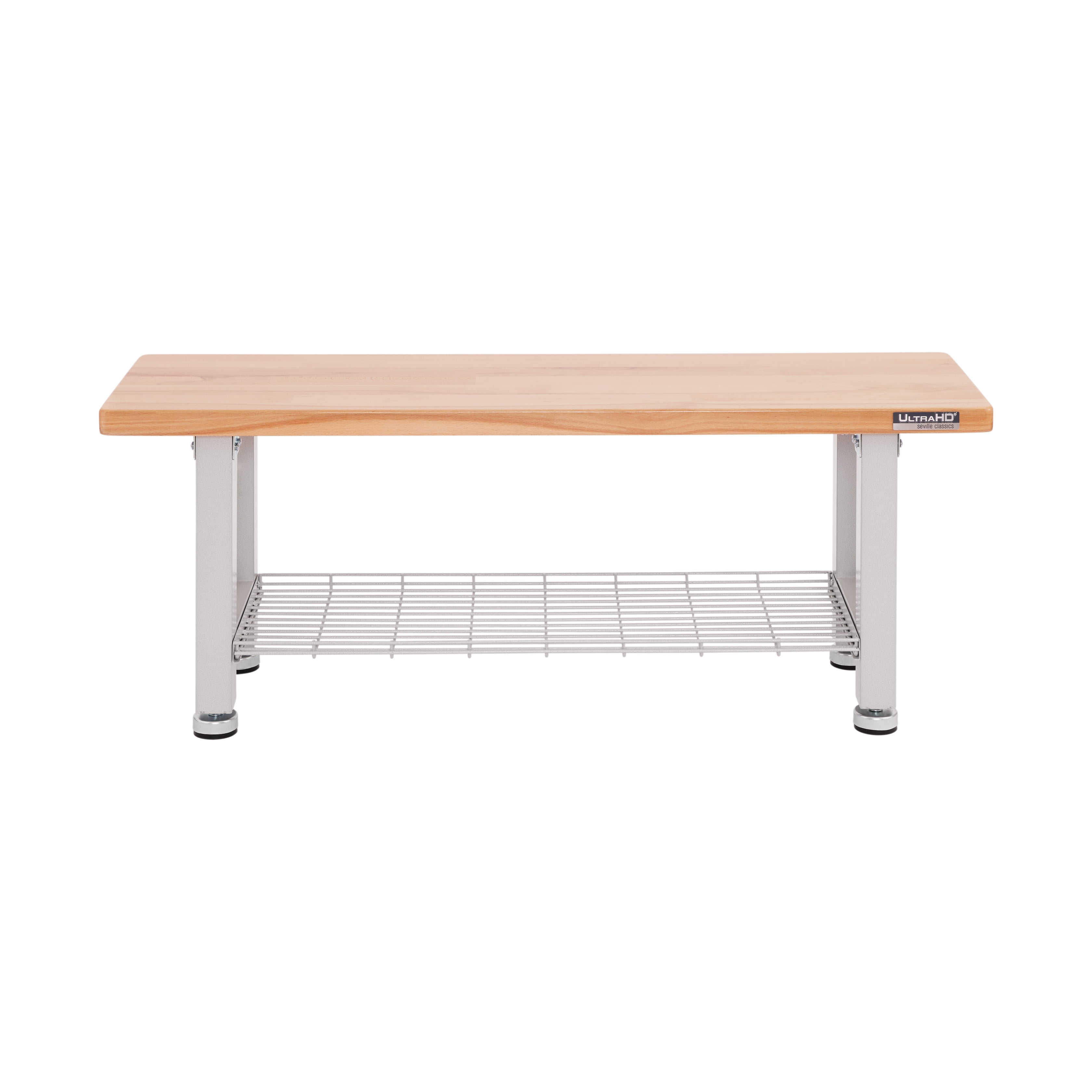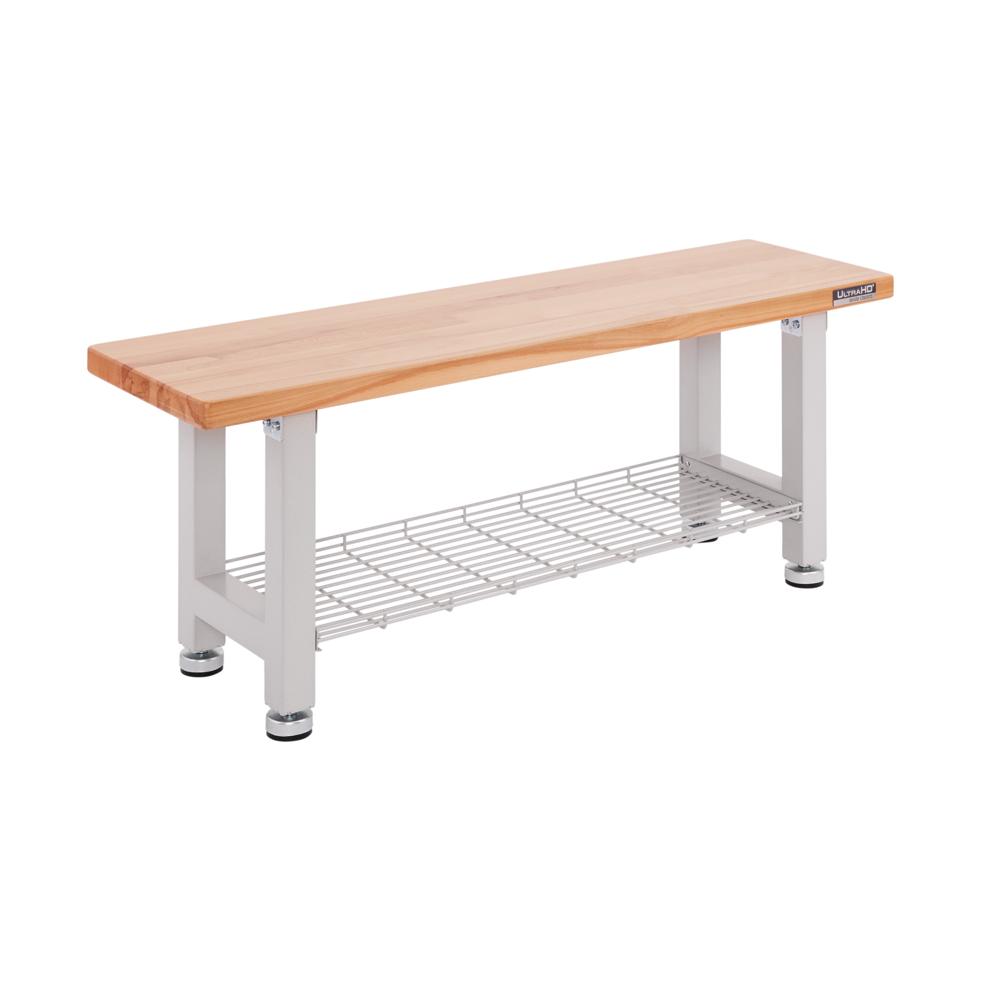 Upgrade your home or workspace with the Seville Classics UltraHD Wood Storage Bench. Enjoy durable indoor seating in any room of your home, office, or business. The bench seat is made of solid 1.5-inch thick beech wood and coated in polyurethane for protection against scratches and scuffs. Steel wire storage shelf lets users store shoes, boots, boxes, and more. A heavy-duty steel frame with padded leveling feet provides support for up to 350 lbs. on the bench seat and up to 100 lbs. on the storage shelf (evenly distributed). Perfect for use as a home entryway bench with storage for shoes; in the bedroom as a window bench; in the garage as a seat for your workshop; at your business as a waiting room bench or even at restaurants and pub tables. All required tools are included for assembly. Bench dimensions measure 48 inches long by 14 inches deep and 18.5 inches high.