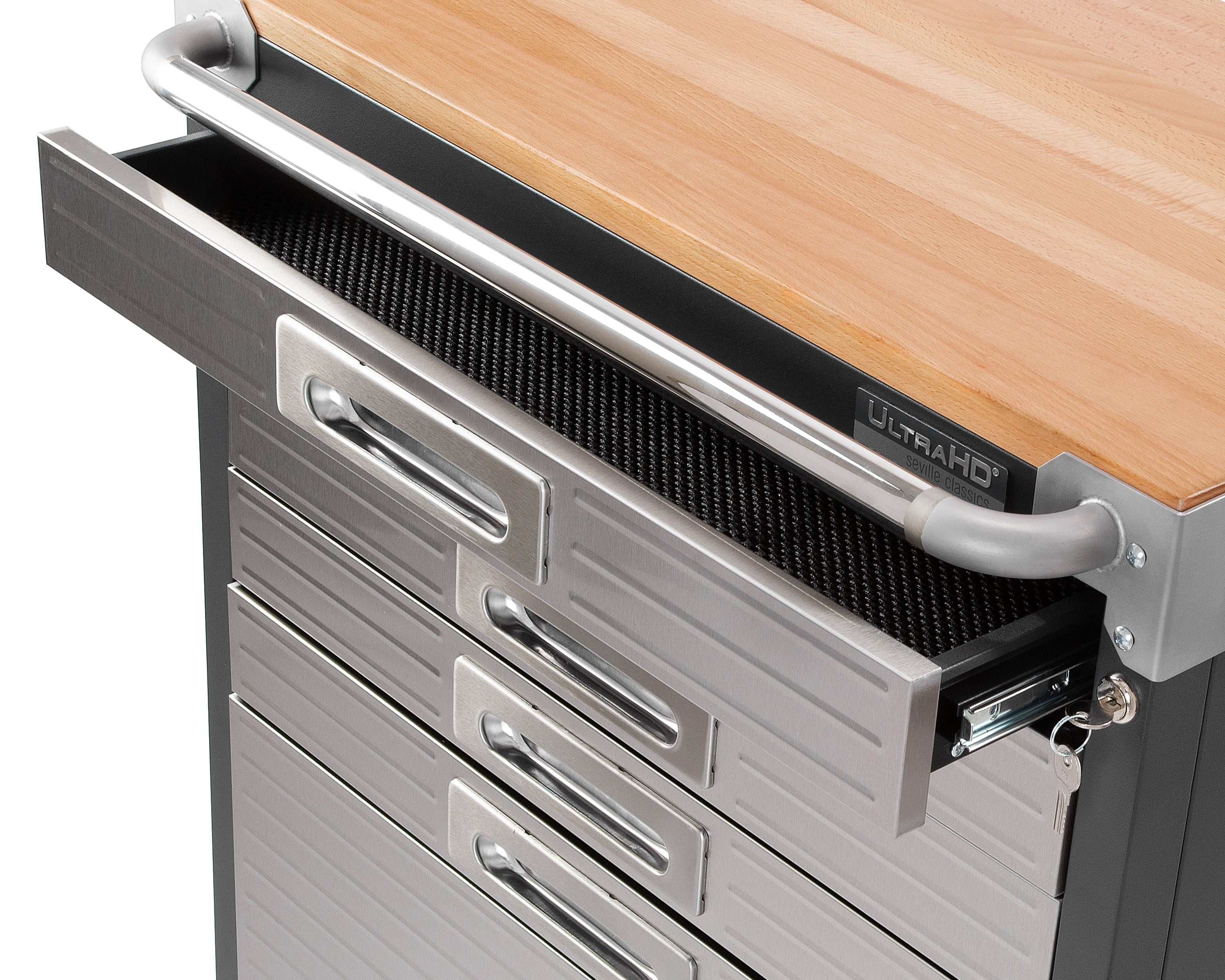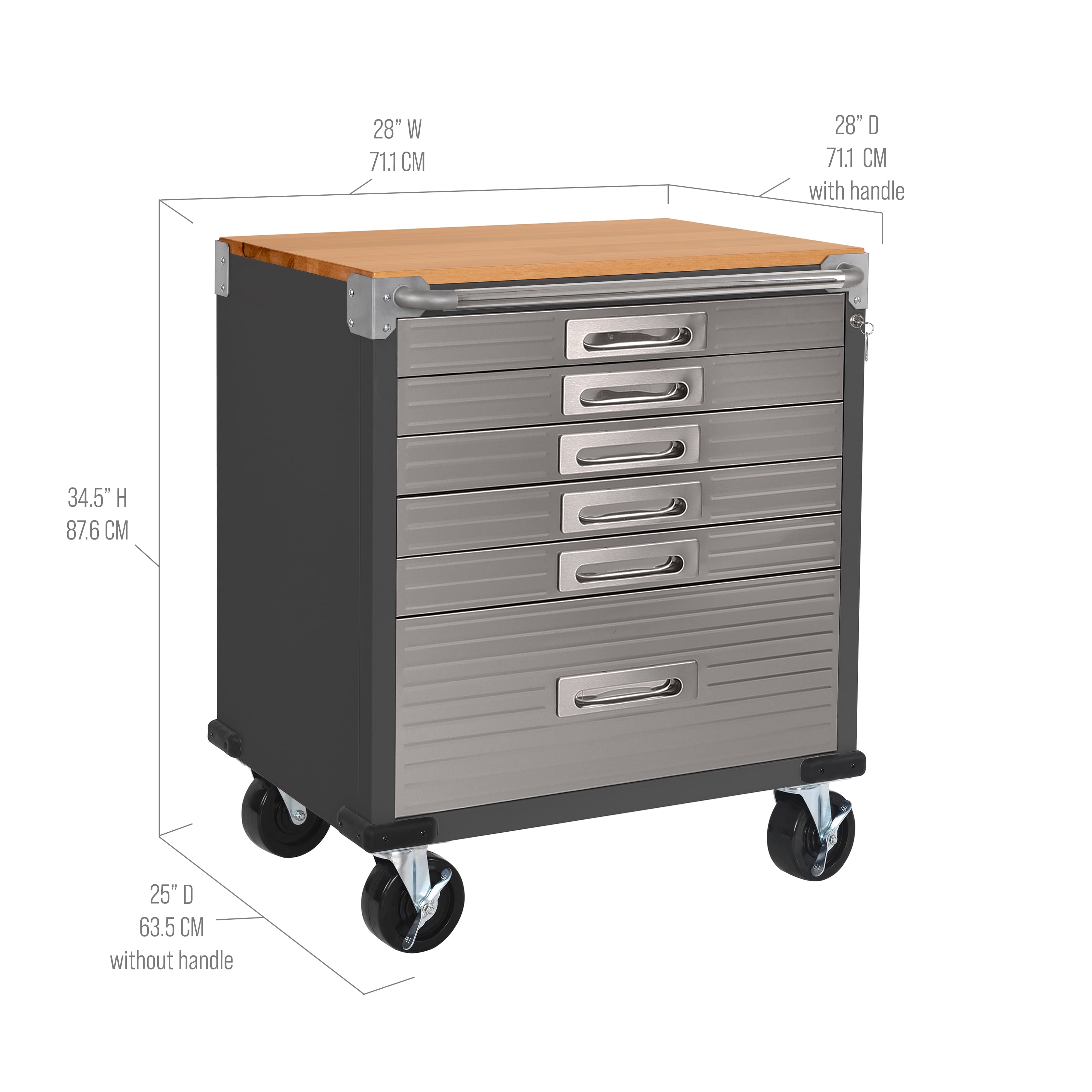 Utility and mobility come together in Seville Classics 6-Drawer Rolling Cabinet. Designed for heavy-duty use, the drawers and panels are constructed from high-quality steel. The 3/4″ solid hardwood top is intended for use as a work surface for everyone from home mechanics to professional tradesmen. Includes six drawers with cushioned liners and a locking system (with key) to keep your tools and supplies safe. The included rolling casters allow your equipment to go where you do. A push bar allows the table to act as a ultra heavy-duty wheel cart.