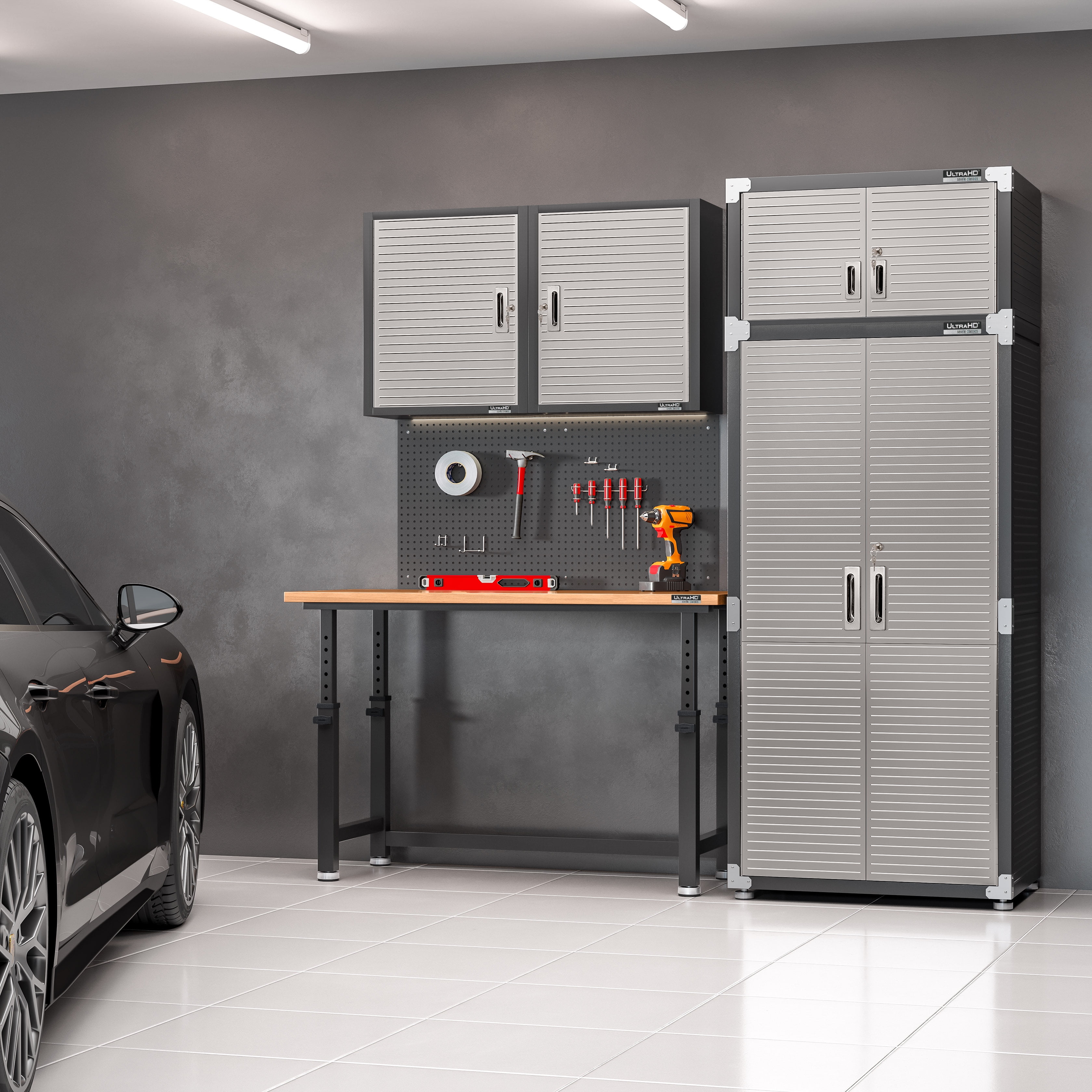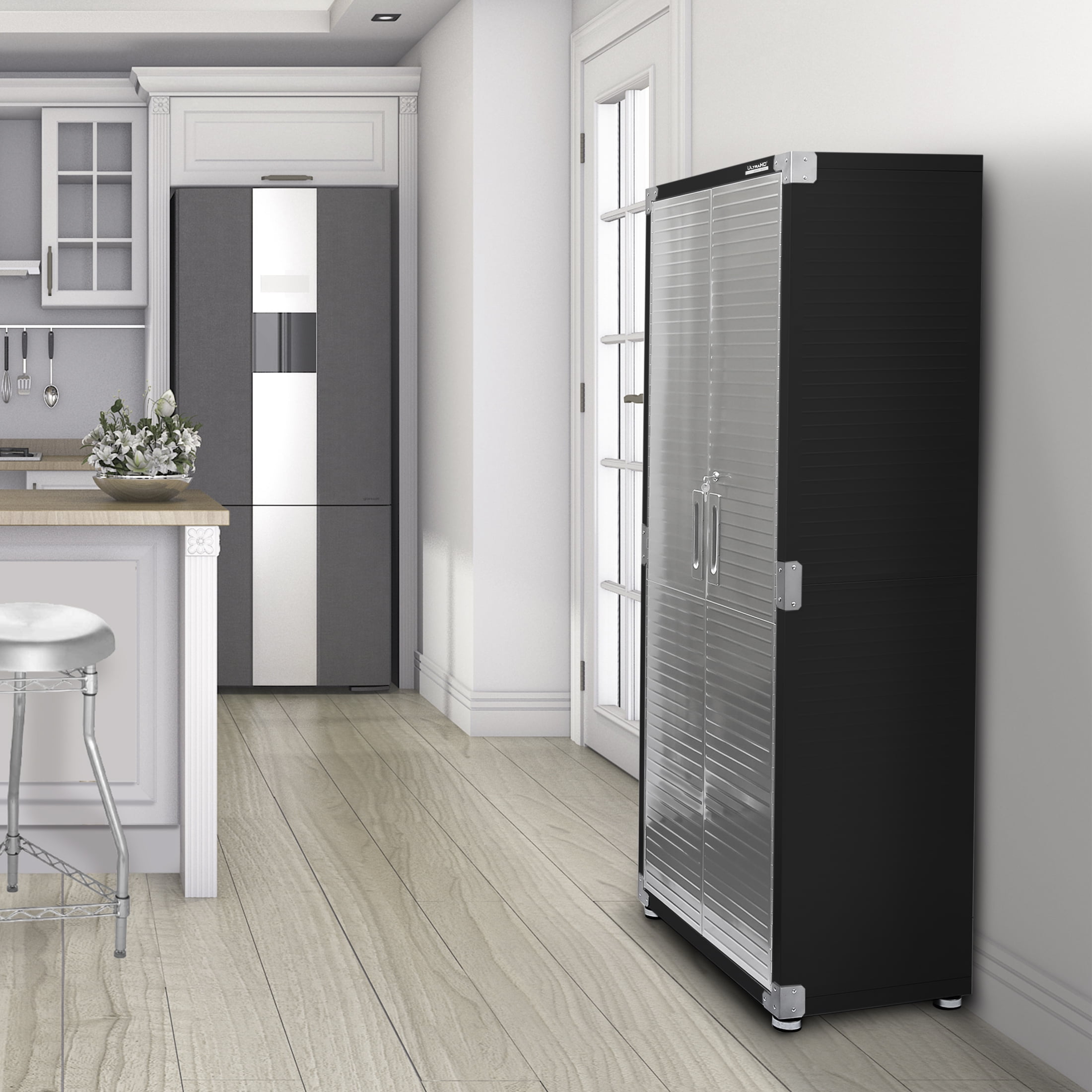 Optimize your storage with Seville Classics UltraHD Stainless Steel 2-Door Lockable Storage Cabinet. This unit is designed to optimize smaller spaces with a footprint of 30″ wide by 18″ deep. Doors are constructed of high-quality grade 430 stainless steel with recessed handles and key lock. An UltraGuard fingerprint-resistant coating on the doors help to resist smudges from grease and oil. They’re also ferromagnetic, working with magnetic hangers, labels, white boards and other accessories. Easily organize the interior with 3 steel shelves height adjustable at 1-inch increments. Cabinet body is constructed of steel and features a ribbed exterior to protect against dents from impacts at work. Black polyurethane bumpers and grade 430 stainless-steel corner guards provide extra durability when you’re on the move or in busy spaces. Cabinet includes padded leveling feet and wall mounting straps for superior stability in almost any space. Assembly is easy with all required tools and detailed assembly instructions included.
