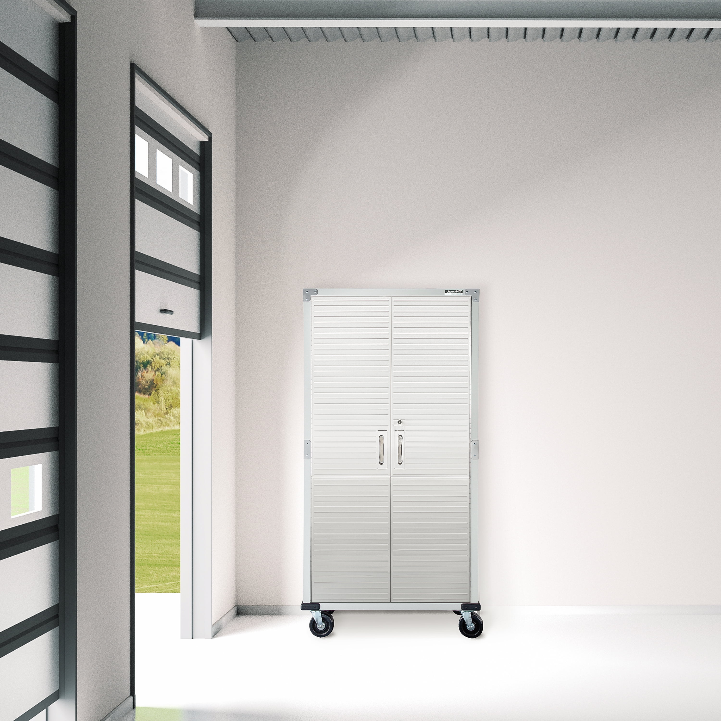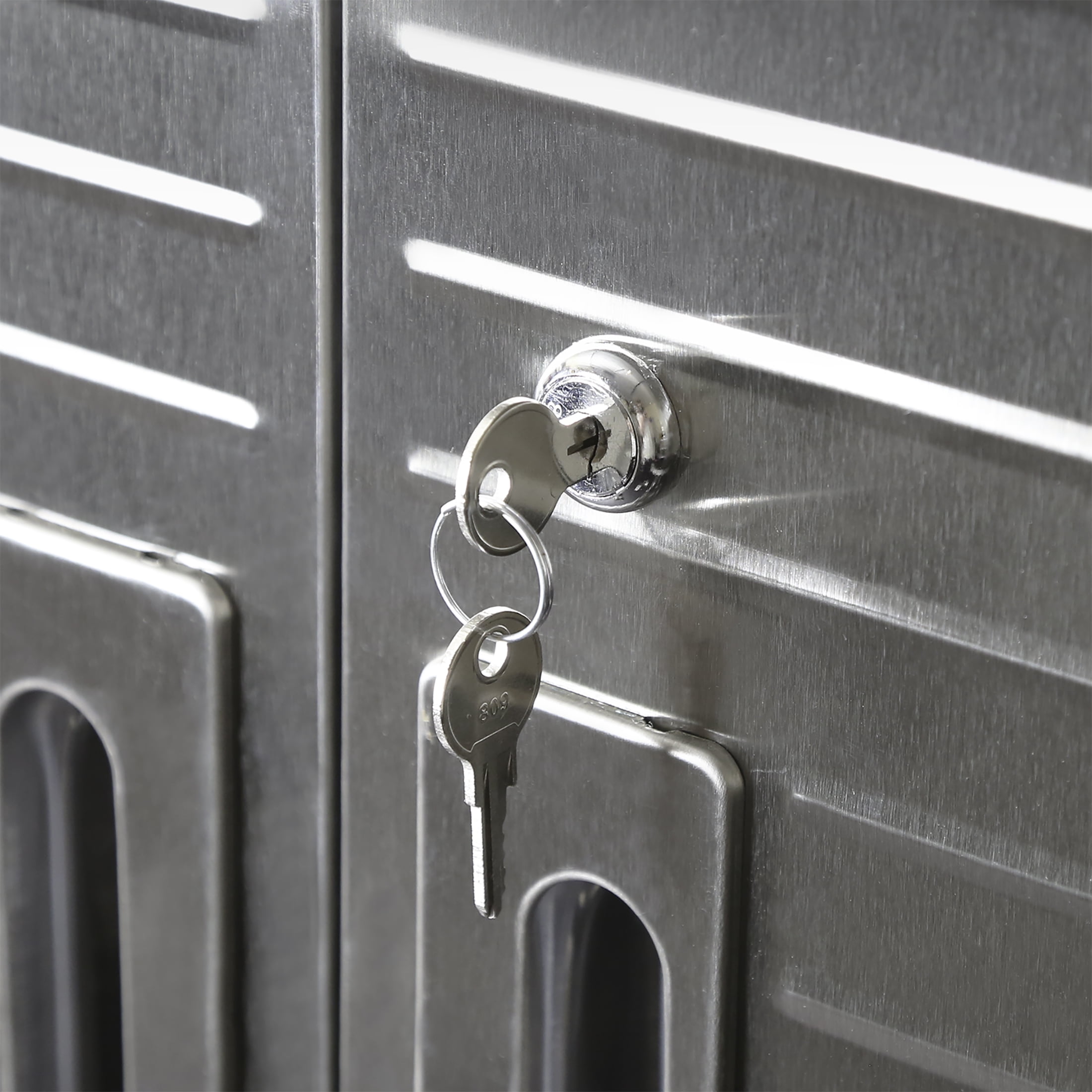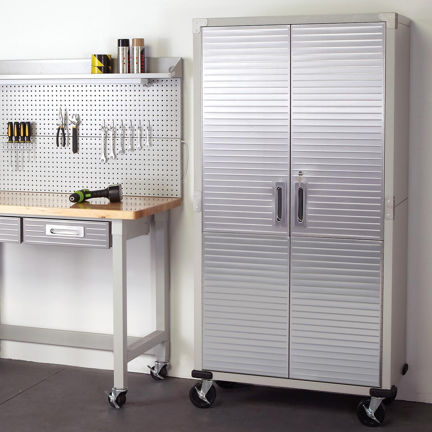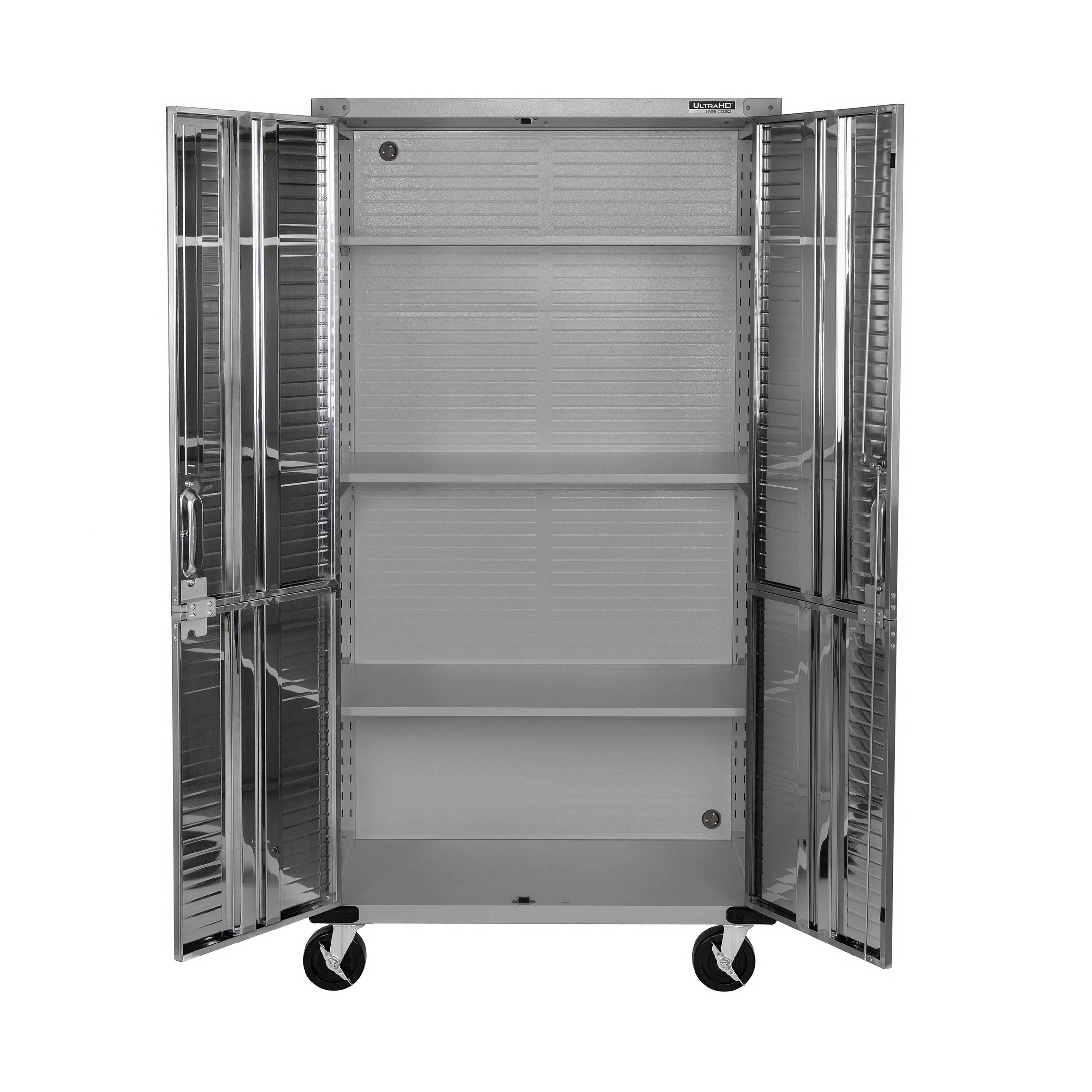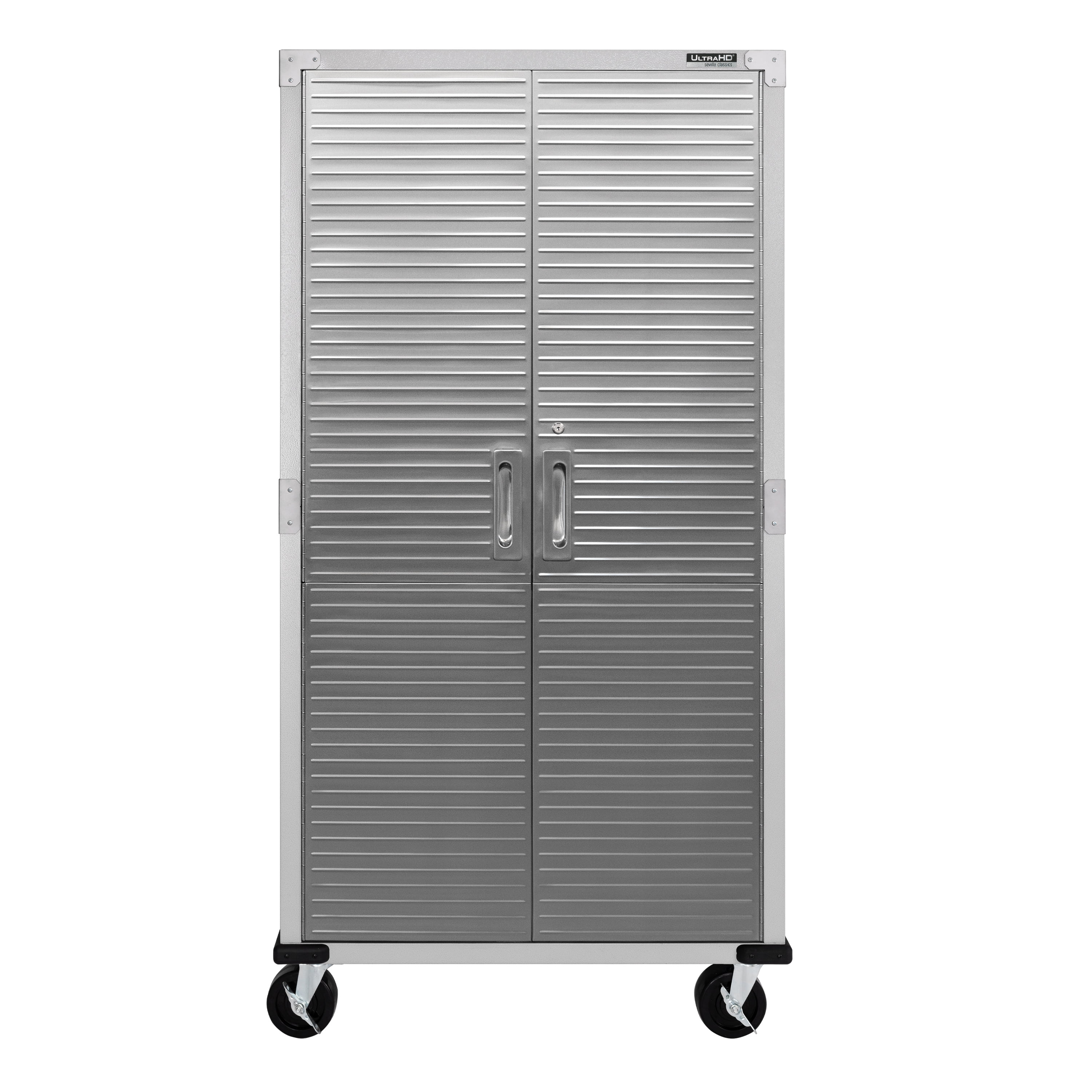 DIMENSIONS – 36” W x 18” D x 72” H (on wheels) LONG LASTING BUILD – Powder-coated solid steel construction for commercial-grade strength. Includes four corner bumpers for added protection. PROTECTED STAINLESS STEEL – Features UltraGuard® fingerprint-resistant coating on the stainless-steel doors. · SECURED LOCKING – The stainless-steel doors have a magnetic latch and feature a 3-point locking system. The locking system secures the top, middle, and base at once (two sets of keys included). ADJUSTABLE SHELVES – Features four solid steel shelves; three that are height-adjustable (at 1-inch increments) and removable. MOBILE DESIGN – Equipped with four 5” heavy-duty rubber wheels (2 locking) for convenient mobility. WEIGHT CAPACITY – The total weight capacity is 600 lb. (150 lb. per shelf). VERSATILE – Use the space-saving design in a garage, office, kitchen, bedroom, studio, laundry room, classroom, or warehouse.
