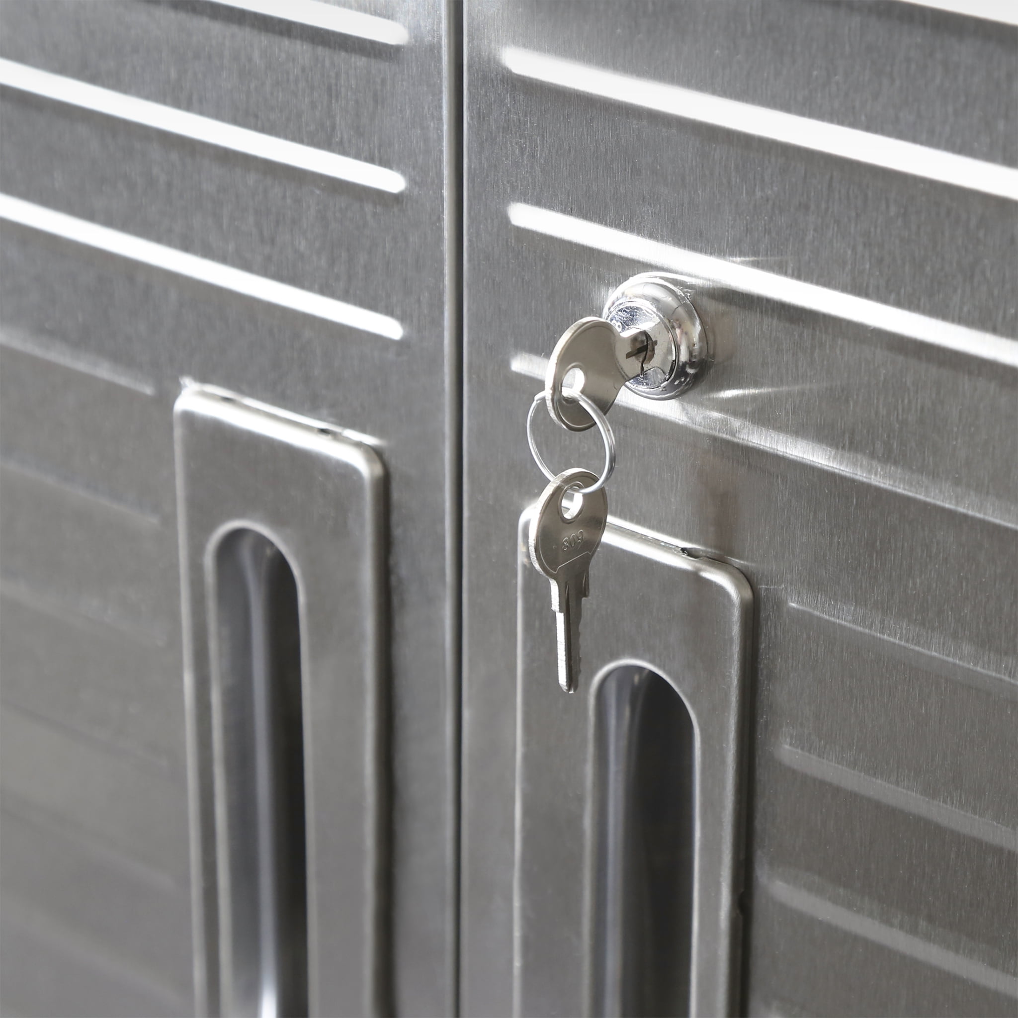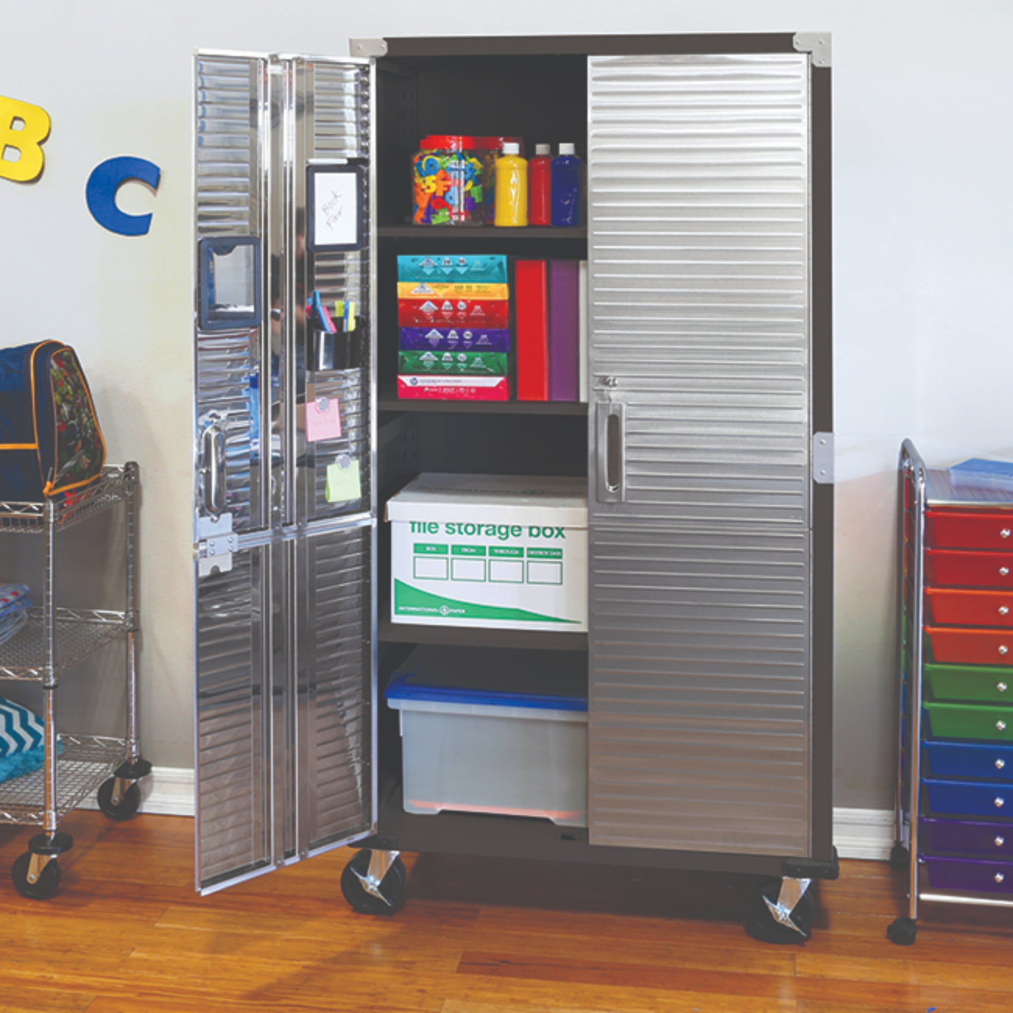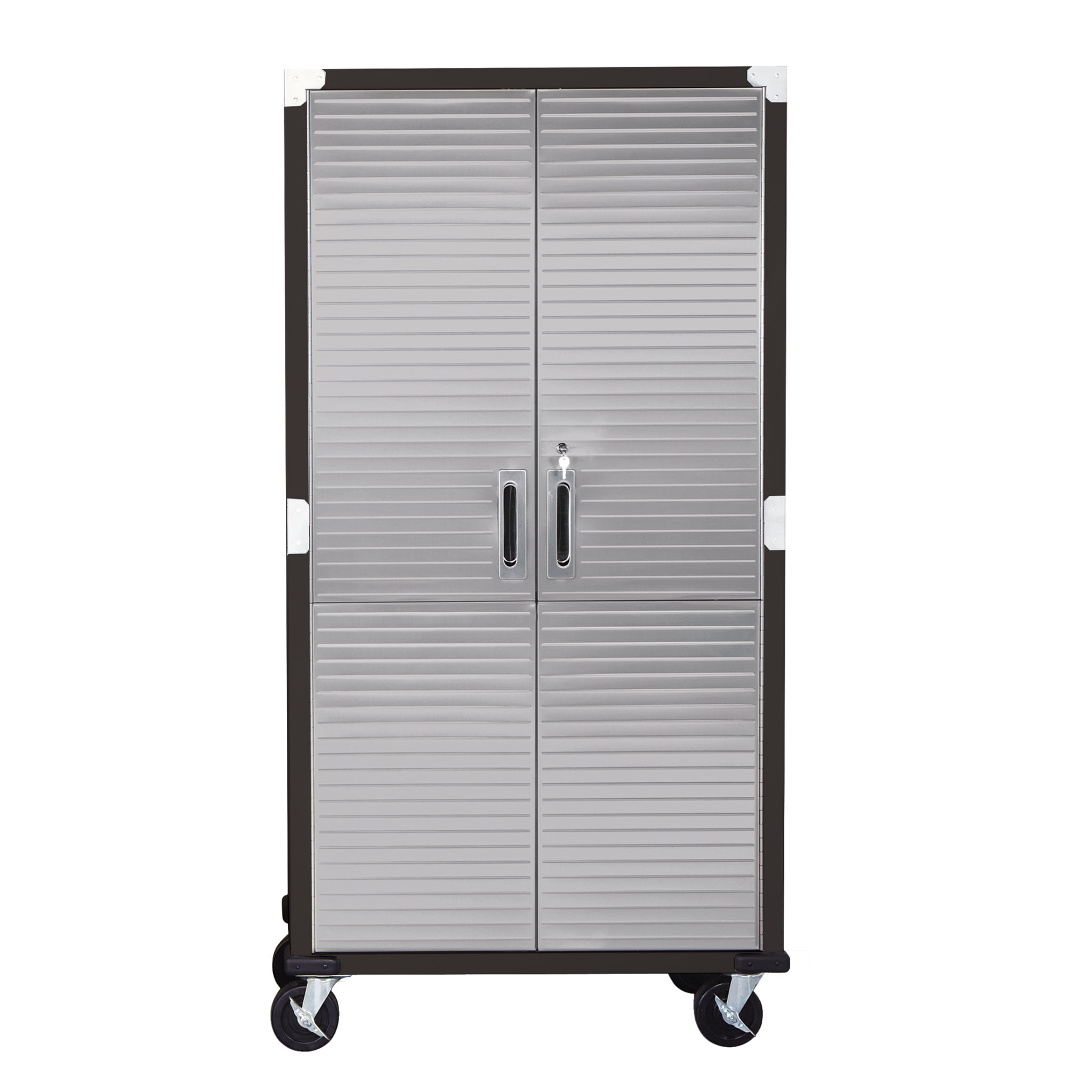 DIMENSIONS – 36” W x 18” D x 72” H (on wheels) LONG LASTING BUILD – Powder-coated solid steel construction for commercial-grade strength. Includes four corner bumpers for added protection. PROTECTED STAINLESS STEEL – Features UltraGuard® fingerprint-resistant coating on the stainless-steel doors. SECURED LOCKING – The stainless-steel doors have a magnetic latch and feature a 3-point locking system. The locking system secures the top, middle, and base at once (two sets of keys included). ADJUSTABLE SHELVES – Features four solid steel shelves; three that are height-adjustable (at 1-inch increments) and removable. MOBILE DESIGN – Equipped with four 5” heavy-duty rubber wheels (2 locking) for convenient mobility. WEIGHT CAPACITY – The total weight capacity is 600 lb. (150 lb. per shelf). VERSATILE – Use the space-saving design in a garage, office, kitchen, bedroom, studio, laundry room, classroom, or warehouse.