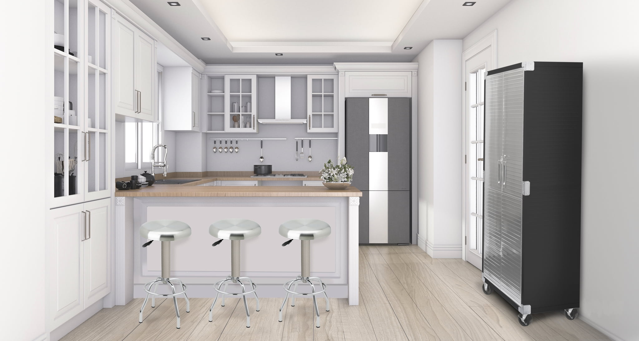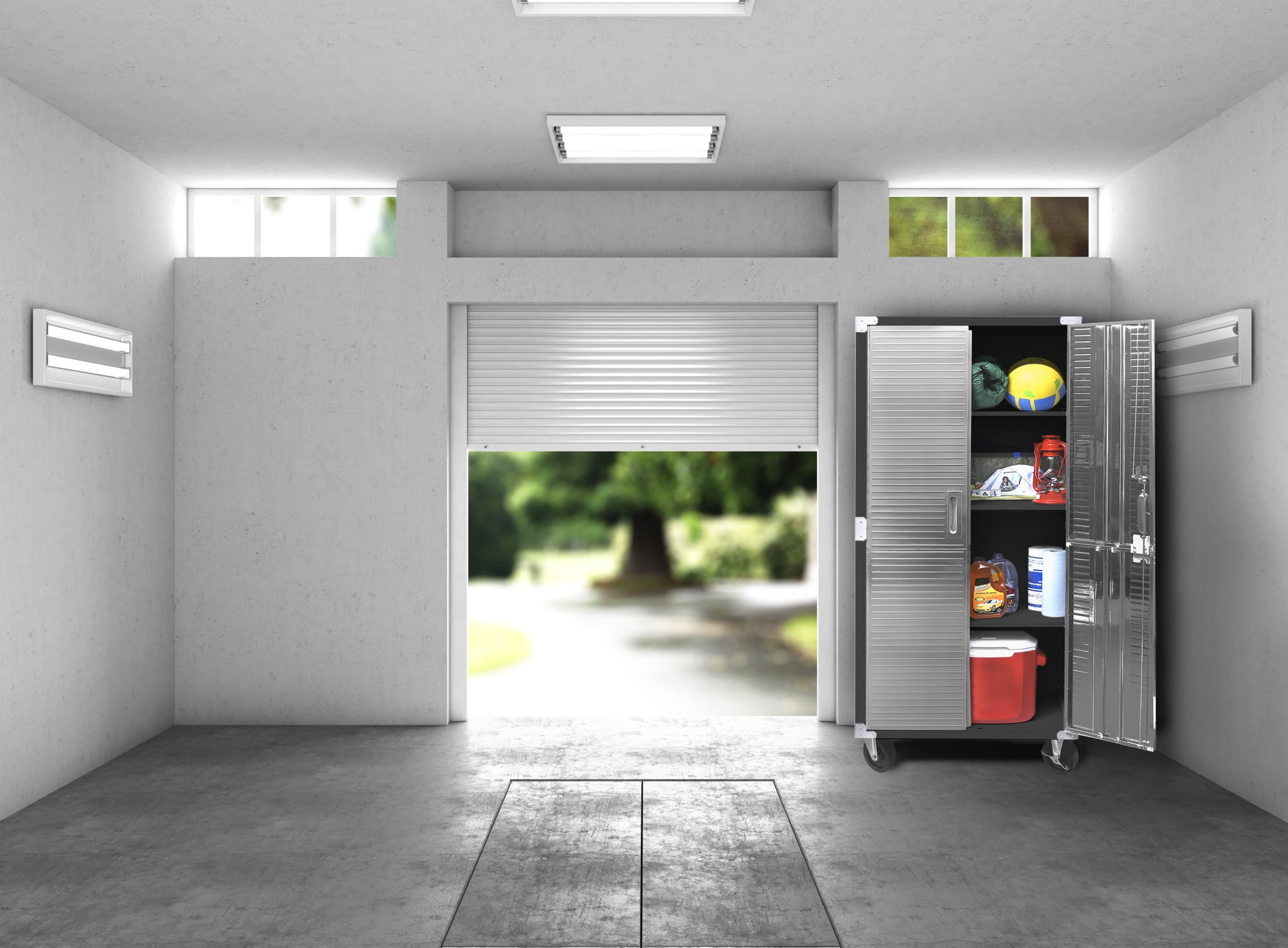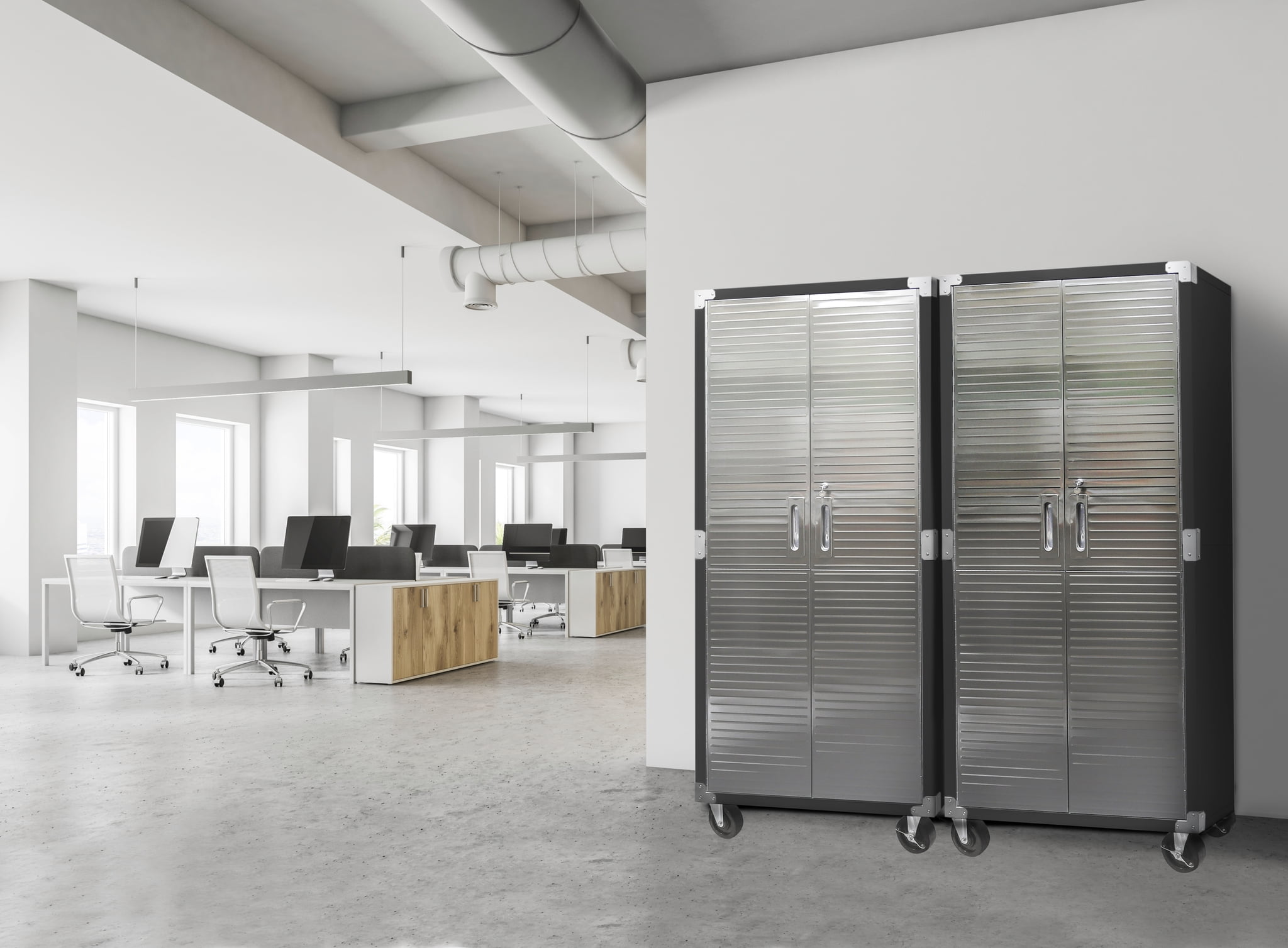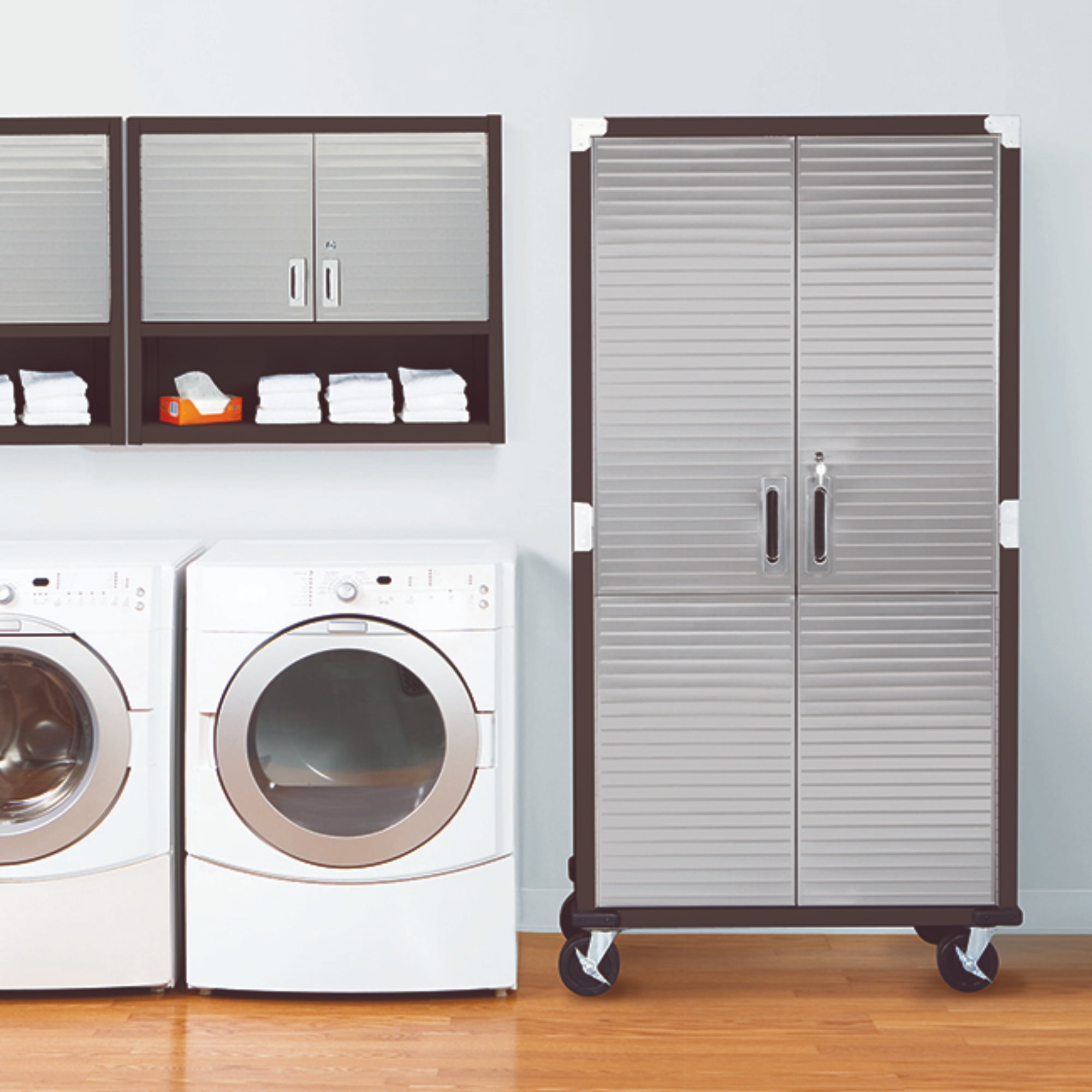 DIMENSIONS – 36” W x 18” D x 72” H (on wheels) LONG LASTING BUILD – Powder-coated solid steel construction for commercial-grade strength. Includes four corner bumpers for added protection. PROTECTED STAINLESS STEEL – Features UltraGuard® fingerprint-resistant coating on the stainless-steel doors. SECURED LOCKING – The stainless-steel doors have a magnetic latch and feature a 3-point locking system. The locking system secures the top, middle, and base at once (two sets of keys included). ADJUSTABLE SHELVES – Features four solid steel shelves; three that are height-adjustable (at 1-inch increments) and removable. MOBILE DESIGN – Equipped with four 5” heavy-duty rubber wheels (2 locking) for convenient mobility. WEIGHT CAPACITY – The total weight capacity is 600 lb. (150 lb. per shelf). VERSATILE – Use the space-saving design in a garage, office, kitchen, bedroom, studio, laundry room, classroom, or warehouse.