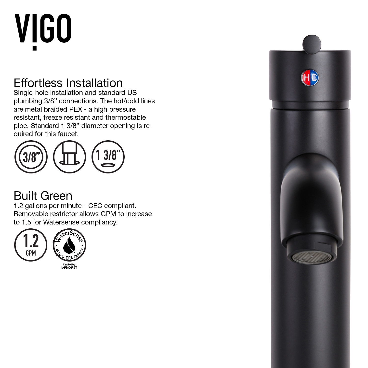 Live the best of both worlds with a modern and classic design and choose the VIGO Seville bathroom vessel sink faucet in matte black. A 13 In. tall sink faucet for bathroom with a 9-inch tall spout height, the Seville seamlessly brings modern elements into a traditional design for an all-encompassing, cohesive look and feel. With hints of the industrial era, this black bathroom sink faucet features a solid brass construction and 7-layer plated finish ensure exceptional durability with an effortless single hole installation. Standard US plumbing 3/8 inch connections and hot/cold lines that are metal-braided PEX are thermostable for additional safety and security. Built with water conservation in mind, the VIGO Seville is WaterSense certified and meets CEC (Title 20) compliance standards. cUPC, NSF-61, and AB1953 certified by the IAPMO, this bathroom faucet for vessel sinks is also ADA compliant. With a single handle to control water and temperature operations, and a mineral-resistant, easy-to-clean nozzle, this single hole bathroom sink faucet is just what you’ve been looking for to complete your one-of-a-kind bathroom.