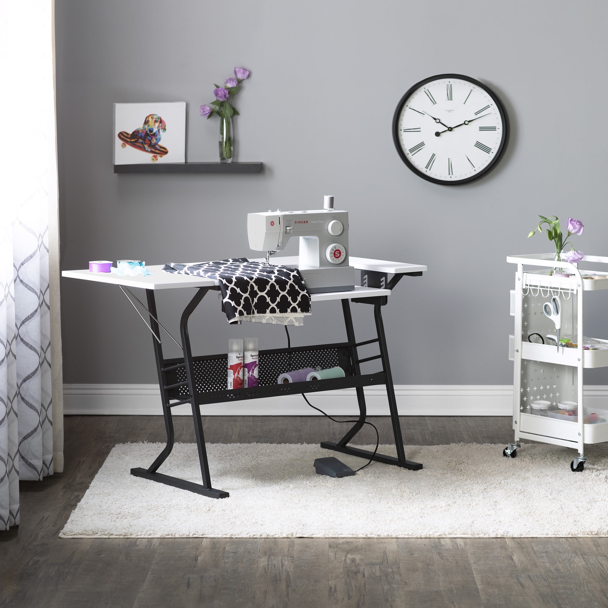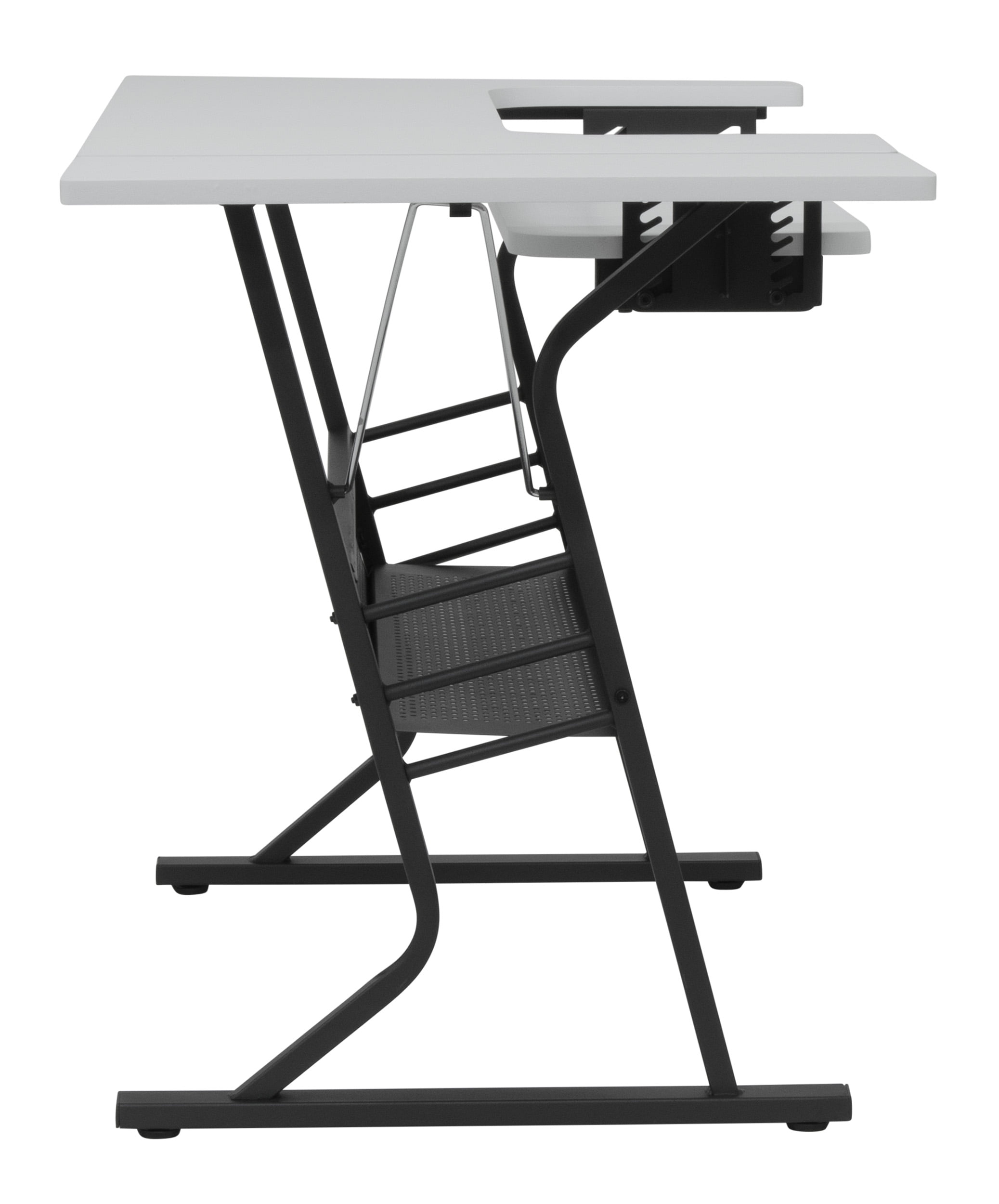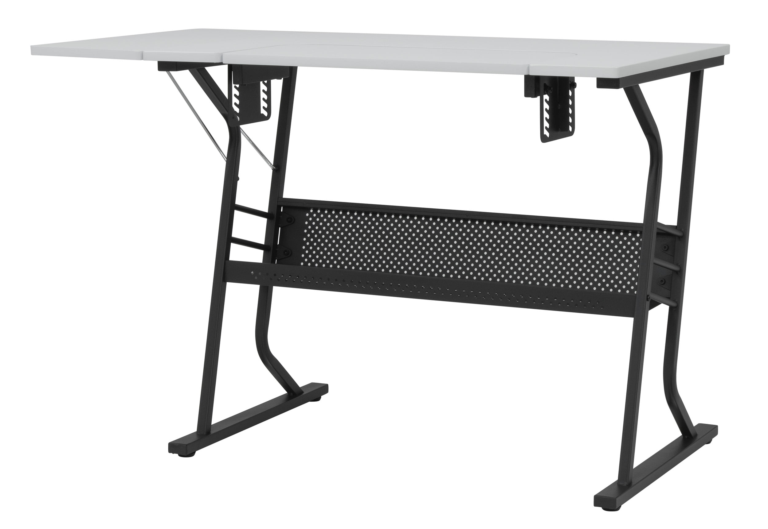 Simplify your sewing and crafting projects with this versatile sewing table from Studio Designs. The Eclipse Hobby Table features a 44.75 -inch wide tabletop that allows you to cut or adjust fabric and patterns. The table has a durable and heavy-gauge steel frame with a black finish, paired with a laminate top available in white or Maple finish. The adjustable sewing machine platform design lets you get the perfect angle for your machine, while an open lower shelf and side shelves provide ample storage space for all of your supplies. The unique sewing machine platform lowers to adjust for a variety of sewing machine base heights. Eclipse Hobby Table can also be used as a computer desk for extra workspace in any room.