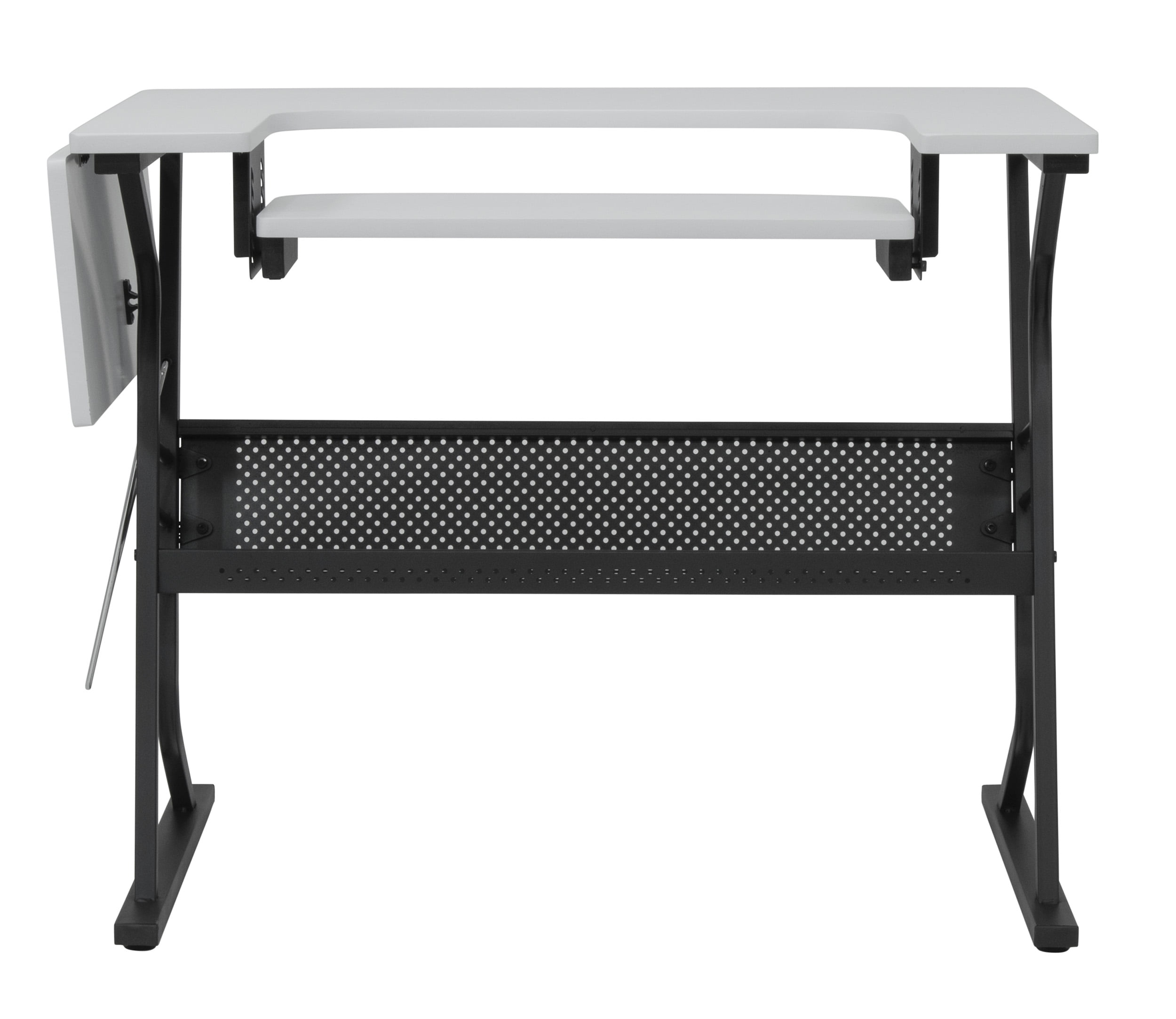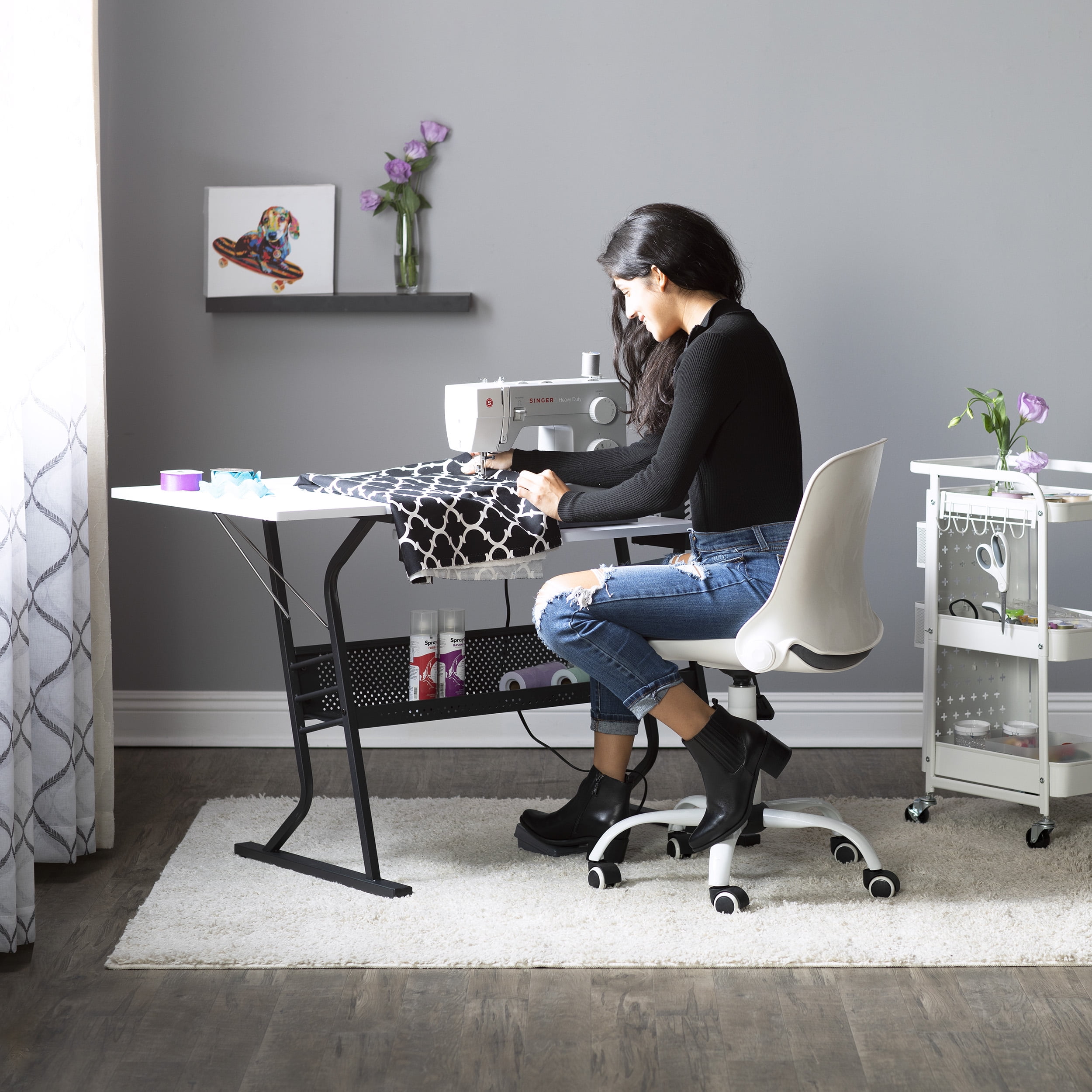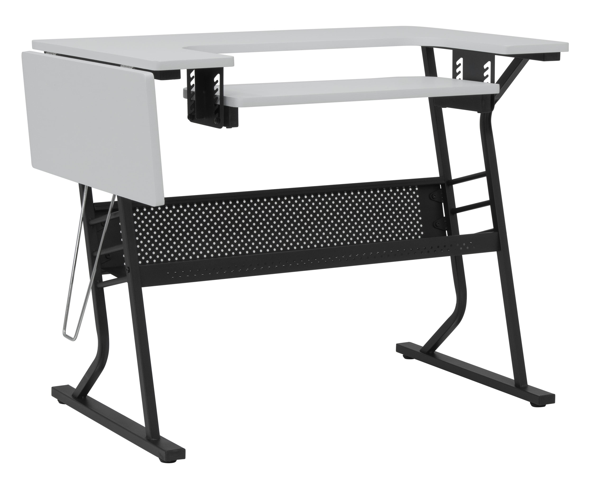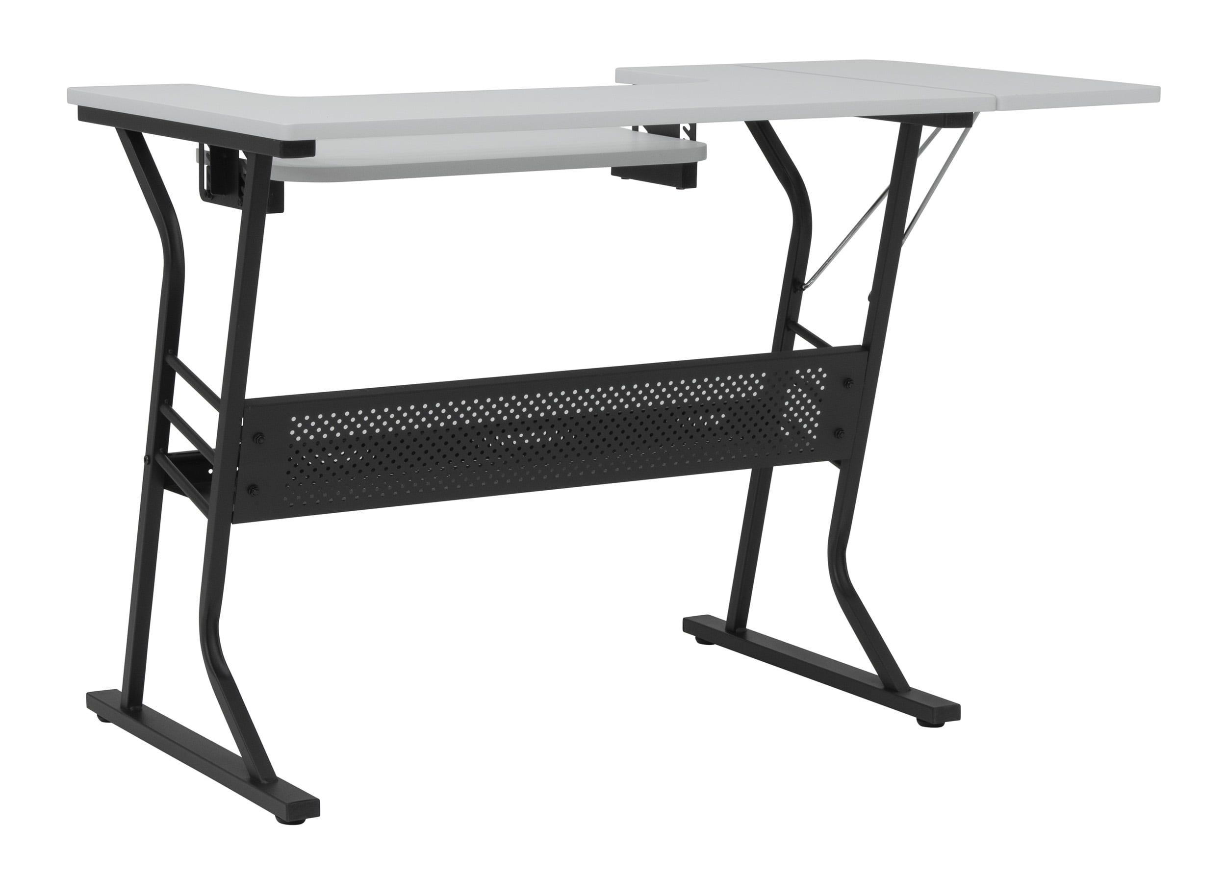 Simplify your sewing and crafting projects with this versatile sewing table from Studio Designs. The Eclipse Hobby Table features a 44.75 -inch wide tabletop that allows you to cut or adjust fabric and patterns. The table has a durable and heavy-gauge steel frame with a black finish, paired with a laminate top available in white or Maple finish. The adjustable sewing machine platform design lets you get the perfect angle for your machine, while an open lower shelf and side shelves provide ample storage space for all of your supplies. The unique sewing machine platform lowers to adjust for a variety of sewing machine base heights. Eclipse Hobby Table can also be used as a computer desk for extra workspace in any room.