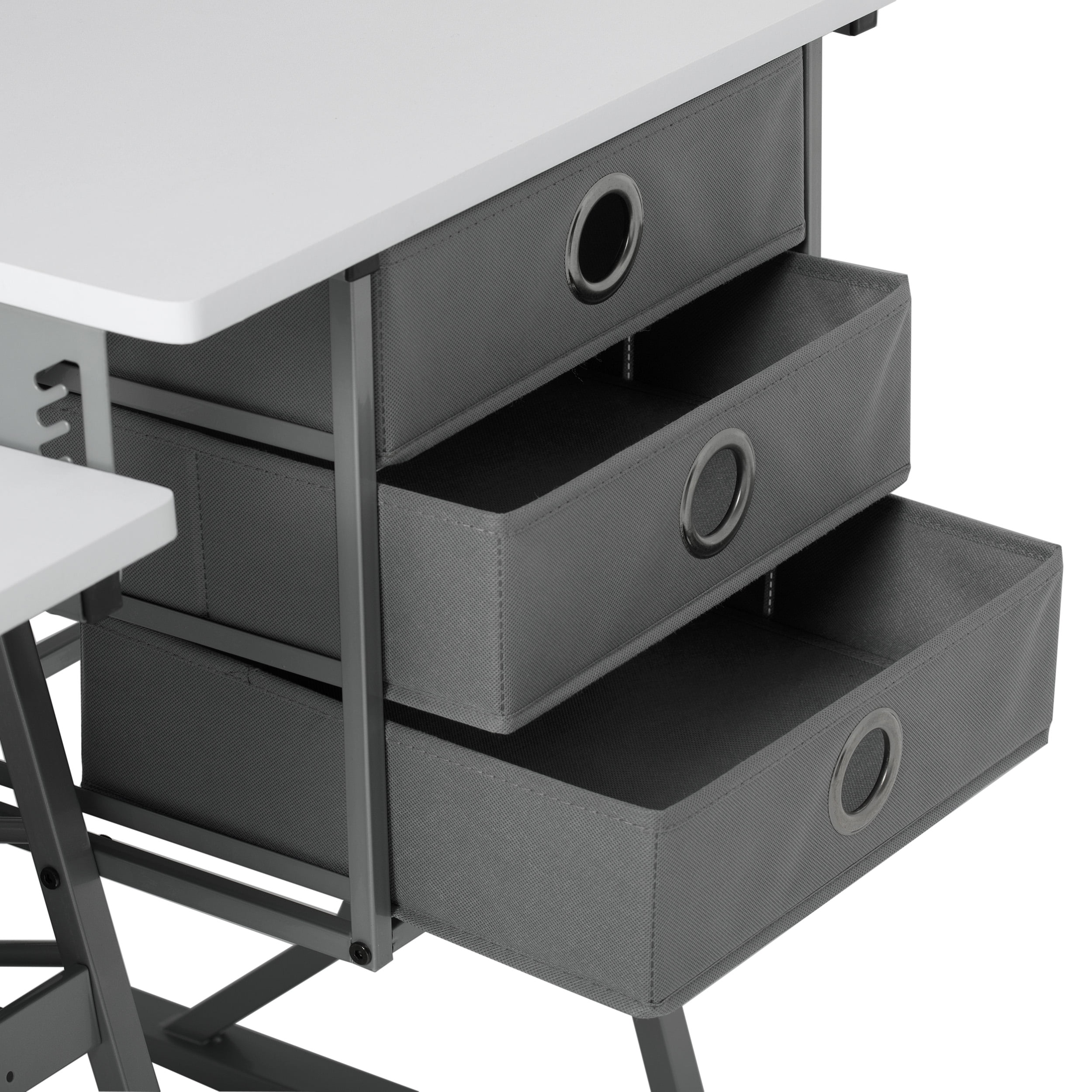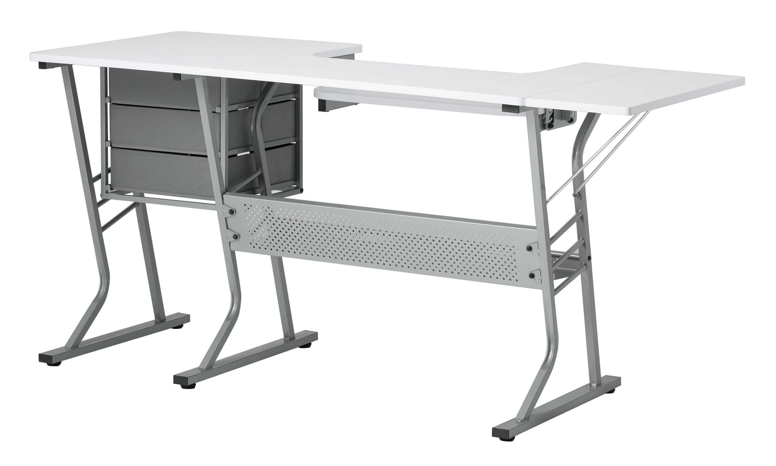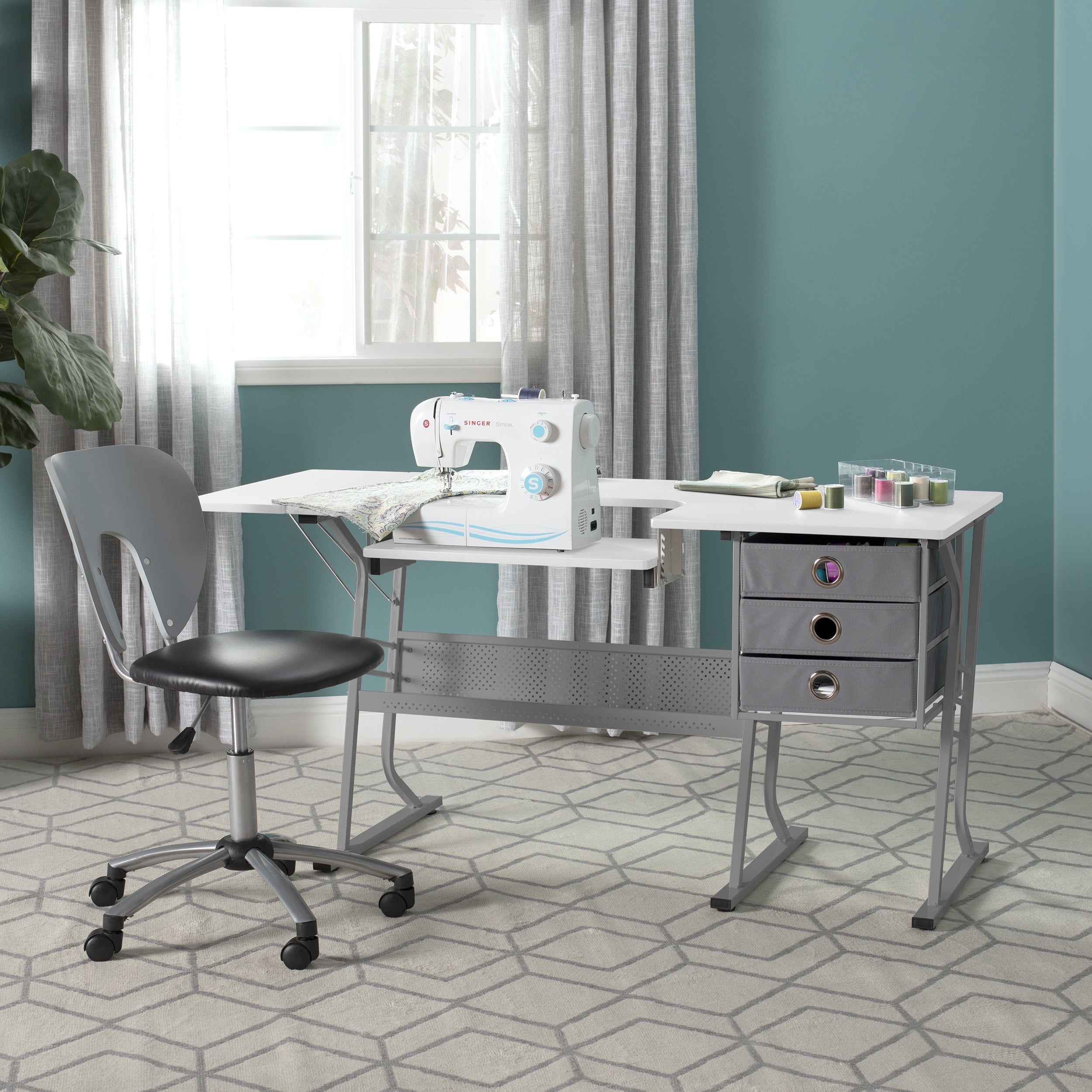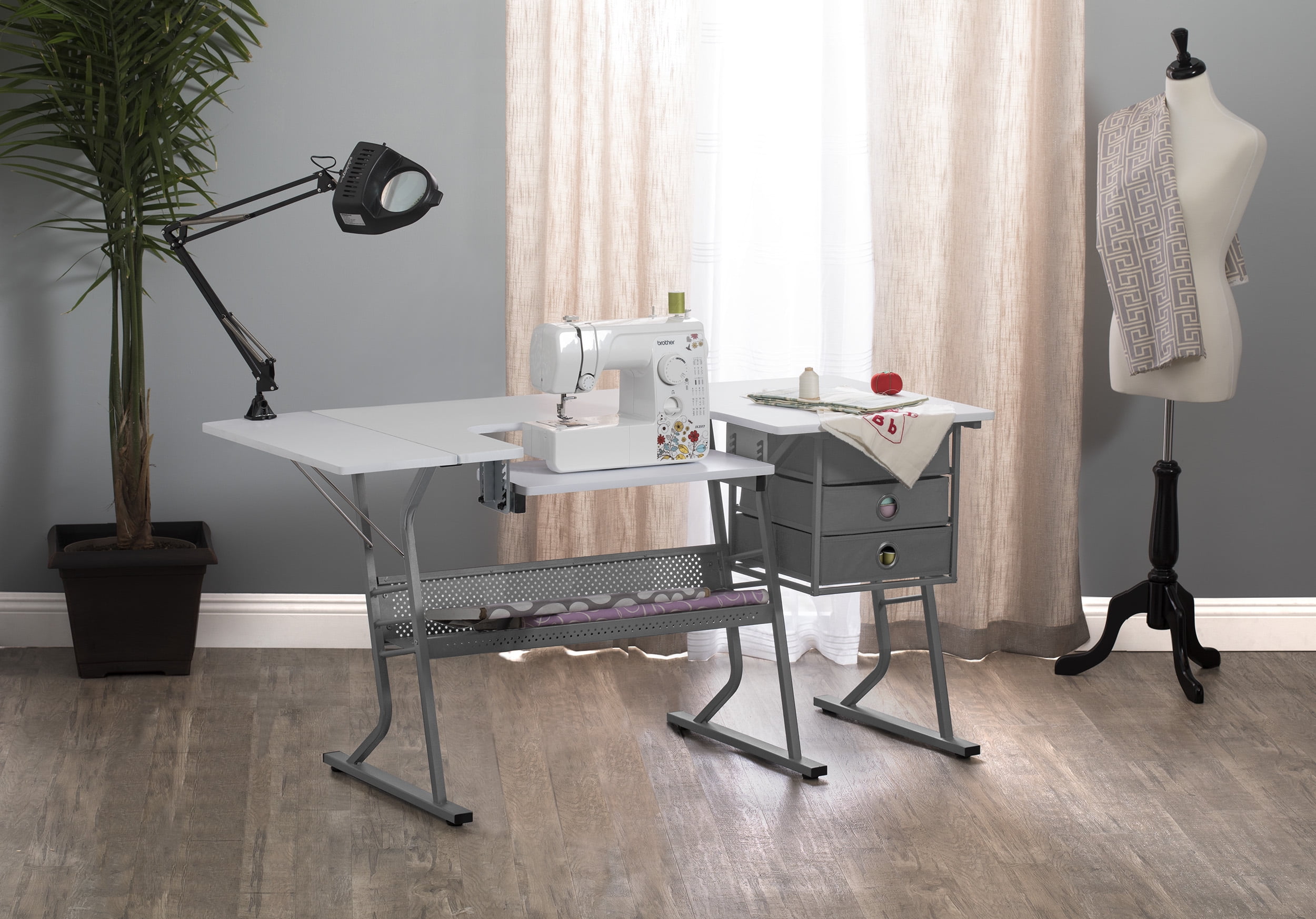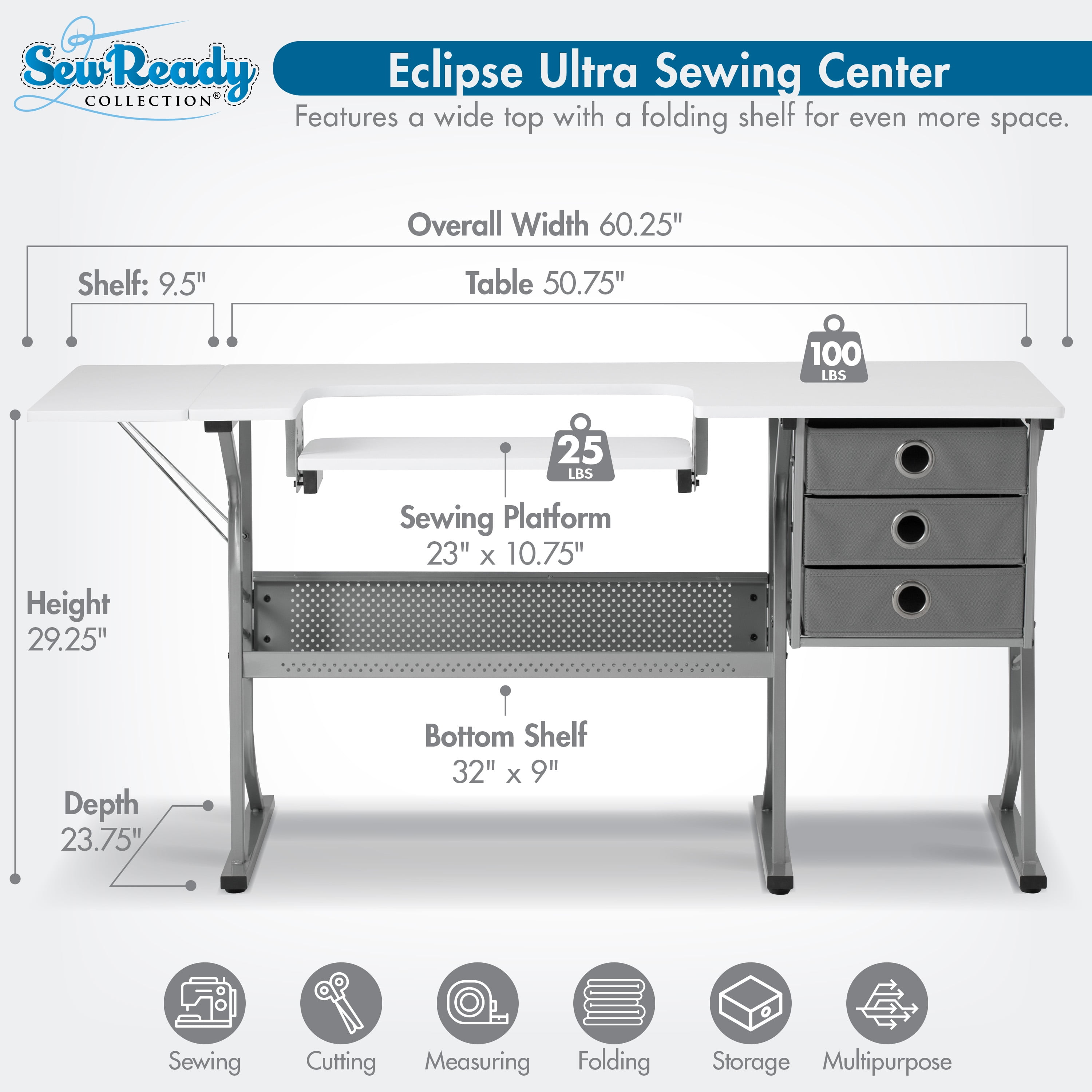 Overall Dimensions: 60.25″ W x 23.75″ D x 29.25″ H ECLIPSE ULTRA HOBBY & SEWING MACHINE TABLE: Stylish design features a 60.25″ wide tabletop with a foldable 9.5″ wide shelf; Perfect for spreading out and diving into a variety of creative projects, including sewing, writing, crafting, and typing OFFERS STORAGE SPACE: Includes three storage drawers and a large lower shelf, so you can store fabric, art supplies, and more without the clutter; Allows you to organize supplies and keep them close while working ADJUSTABLE SEWING MACHINE SHELF: Unique platform shelf lowers for a variety of sewing machine base heights; Can also be used as a place to keep your laptop or computer keyboard SUSTAINABLE DESIGN: The heavy gauge steel construction and thick tabletop make this sewing table with drawers durable and ready for years of use; Includes six floor levelers for uneven surfaces PERFECT FOR ANY ROOM: Ideal for adding a fashionable touch to a variety of spaces; Use our sewing or computer table in your office, art studio, or craft room