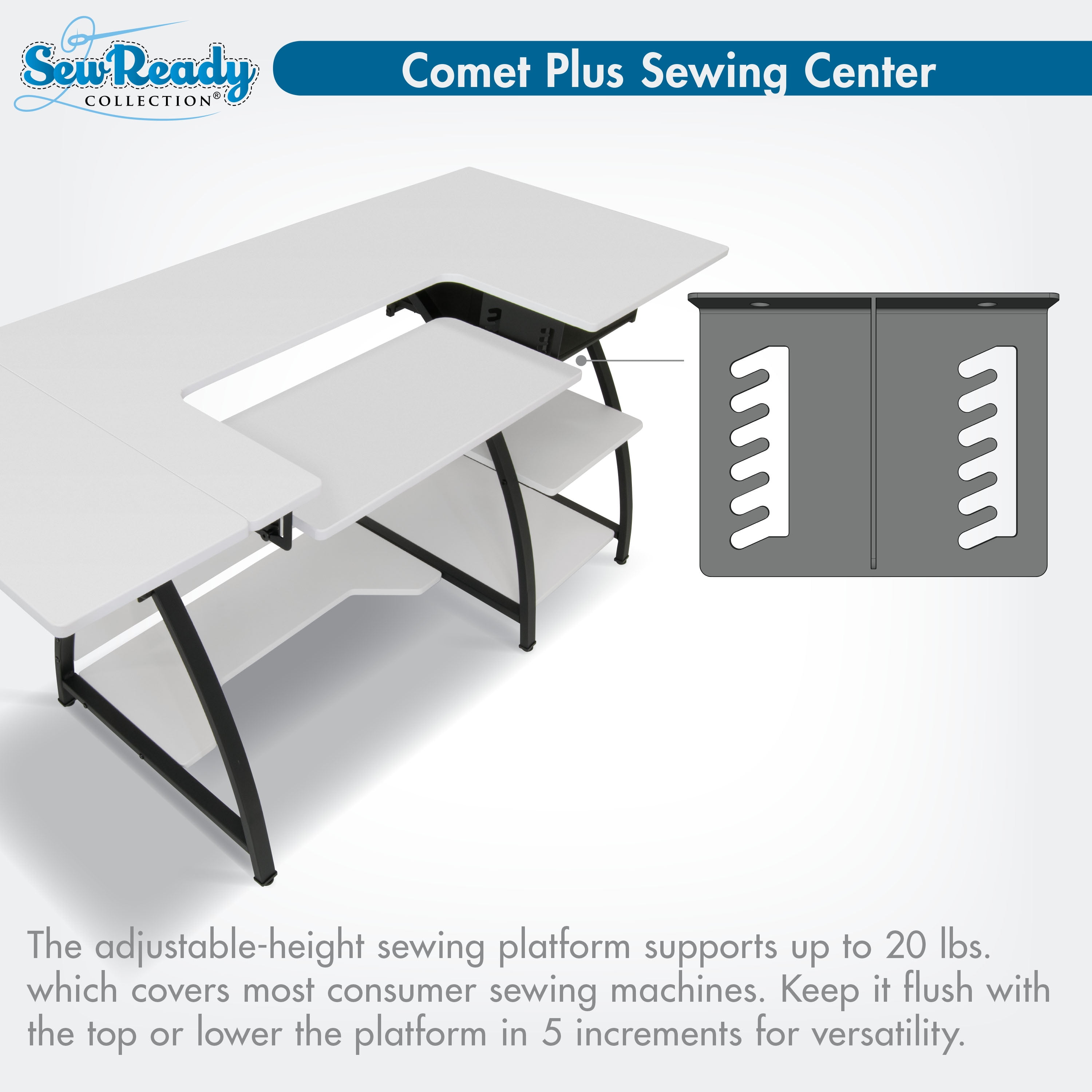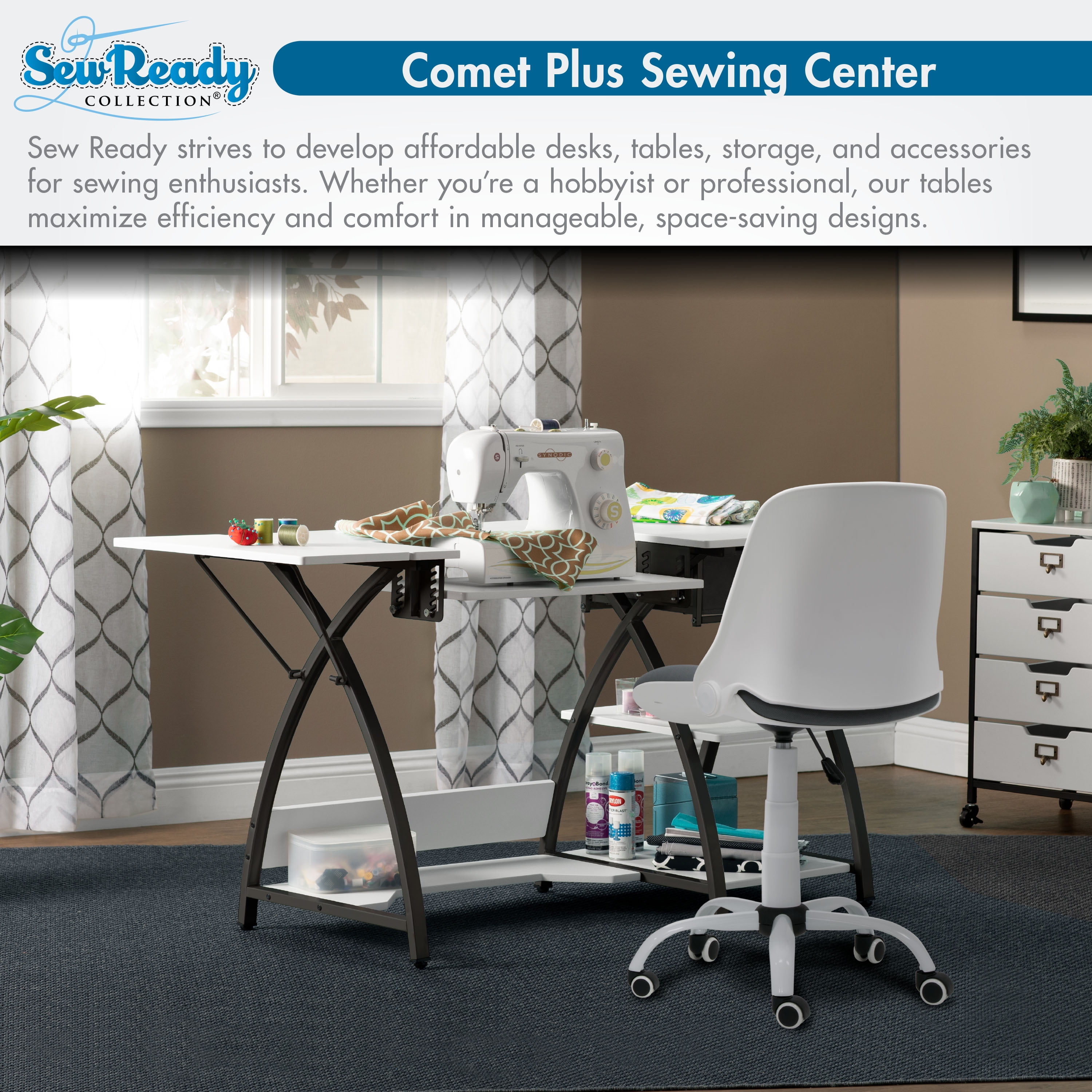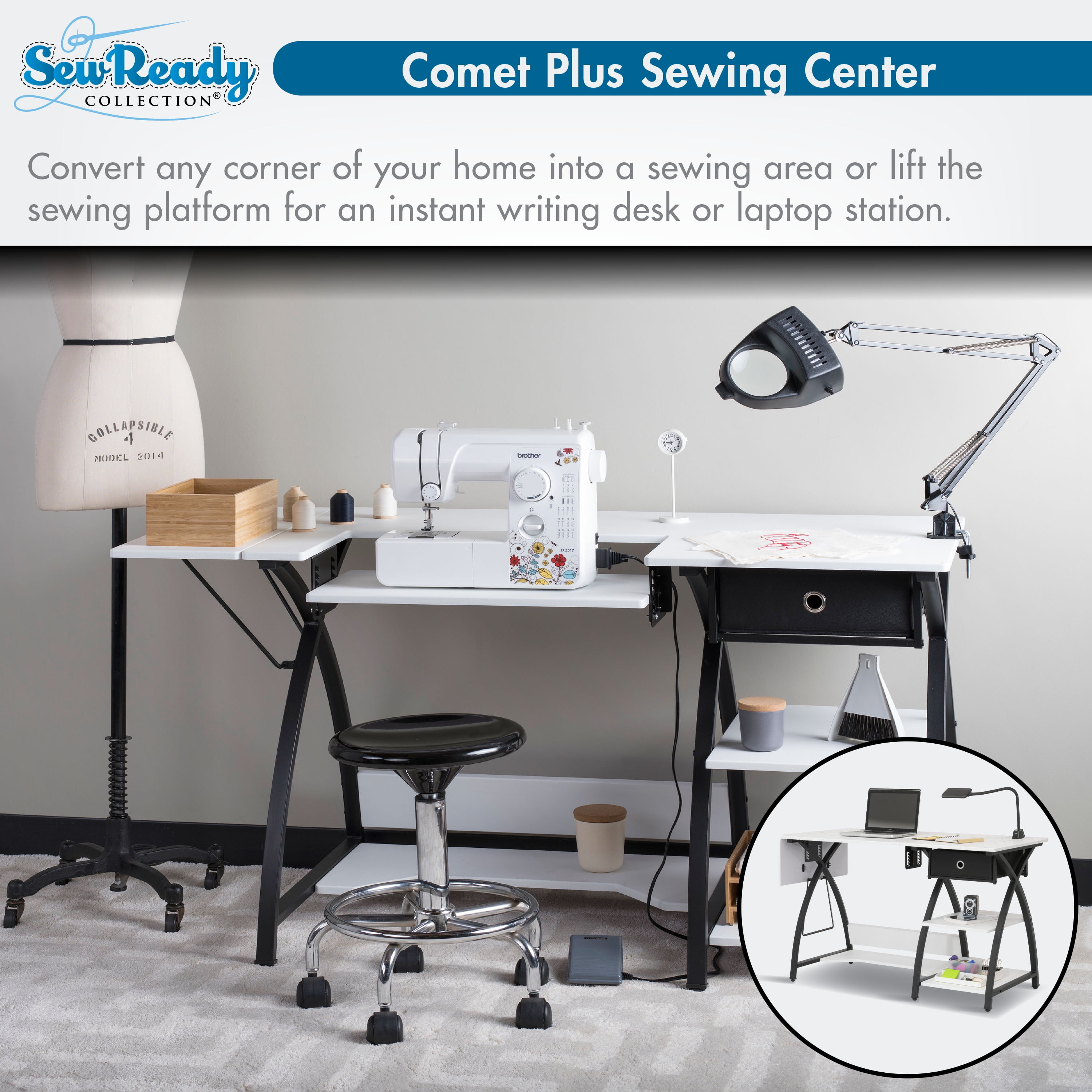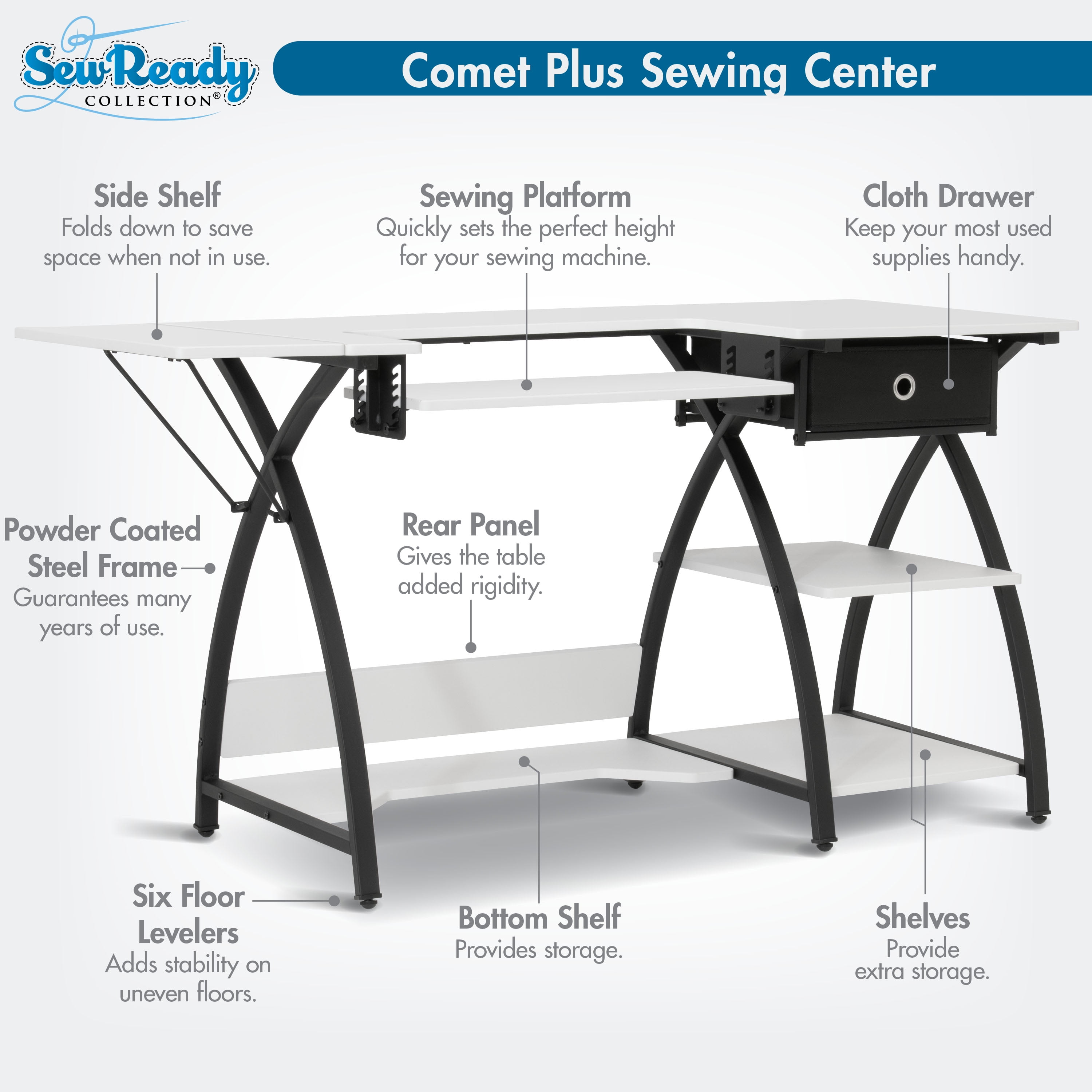 The Sew Ready Comet Plus Sewing and Crafting Desk makes finding a place to create easier than ever. Designed with a spacious 56.75” W tabletop and a foldable 9.5″ W x 23.5″ D shelf, this sewing machine desk creates the perfect space for spreading out art supplies as you create, sew, cut fabric, adjust patterns, and work on different hobbies. Organize your sewing supplies and keep them handy with the storage shelves and the convenient cloth drawer. This sewing desk features a unique platform shelf that lowers and raises so you can use a variety of sewing machines and height levels. The sewing station also serves as an office desk with enough room for a laptop and computer monitors. Make your space your own with the Sew Ready Comet Hobby Center.