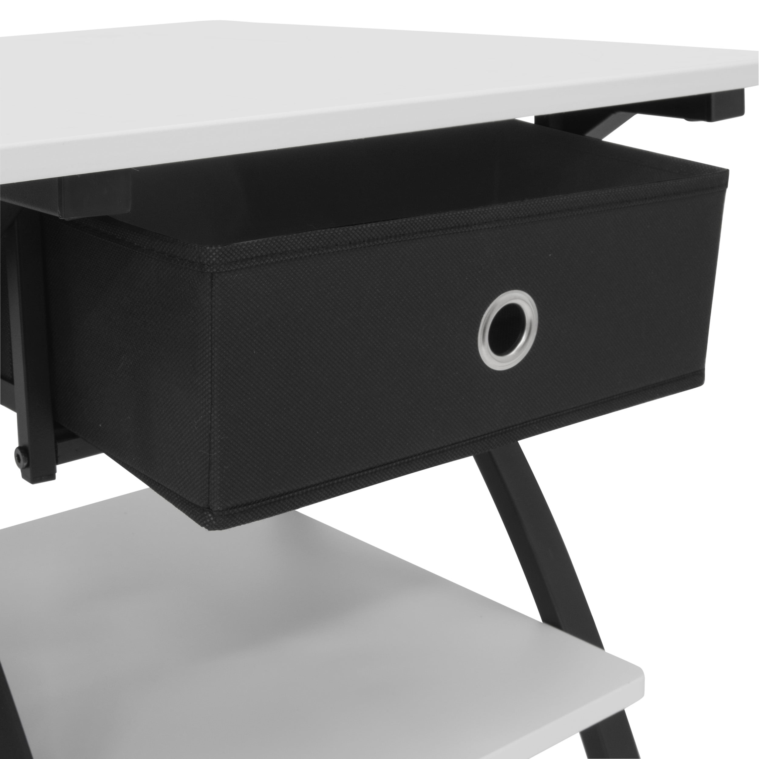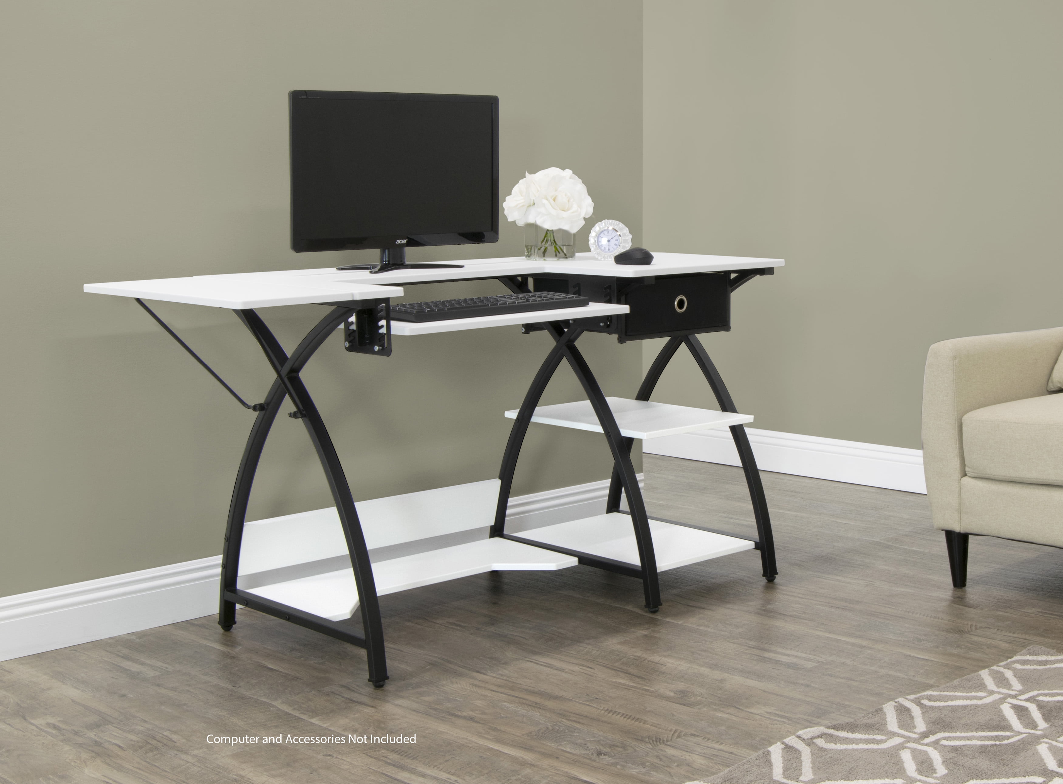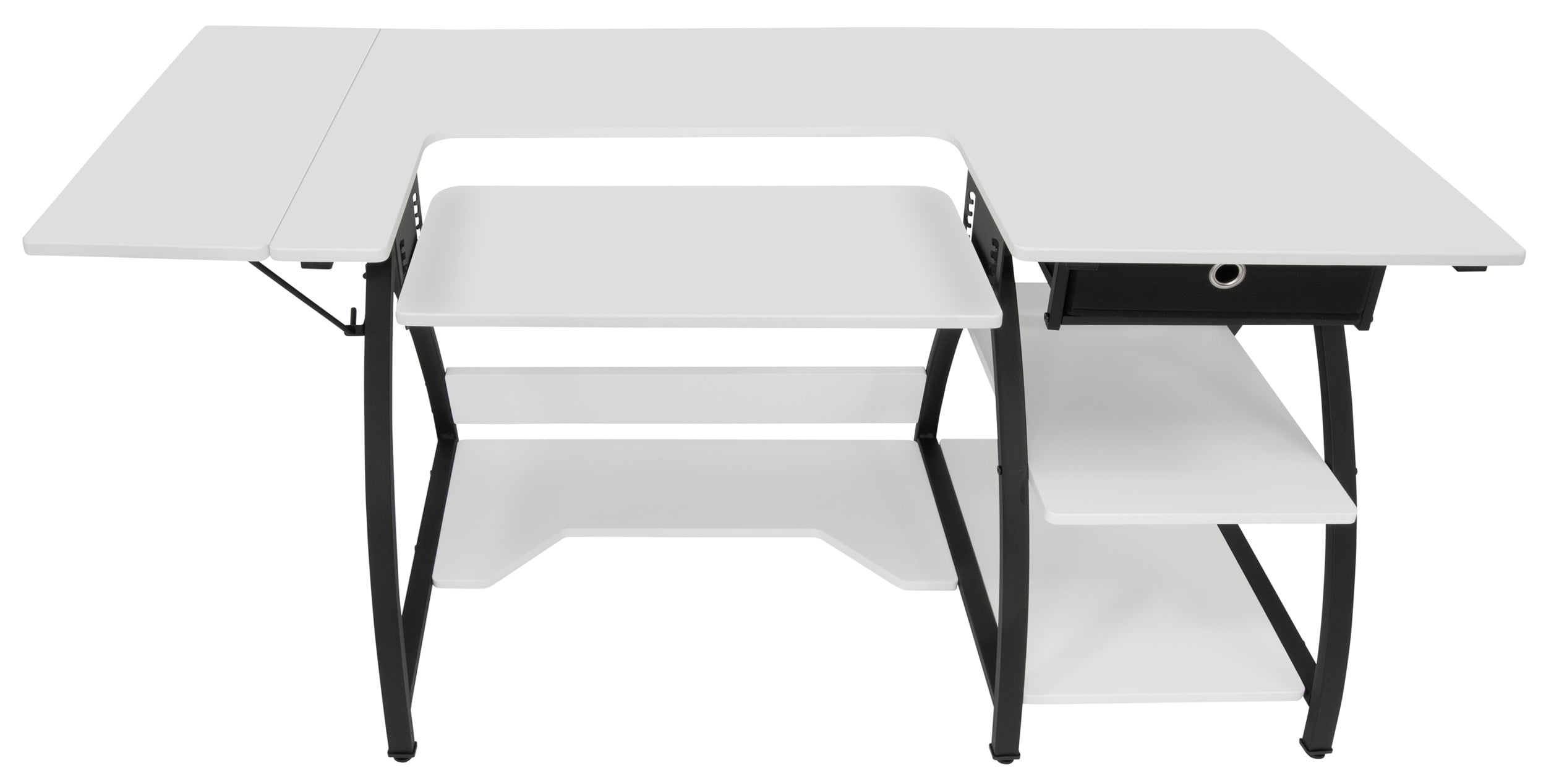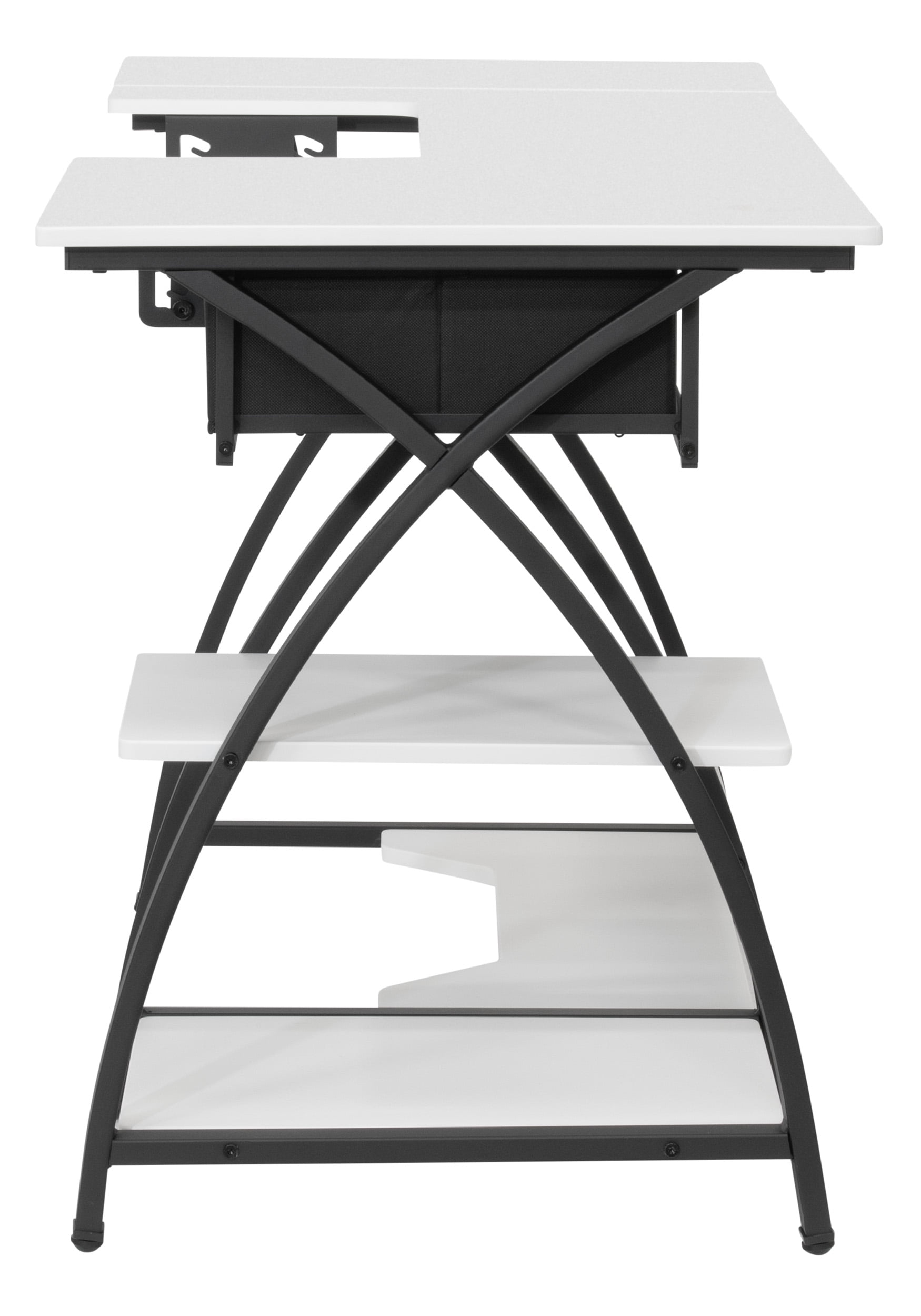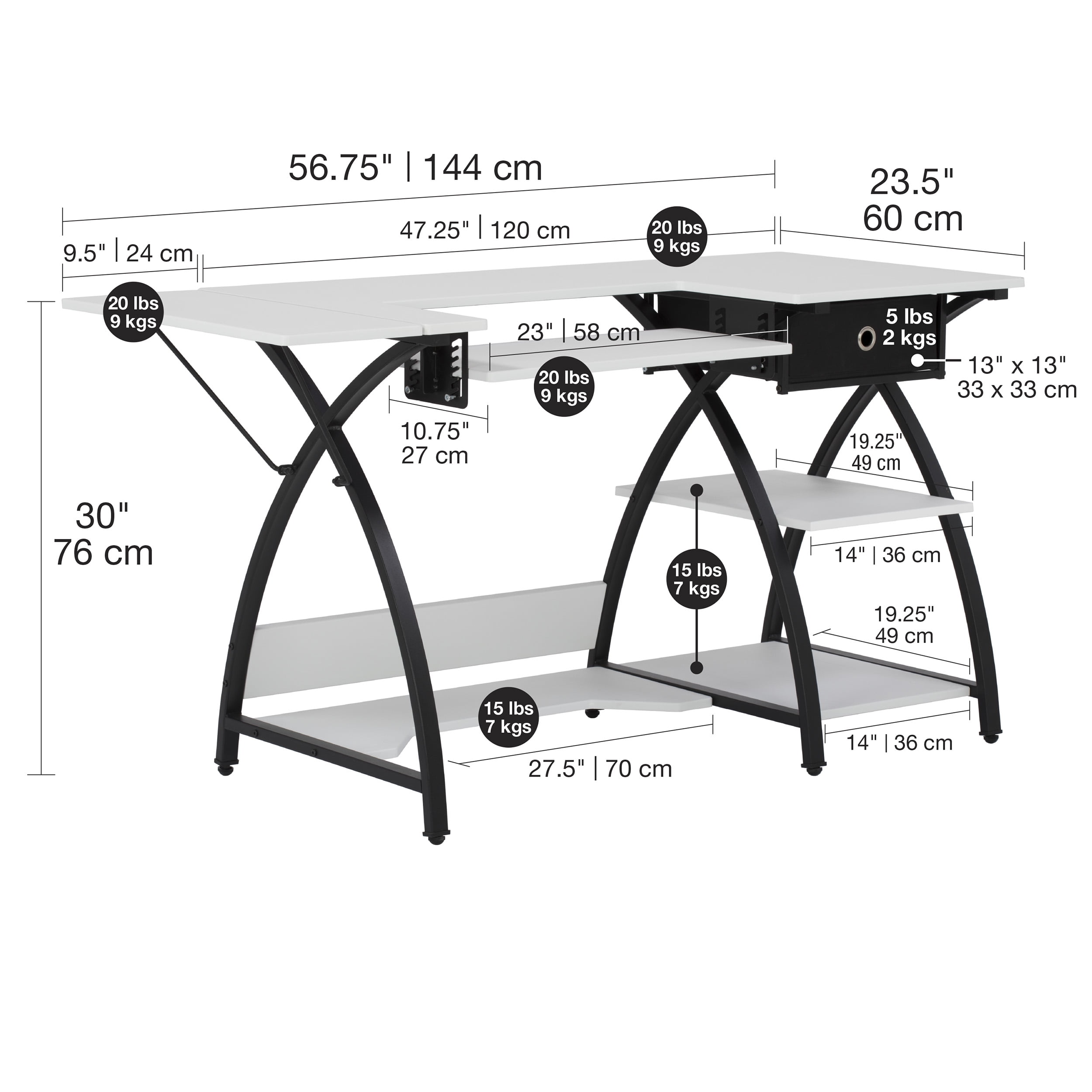 The Sew Ready Comet Plus Sewing and Crafting Desk makes finding a place to create easier than ever. Designed with a spacious 56.75” W tabletop and a foldable 9.5″ W x 23.5″ D shelf, this sewing machine desk creates the perfect space for spreading out art supplies as you create, sew, cut fabric, adjust patterns, and work on different hobbies. Organize your sewing supplies and keep them handy with the storage shelves and the convenient cloth drawer. This sewing desk features a unique platform shelf that lowers and raises so you can use a variety of sewing machines and height levels. The sewing station also serves as an office desk with enough room for a laptop and computer monitors. Make your space your own with the Sew Ready Comet Hobby Center.