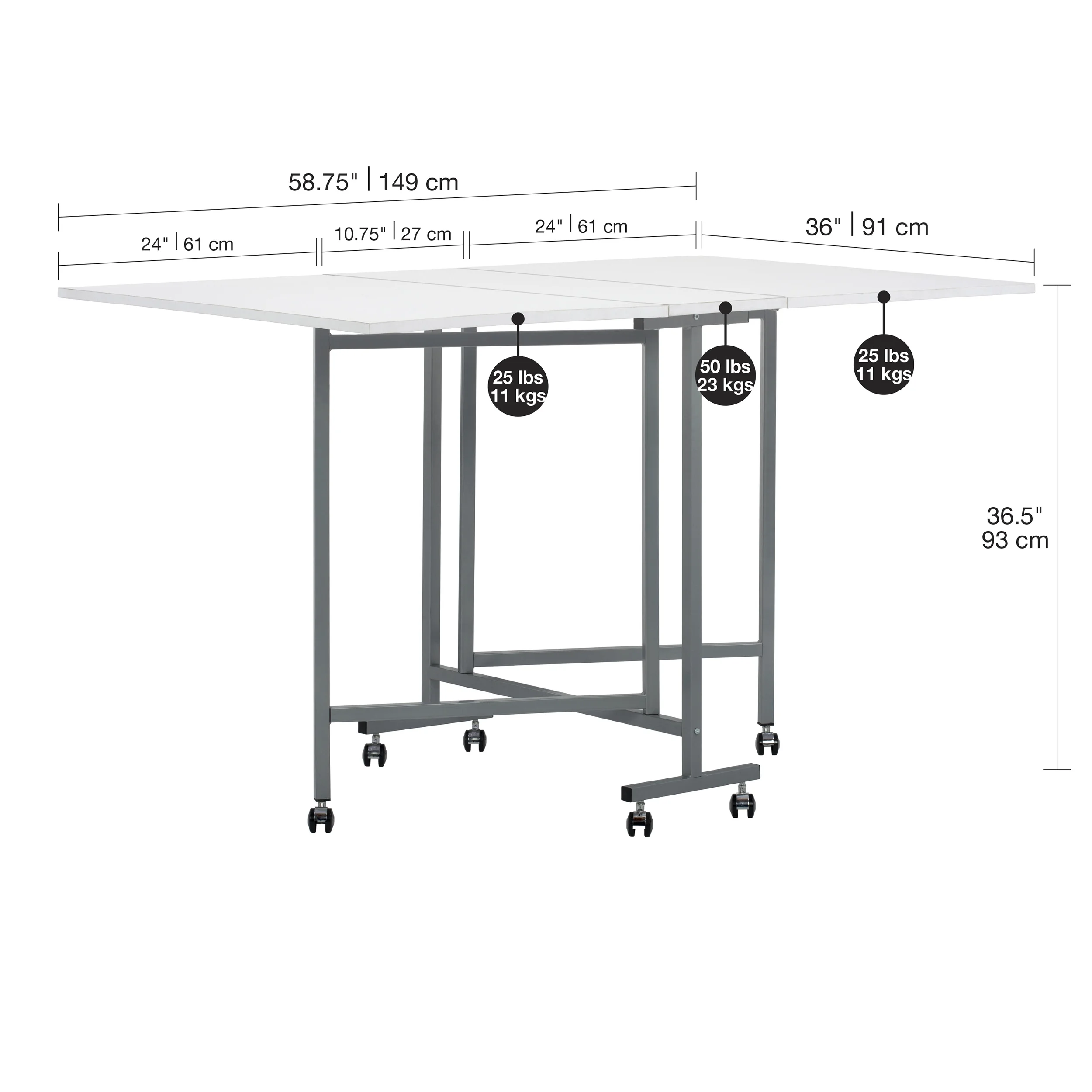 Overall Dimensions: 58.75″ W x 36.5″ D x 36.5″ H ALL-IN-ONE ADJUSTABLE WORK TABLE: A folding desk that easily extends to 58-3/4″ wide with two 24″ W x 36.5″ D folding panels and locking wheels for extra mobility VERSATILE FOLDING TABLE: Can be used as a work table, sewing table, cutting mat, drafting table, or as an extra work desk DURABLE TABLE FOR ARTS AND CRAFTS: Powder-coated metal frame and thick MDF tops; Includes 6 wheels for mobility, four of which lock for extra stability OVERALL DIMENSIONS: 58.75″ W x 36.5″ D x 36.5″ H; Center Panel: 10.75″ W x 36″ D; Folding Panels: 24″ W x 36″ D; folds to 12.25″ W for easy storage WEIGHT LIMITS: Center/bottom panels: 50 lbs; Side panels: 25 lbs each
