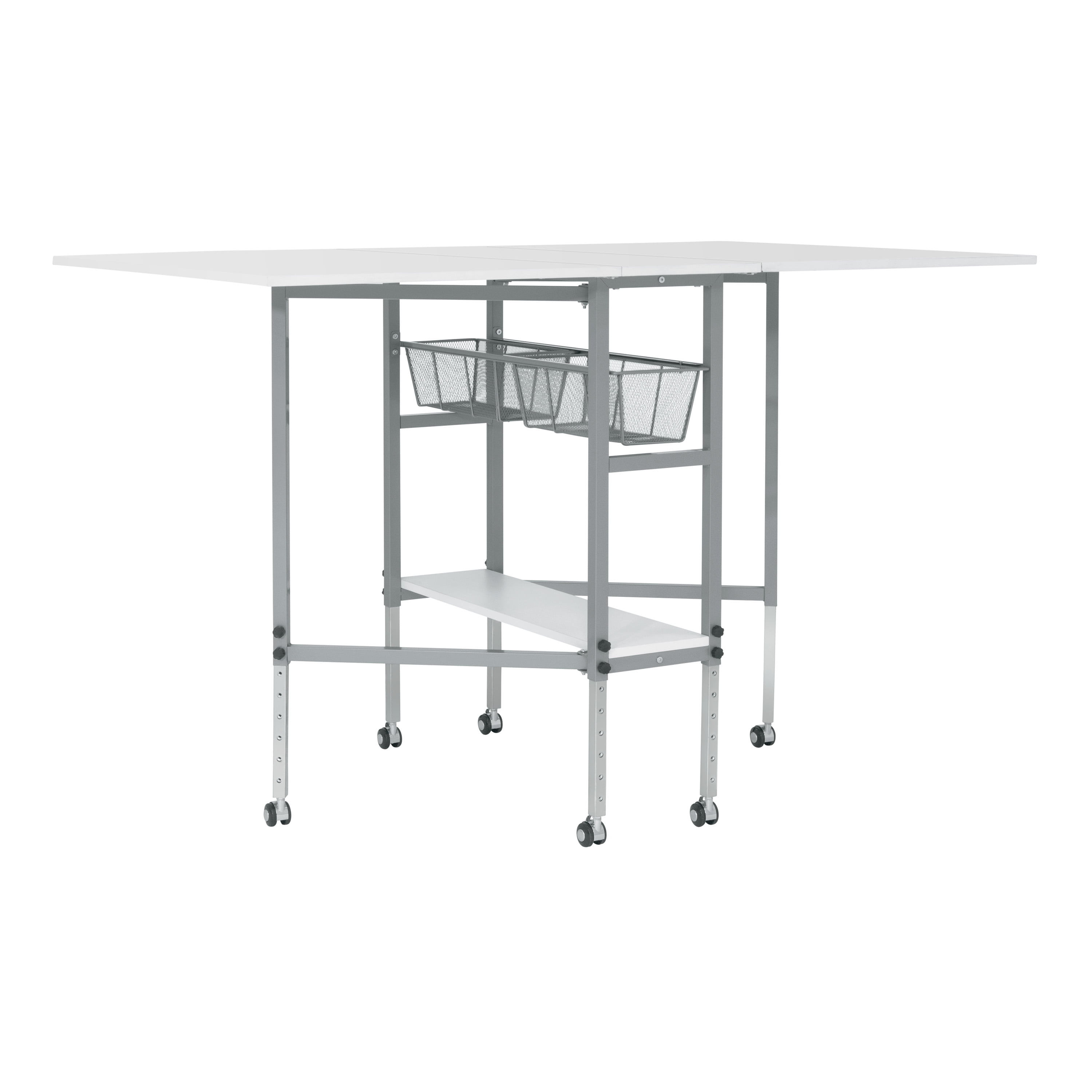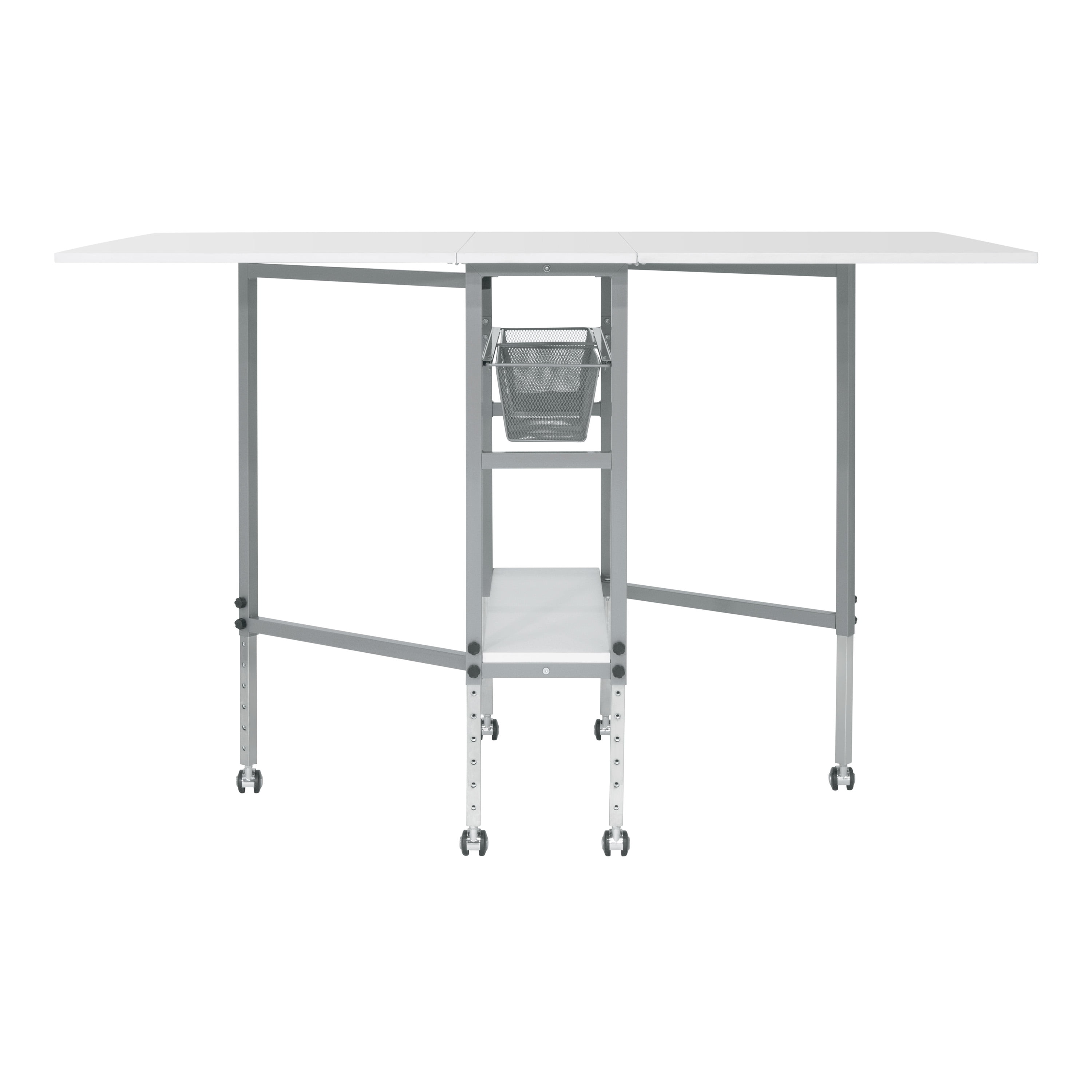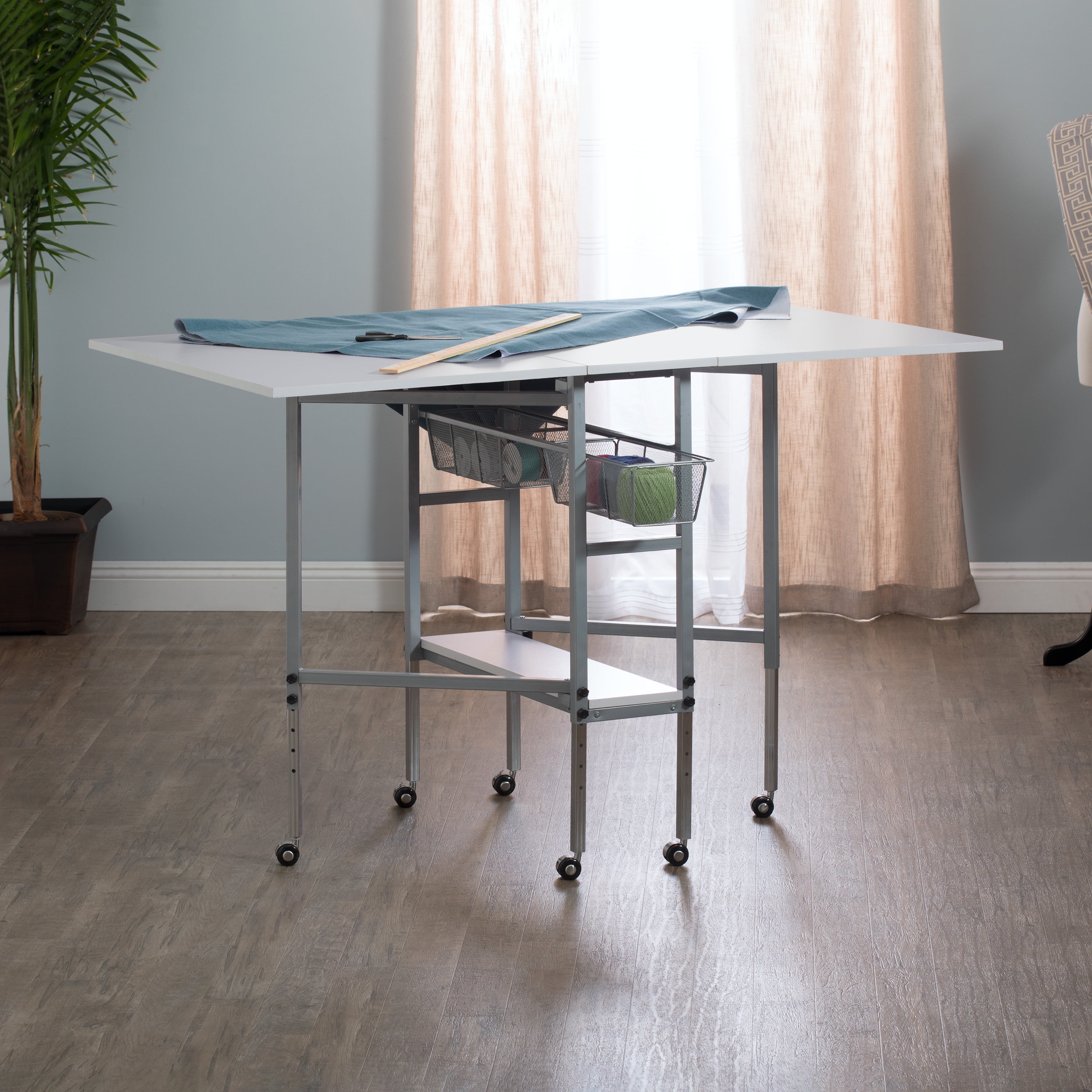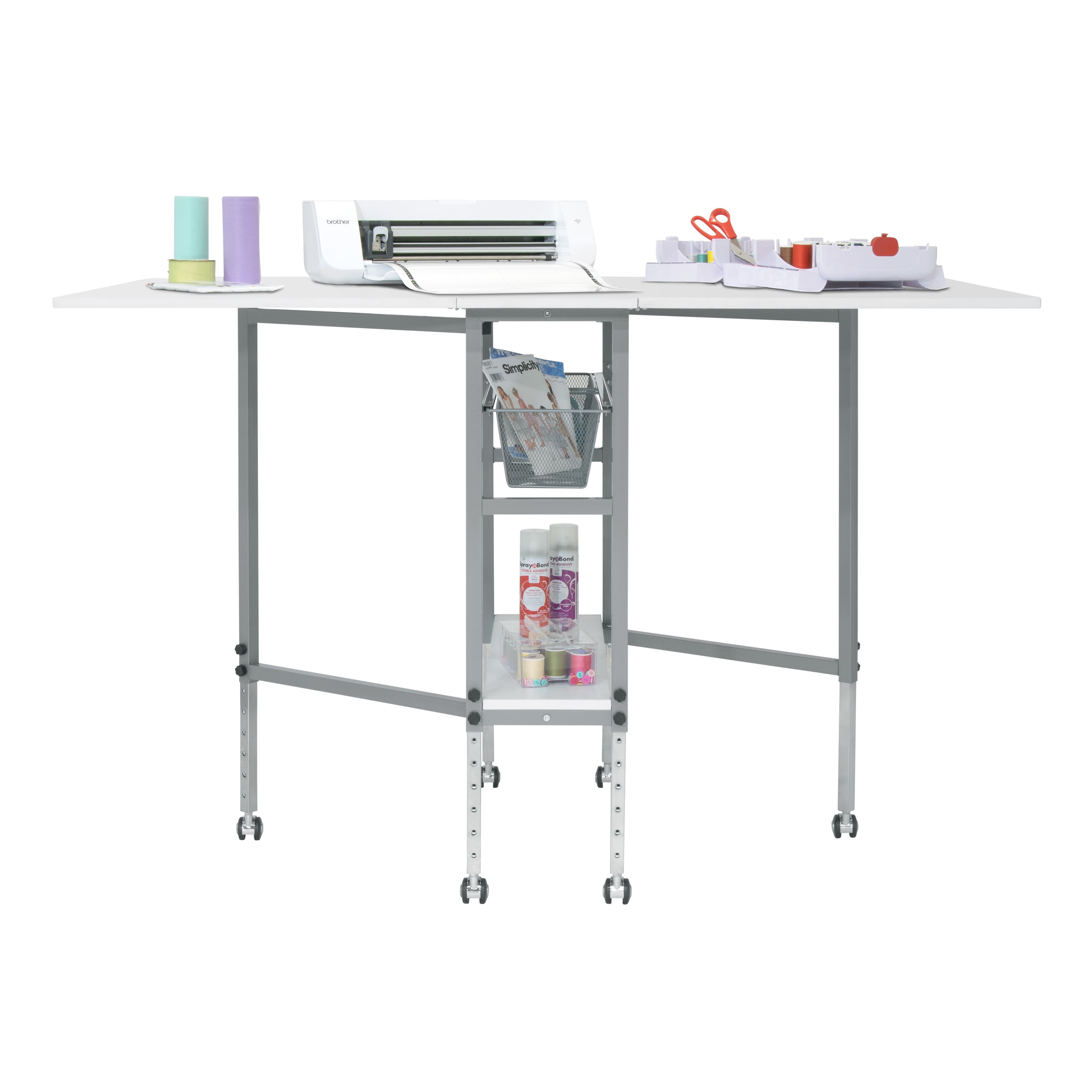 Overall Dimensions: 58.75″ W x 36.5″ D x 29.75″ – 38.75″ H ( Easily Folds to 12.25″ Wide) Weight Limit: Center and Bottom Panels: 50 lbs… ea. Side Panels: 25 lbs… ea. | Drawers: 15 lbs… ea. HOBBY & CUTTING TABLE: Stylish design features a 58.75″ wide and 36.5″ deep tabletop when fully extended; Perfect for spreading out and diving into a variety of creative projects, Including sewing, writing, crafting, and cutting fabric OFFERS STORAGE SPACE: Includes two slide-out, metal mesh storage drawers and a lower shelf, so you can store fabric, art supplies, and more without the clutter; Allows you to organize supplies and keep them close while working ADJUSTABLE TABLETOP HEIGHT: Tabletop height can be adjusted from 29.75 Inches to 38.75 Inches; Provides back relief on longer art projects and creates a versatile workspace no matter the project; Knob adjusts height in 1.5″ Increments SUSTAINABLE DESIGN: The powder-coated frame and thick tabletop make this sewing table with drawers durable and ready for years of use; Includes six floor casters for mobility and four lock for stability DIMENSIONS: OVERALL: 58.75″ W x 36.5″ D x 29.75″ – 38.75″ H (easily folds to 12.25″ W); CENTER TOP: 10.75″ W x 36.5″ D; FOLDING PANELS: 24″ W x 36.5″ D; DRAWERS: 7.75″ W x 14″ D x 4.5″ H; BOTTOM SHELF: 7.75″ W x 29.5″ D