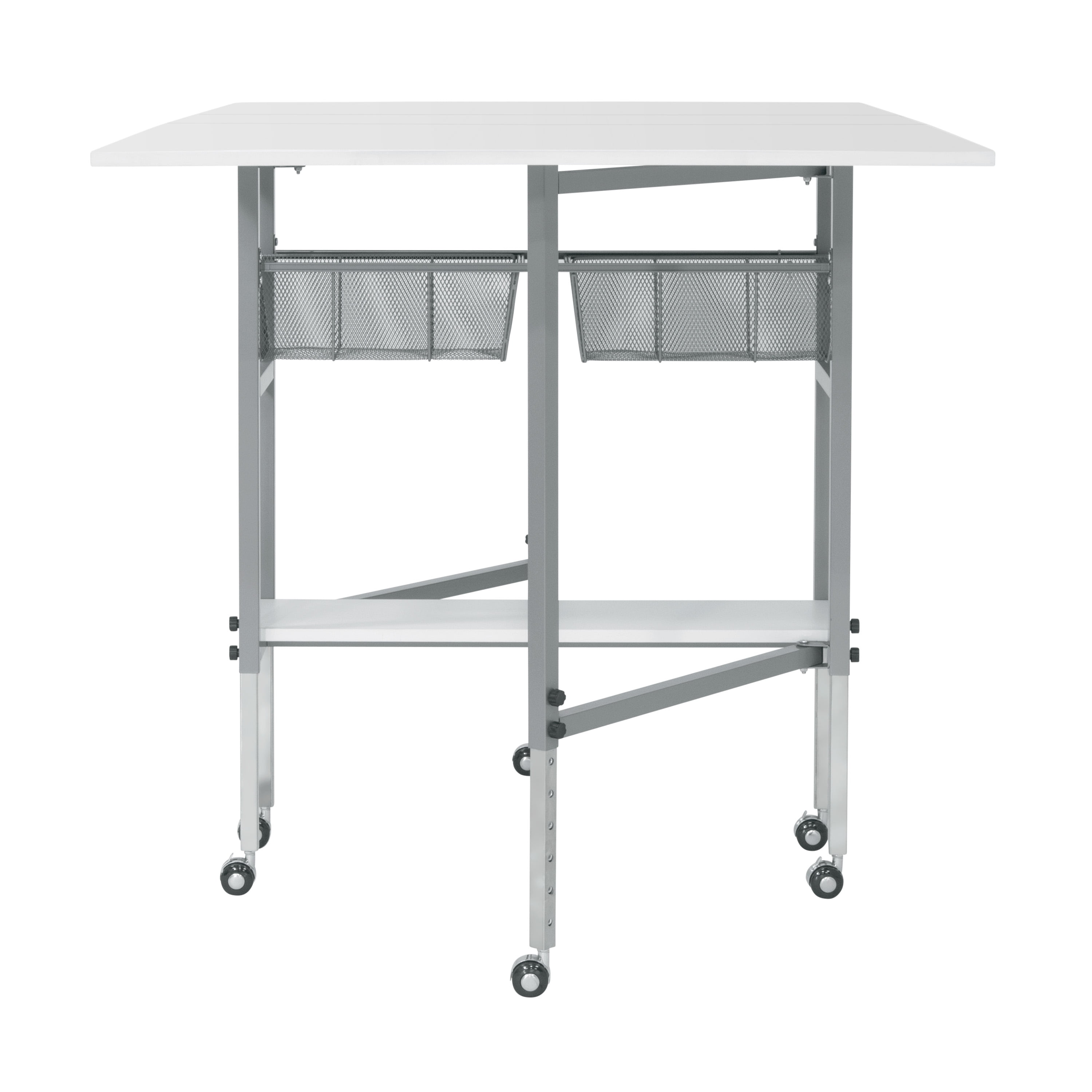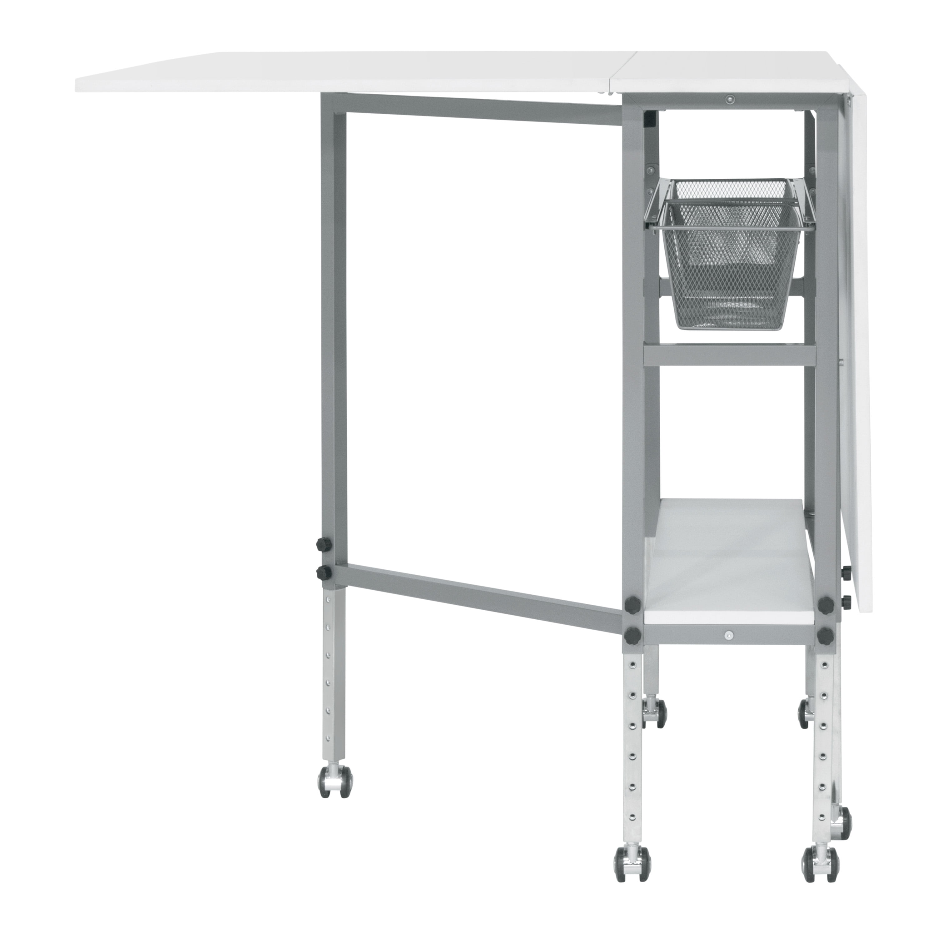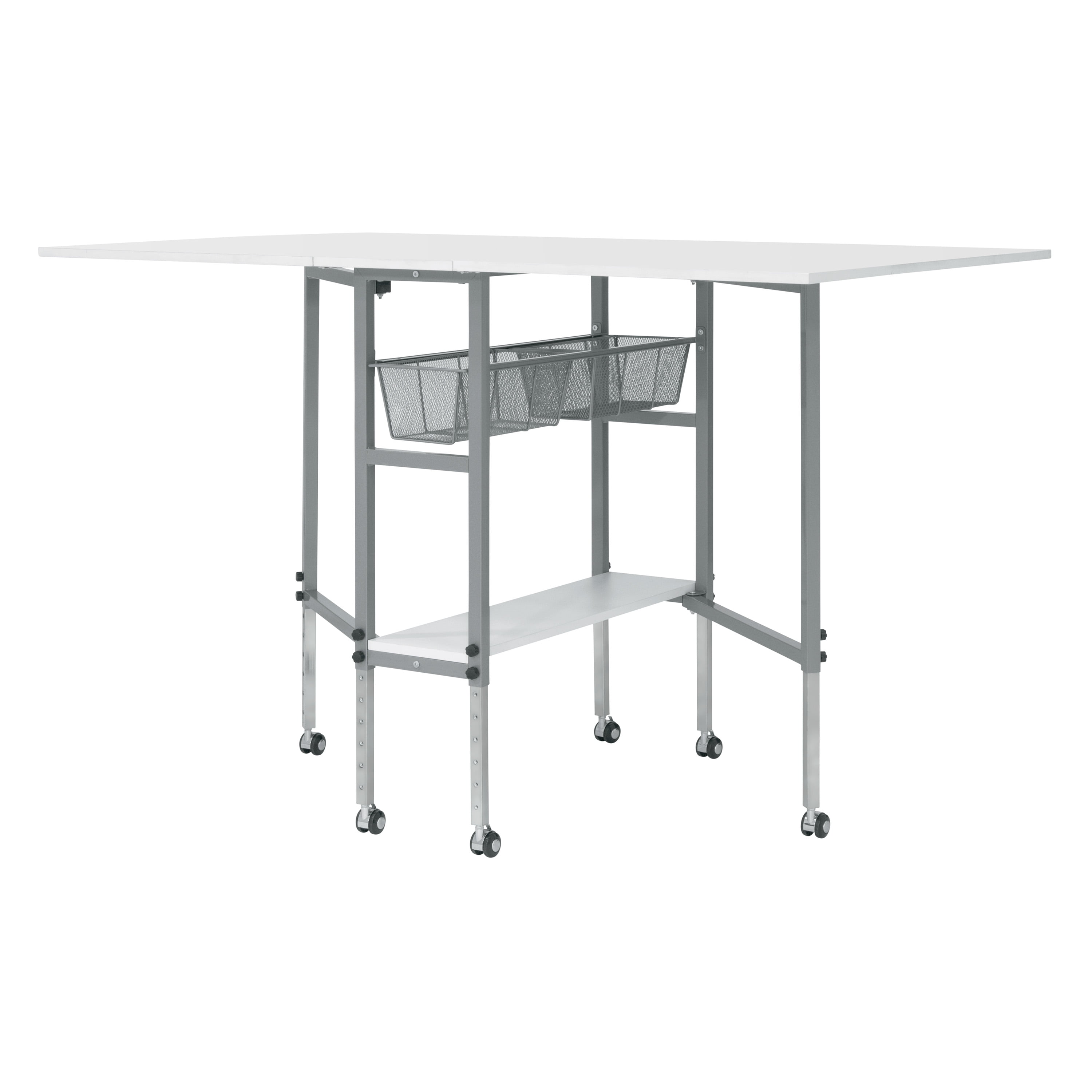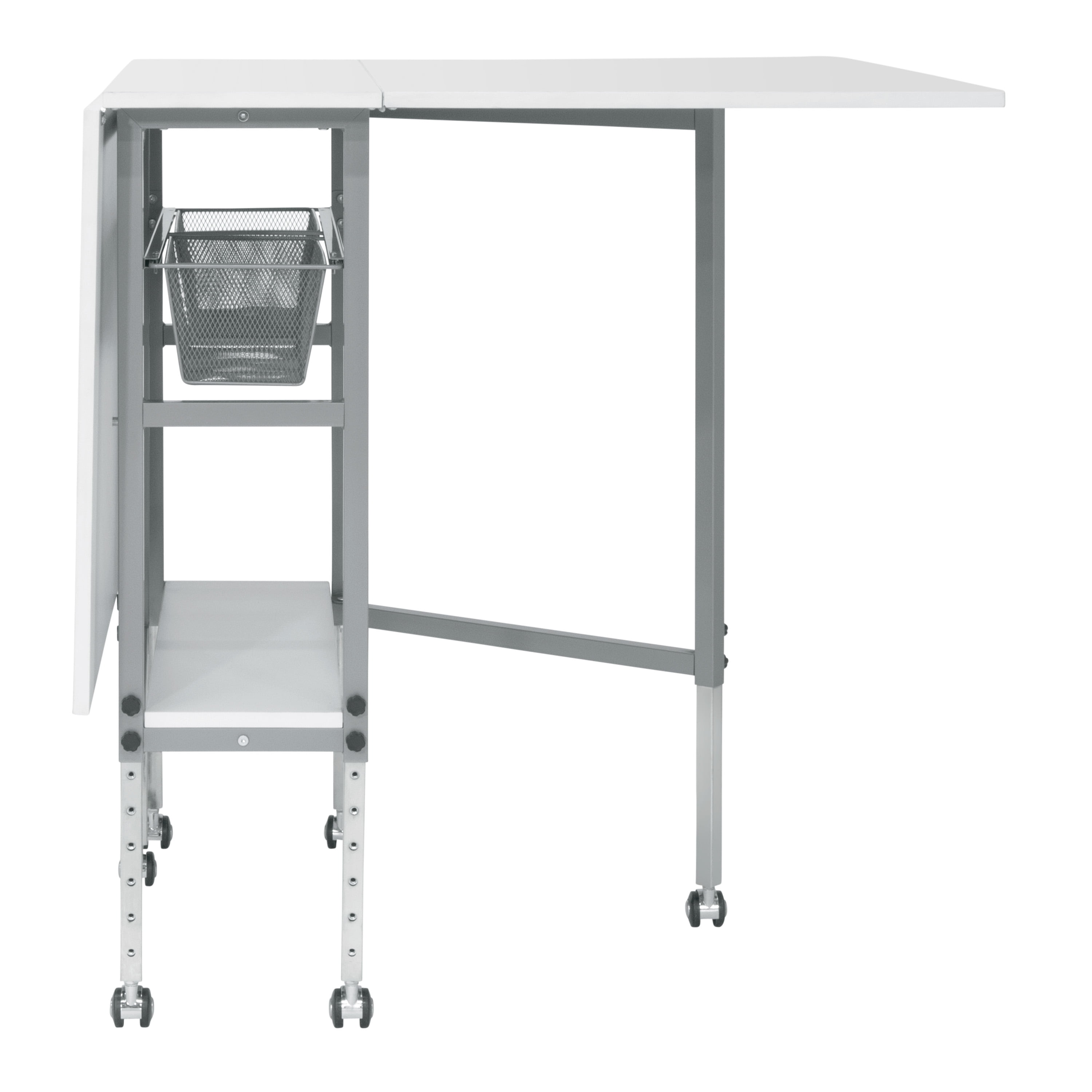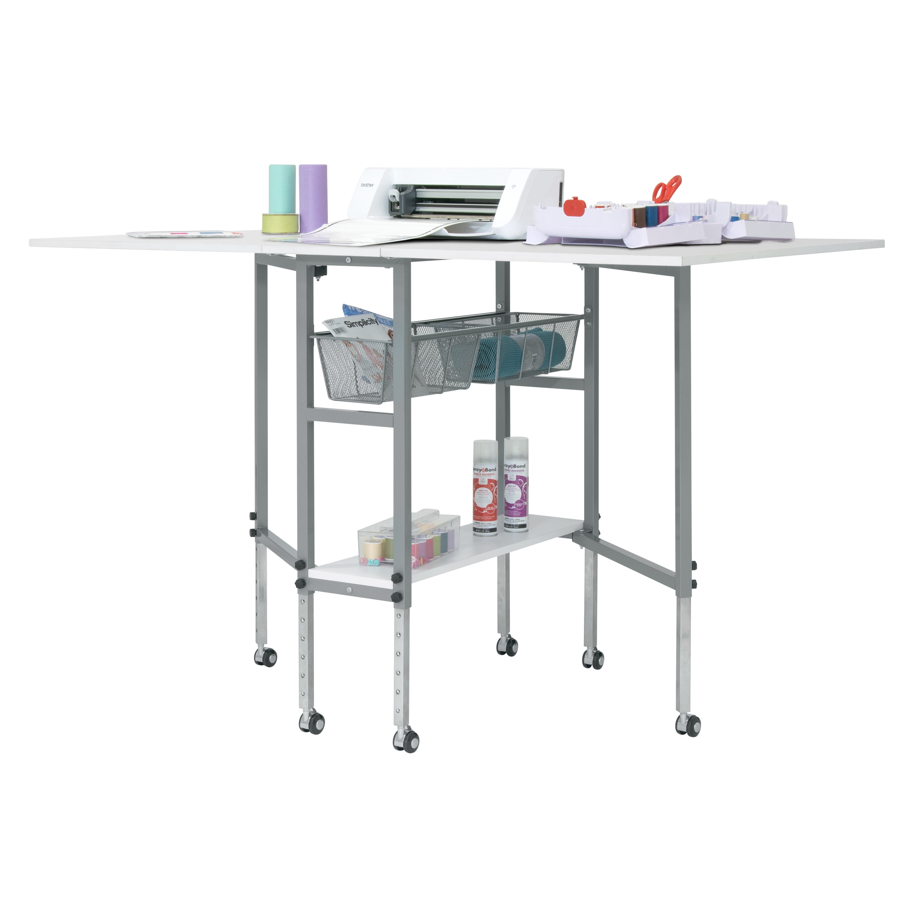 Overall Dimensions: 58.75″ W x 36.5″ D x 29.75″ – 38.75″ H ( Easily Folds to 12.25″ Wide) Weight Limit: Center and Bottom Panels: 50 lbs… ea. Side Panels: 25 lbs… ea. | Drawers: 15 lbs… ea. HOBBY & CUTTING TABLE: Stylish design features a 58.75″ wide and 36.5″ deep tabletop when fully extended; Perfect for spreading out and diving into a variety of creative projects, Including sewing, writing, crafting, and cutting fabric OFFERS STORAGE SPACE: Includes two slide-out, metal mesh storage drawers and a lower shelf, so you can store fabric, art supplies, and more without the clutter; Allows you to organize supplies and keep them close while working ADJUSTABLE TABLETOP HEIGHT: Tabletop height can be adjusted from 29.75 Inches to 38.75 Inches; Provides back relief on longer art projects and creates a versatile workspace no matter the project; Knob adjusts height in 1.5″ Increments SUSTAINABLE DESIGN: The powder-coated frame and thick tabletop make this sewing table with drawers durable and ready for years of use; Includes six floor casters for mobility and four lock for stability DIMENSIONS: OVERALL: 58.75″ W x 36.5″ D x 29.75″ – 38.75″ H (easily folds to 12.25″ W); CENTER TOP: 10.75″ W x 36.5″ D; FOLDING PANELS: 24″ W x 36.5″ D; DRAWERS: 7.75″ W x 14″ D x 4.5″ H; BOTTOM SHELF: 7.75″ W x 29.5″ D
