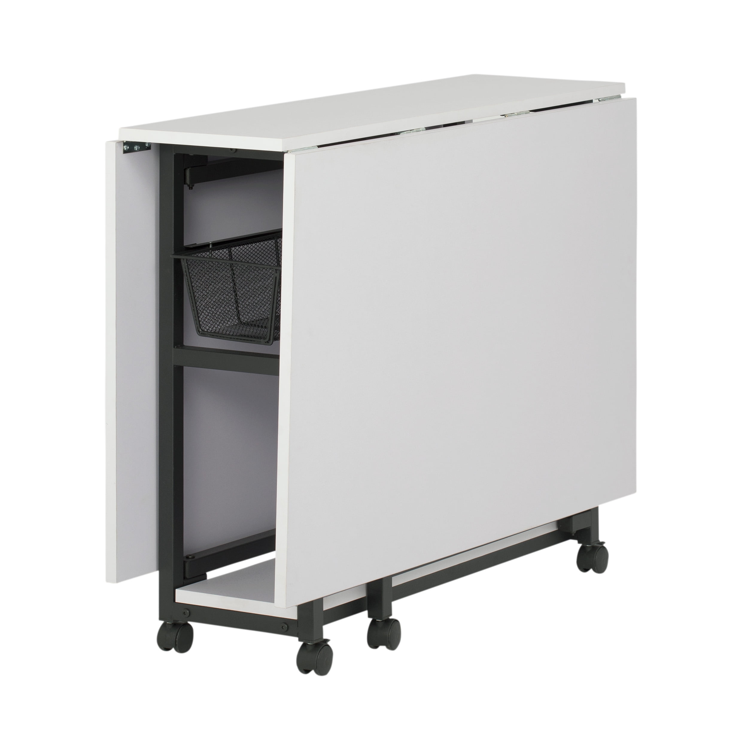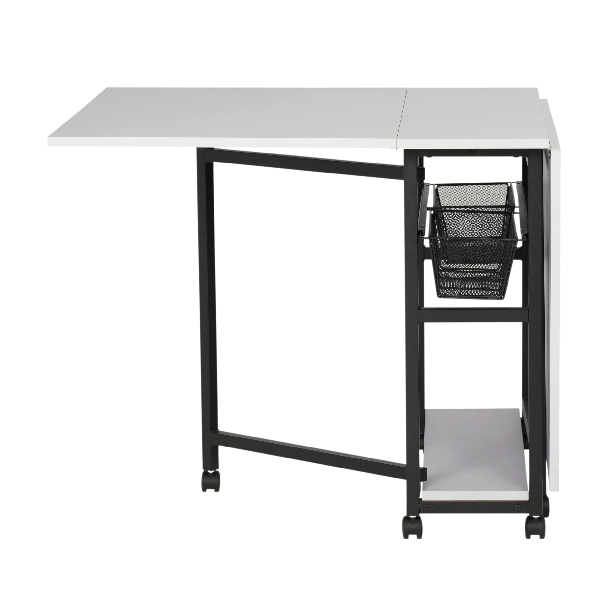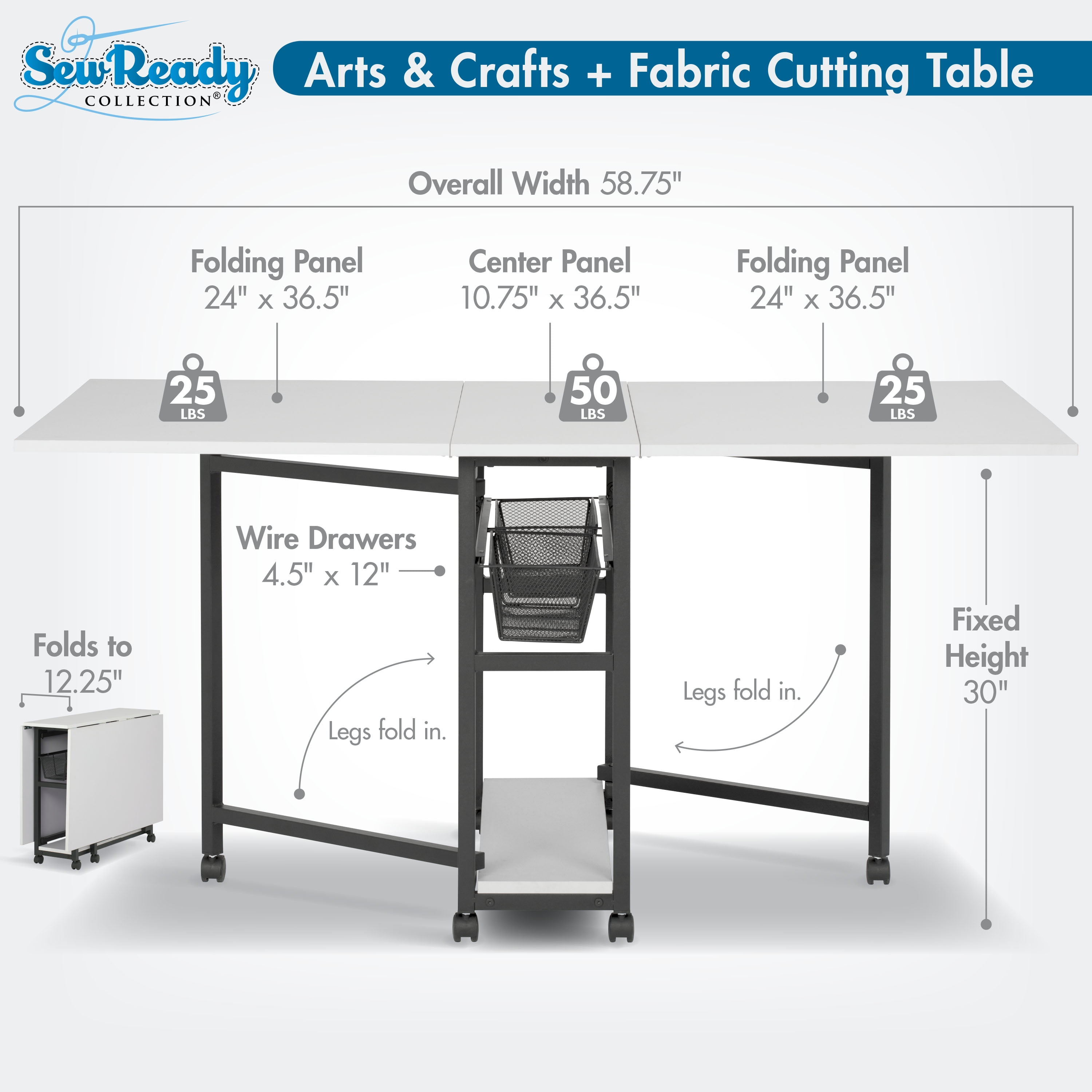 Overall Dimensions: 58.75″ W x 36.5″ D x 30″ H ALL-IN-ONE ADJUSTABLE WORK TABLE: A folding desk that easily extends to 58.75″ wide with two slide-out wire mesh drawers and a bottom shelf for sewing and art supplies storage VERSATILE FOLDING TABLE: Can be used as a work table with craft storage, sewing table, cutting mat, drafting table, or as an extra work desk; two slide out wire mesh drawers DURABLE TABLE FOR ARTS AND CRAFTS: Powder-coated metal frame and thick MDF tops; Includes 6 wheels for mobility, four of which lock for extra stability OVERALL DIMENSIONS: 58.75″ W x 36.5″ D x 30″ H; Center Panel: 10.75″ W x 36.5″ D; Folding Panels: 24″ W x 36.5″ D; folds to 12.25″ W for easy storage WEIGHT LIMITS: Center/bottom panels: 50 lbs each; Side panels: 25 lbs each; Wire baskets: 15 lbs each