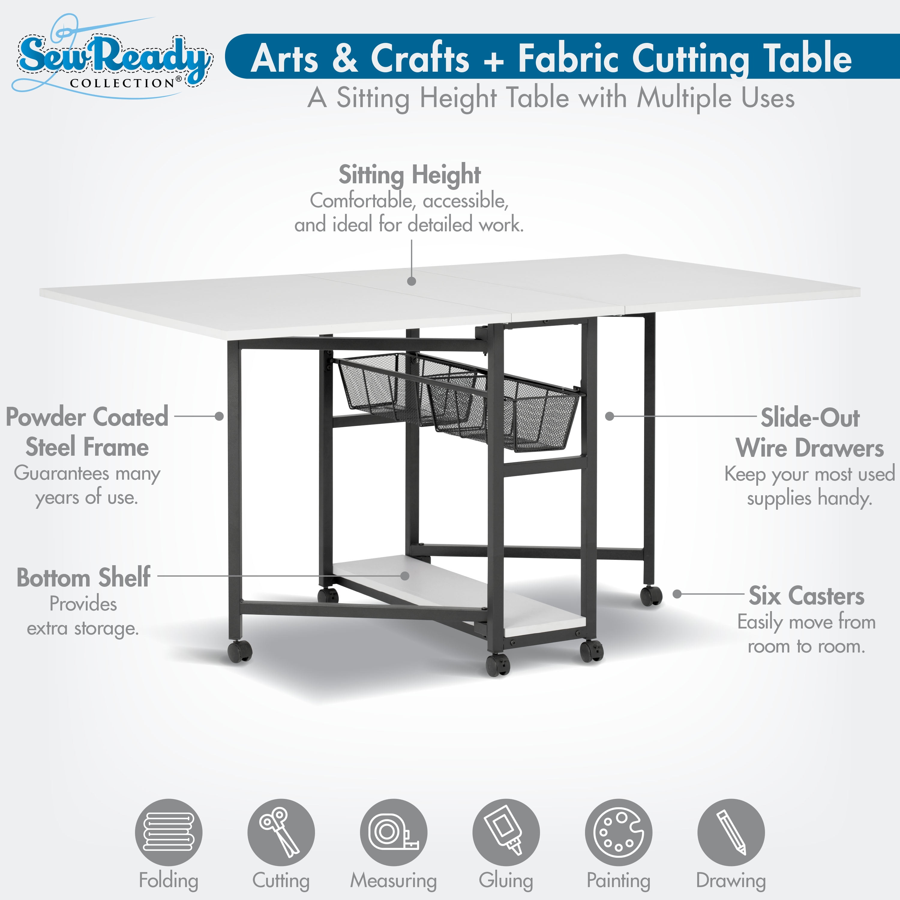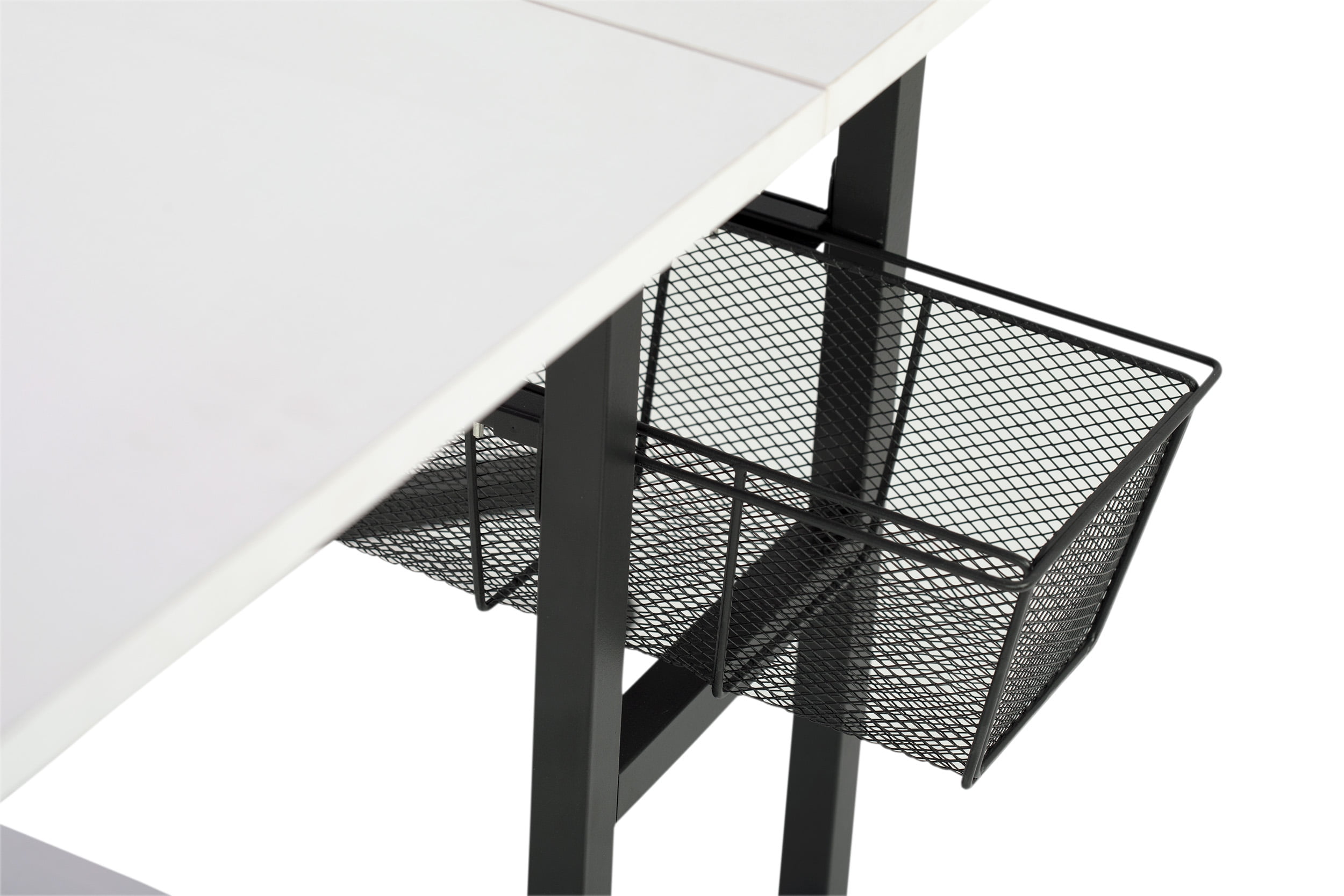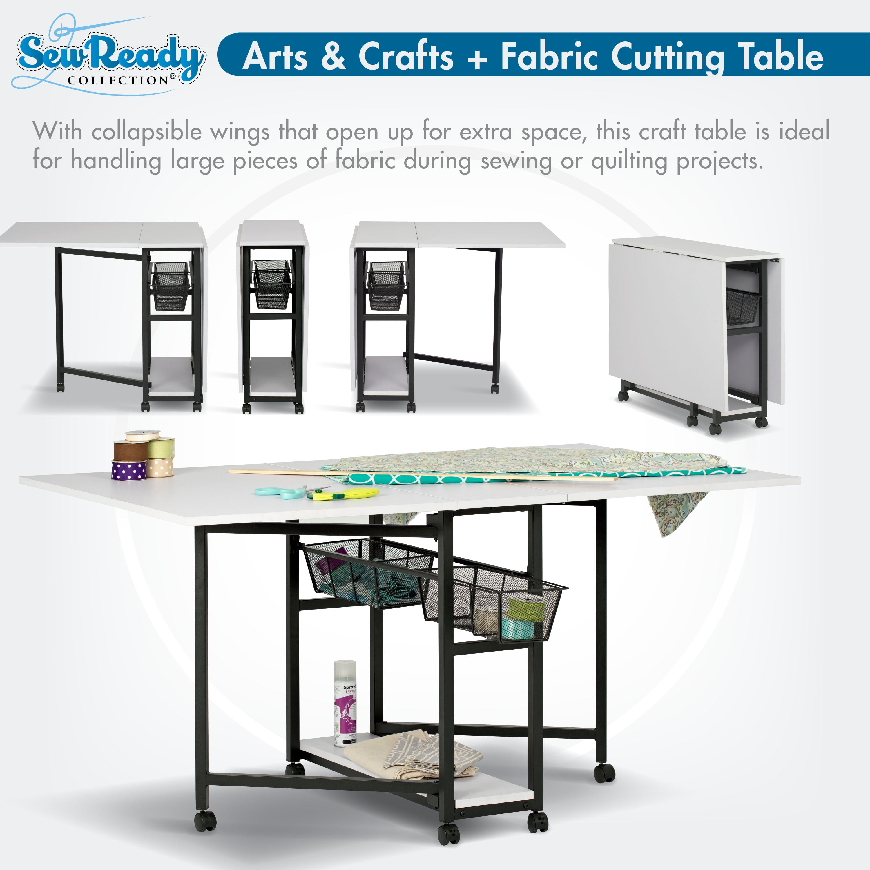 Overall Dimensions: 58.75″ W x 36.5″ D x 30″ H ALL-IN-ONE ADJUSTABLE WORK TABLE: A folding desk that easily extends to 58.75″ wide with two slide-out wire mesh drawers and a bottom shelf for sewing and art supplies storage VERSATILE FOLDING TABLE: Can be used as a work table with craft storage, sewing table, cutting mat, drafting table, or as an extra work desk; two slide out wire mesh drawers DURABLE TABLE FOR ARTS AND CRAFTS: Powder-coated metal frame and thick MDF tops; Includes 6 wheels for mobility, four of which lock for extra stability OVERALL DIMENSIONS: 58.75″ W x 36.5″ D x 30″ H; Center Panel: 10.75″ W x 36.5″ D; Folding Panels: 24″ W x 36.5″ D; folds to 12.25″ W for easy storage WEIGHT LIMITS: Center/bottom panels: 50 lbs each; Side panels: 25 lbs each; Wire baskets: 15 lbs each