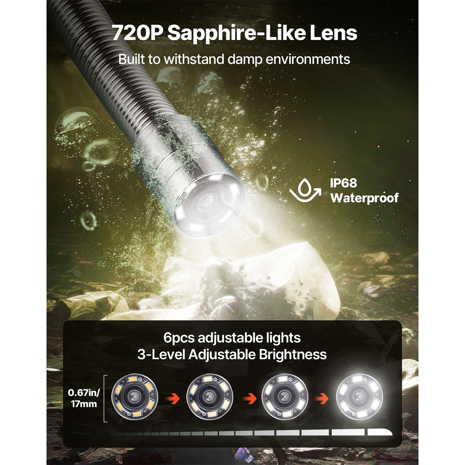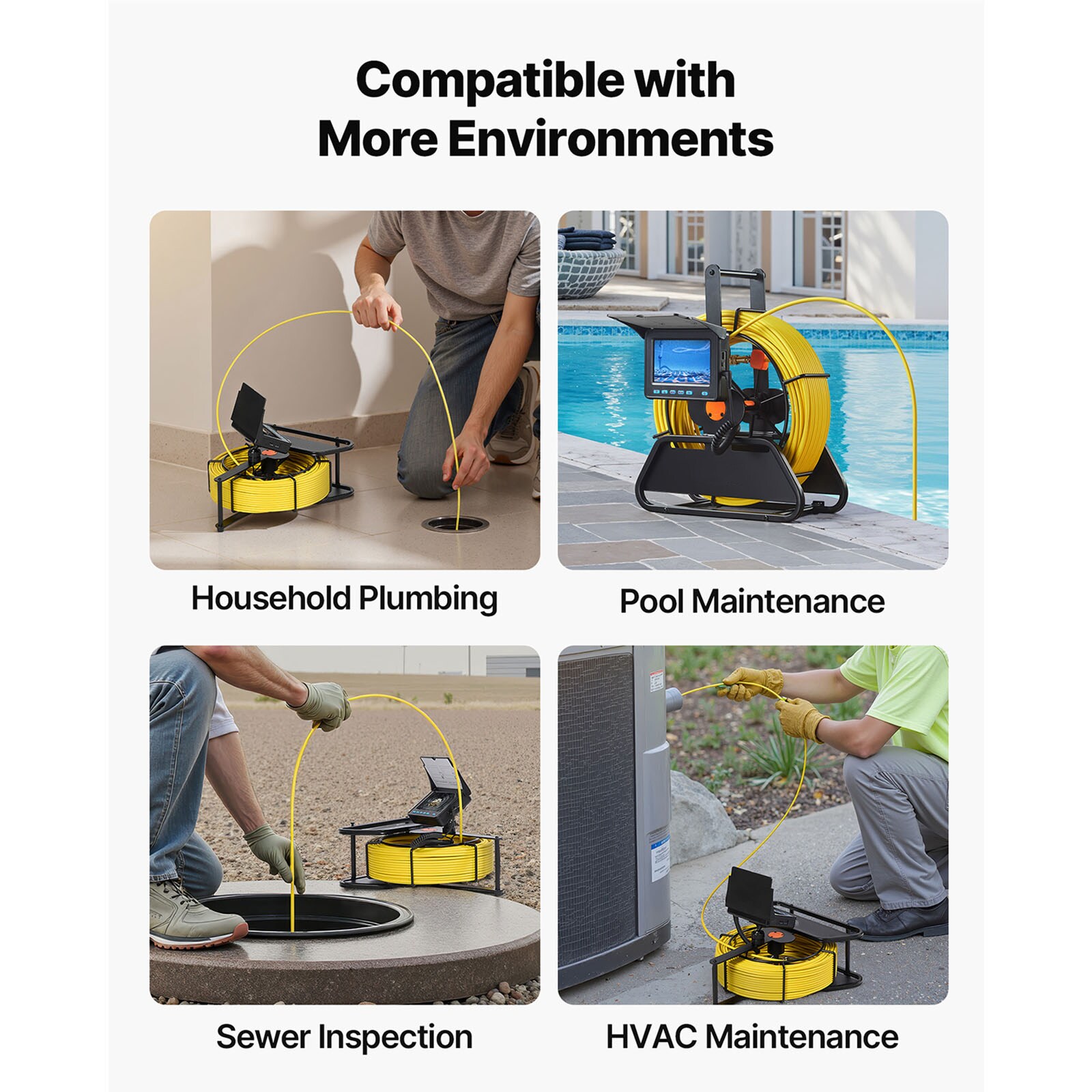 VEVOR Sewer Camera: VEVOR 164FT sewer camera makes pipe inspections faster and easier! Featuring 4.3-inch color screen, 6PCS adjustable LEDs, 4500mAh rechargeable battery, cable length markings and IP68 waterproof rating, it is ideal for pool pipeline inspections, sewer systems, HVAC maintenance, and more;; [Package Content] 1 x Display Monitor; 1 x Camera Probe; 1 x USB Type-C Cable; 1 x Lens Protection Cover; 1 x Cable Guide Wheel; 1 x Screwdriver; 1 x User Manual; 1 x Small Protective Cap; 1 x Support Bracket