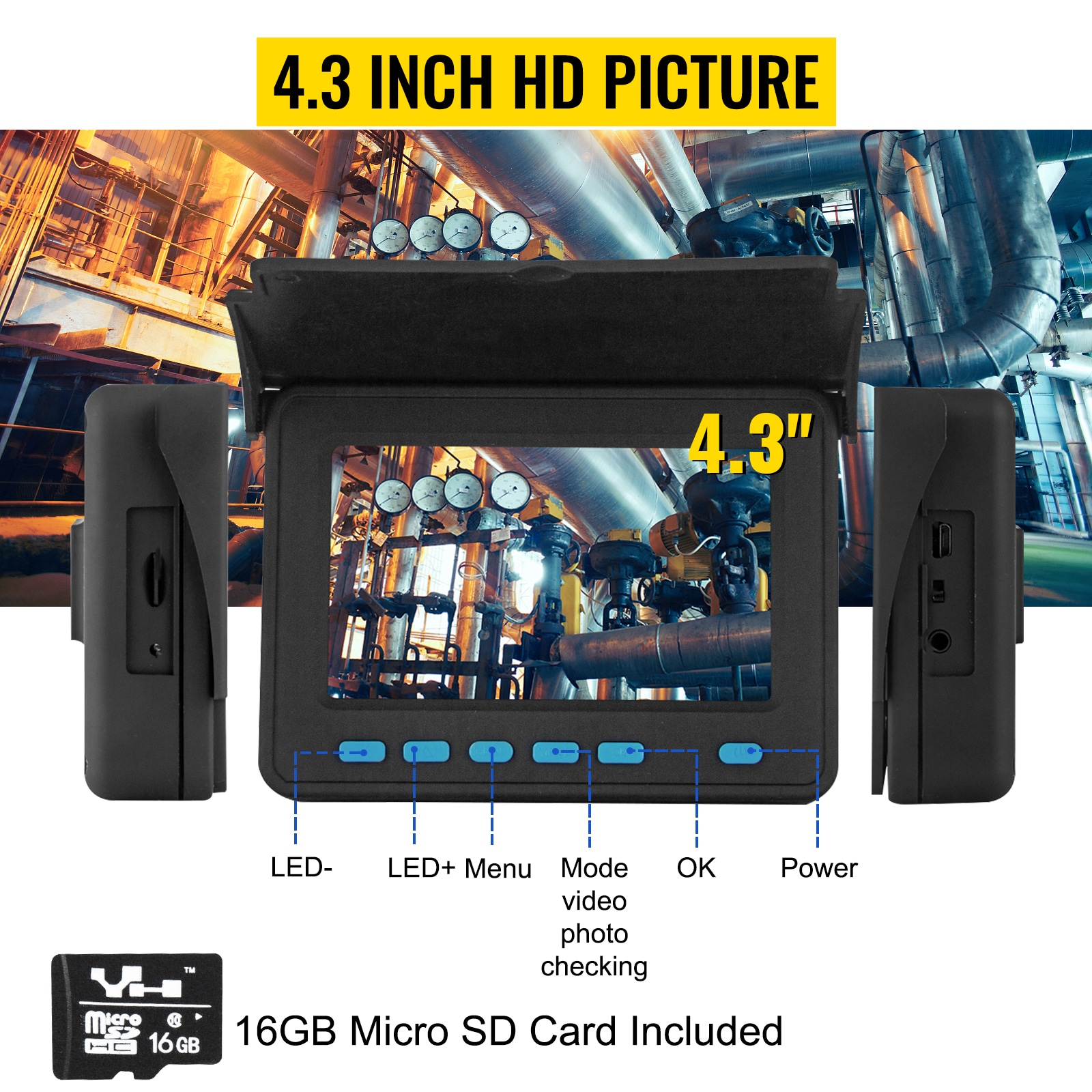 Pipe Inspection Camera: 14 Hours and Adjustable Light and 16GB SD Card; These inspection devices can reach and explore spots in wastewater systems, stormwater systems, pipelines of different kinds, drains, ducts, and other hard-to-see areas; Our professional sewer snake camera will satisfy both industrial and home needs with so many outstanding features (4.3-inch 1200TVL color monitor, stainless steel IP 68 camera, powerful and long-lasting battery, extra-long cable, etc.); 4.3 inch Color TFT LCD Screen; Waterproof Camera and 6 LEDs; 65.6ft Cable and Handy Cable Reel; 8500mAh Lithium Battery; [Package Content] 1 x Pipe Inspection Camera; 1 x LCD Monitor; 1 x Cable Wheel; 1 x Accessories Kit (1 x Camera Cover, 1 x Charger, 1 x Screwdriver, 1 x SD Card)