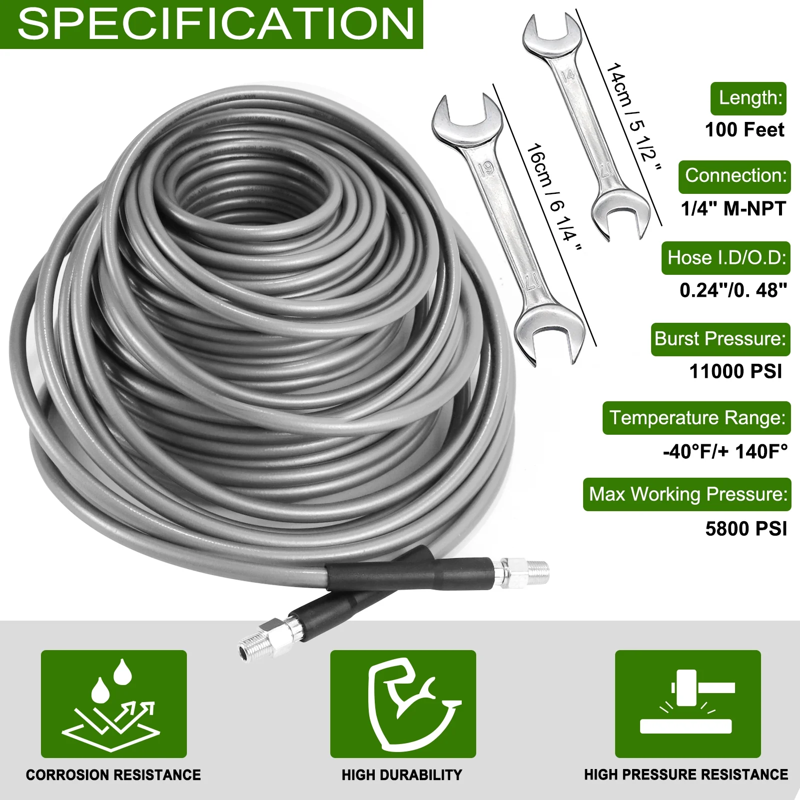 Sewer Jetter Kit 100FT for Pressure Washer, 5800PSI Drain Cleaner Hose 1/4 Inch NPT Corner Rotating and Button Nose Sewer Jetting Nozzle Spanner Waterproof Tape(Gray Hose)