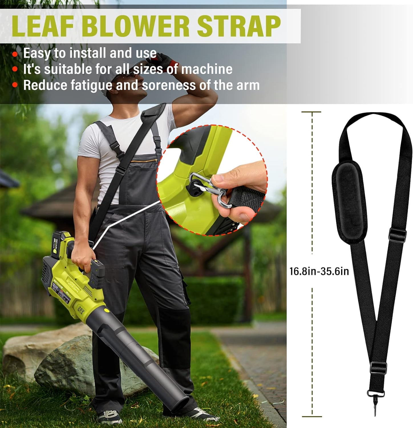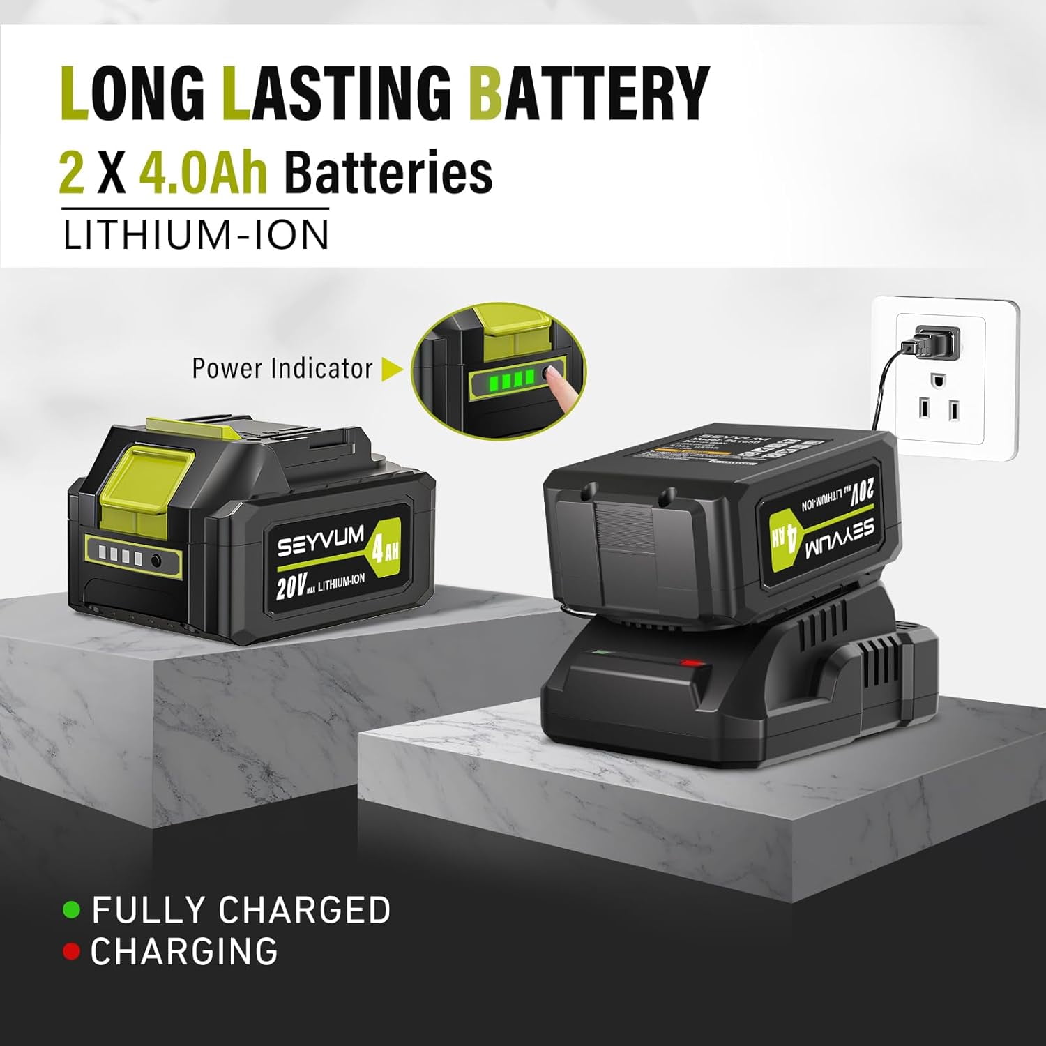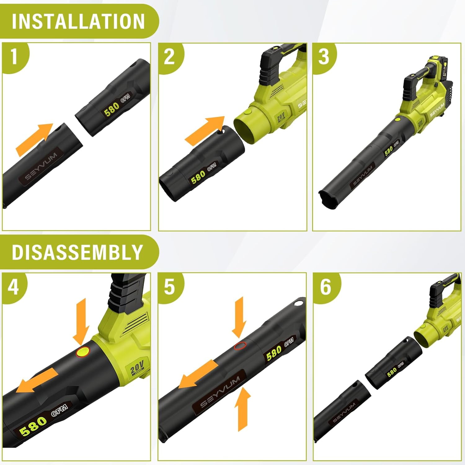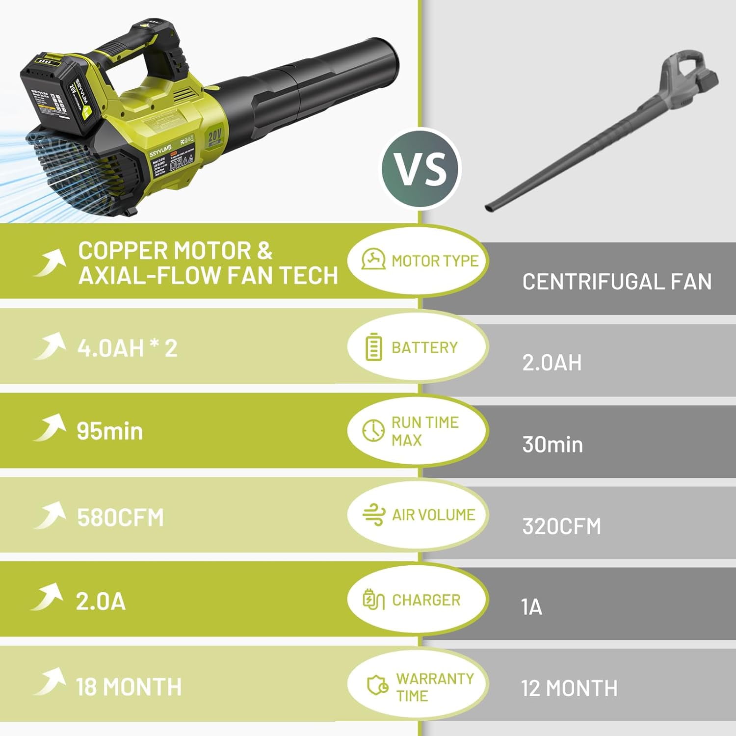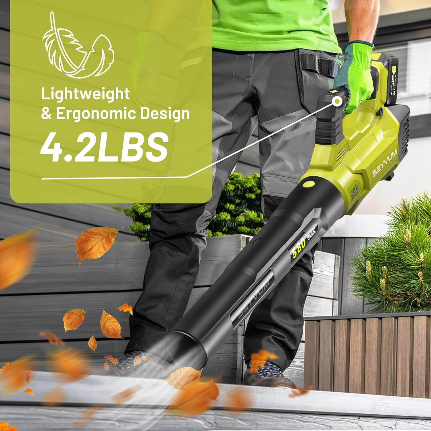 The SEYVUM 20V cordless leaf blower is perfect for any yard. Using copper motor & axial-flow fan tech. It delivers up to 150MPH and 580CFM of power, and has 3 speed settings. The leaf blower weighs 4.2 pounds and can be easily operated with one hand. This electric blower comes with two 4.0Ah batteries, providing up to 95 minutes of working time on low speed. Let you enjoy your garden games to the fullest. Upgraded Powerful Copper Motor & Axial-Flow Fan Tech: SEYVUM leaf blower cordless has an upgraded copper motor which provides a longer lifespan and lower energy consumption than ordinary motors. It adopts axial flow fan technology with faster rotation speed, wind speed and better heat dissipation than traditional centrifugal fans. Two 4.0Ah Large-Capacity Batteries: The electric leaf blower is equipped with two 4.0Ah x 20V batteries and a 2A fast charger. Each battery can be fully charged in only 2 hours. Total operating time for two batteries lasts approximately 35 mins (high speed) and approximately 95 mins (low speed). You can monitor the remaining power and charging progress through the power indicator. 3 Adjustable Speeds: The one-button control on the leaf blower provides three levels of air volume (260-580CFM) to meet your needs. It?s not only great for blowing debris and leaves from garages, driveways, outdoor patios, and gardens, but it can also be used for cleaning dust, cobwebs, and drying your car’s surface. In addition, the strong wind can also effectively remove snow and easily sweep away wet leaves and small stones. Portable & Ergonomic Design: The weight of this electric blower is less than 4.2 lbs. You can easily operate it with one hand. Our grip is made of a flexible rubber material which is non-slip and comfortable to hold. The 2-section tube design allows you to use this product standing or sitting. (The upgraded version is equipped with an adjustable shoulder strap) Service Guarantee: SEYVUM is a brand that focuses on developing high-quality garden tools. All our products have an 18-month warranty, free lifetime technical support, and 24-hour online support from an American repair service center. If you have any questions about the product, please feel free to contact us and we will provide the best service to your satisfaction. Tips: Charge the battery first for a better experience after receiving the product; ?If you charge the battery immediately after usage, the indicator light on the charger may turn green. This is because the battery has a temperature control protection built in. When this happens, please let the battery cool down for 5-10 minutes before charging; ?In order to better extend battery life, please store the battery fully charged when not using the leaf blower. WHAT ARE THERE INCLUDE? 1 * Leaf Blower with 2 Blower Tubes 2 * 4.0Ah Lithium-Ion Battery 1 * Fast Charger 1 * User Manual 1 * Adjustable Strap