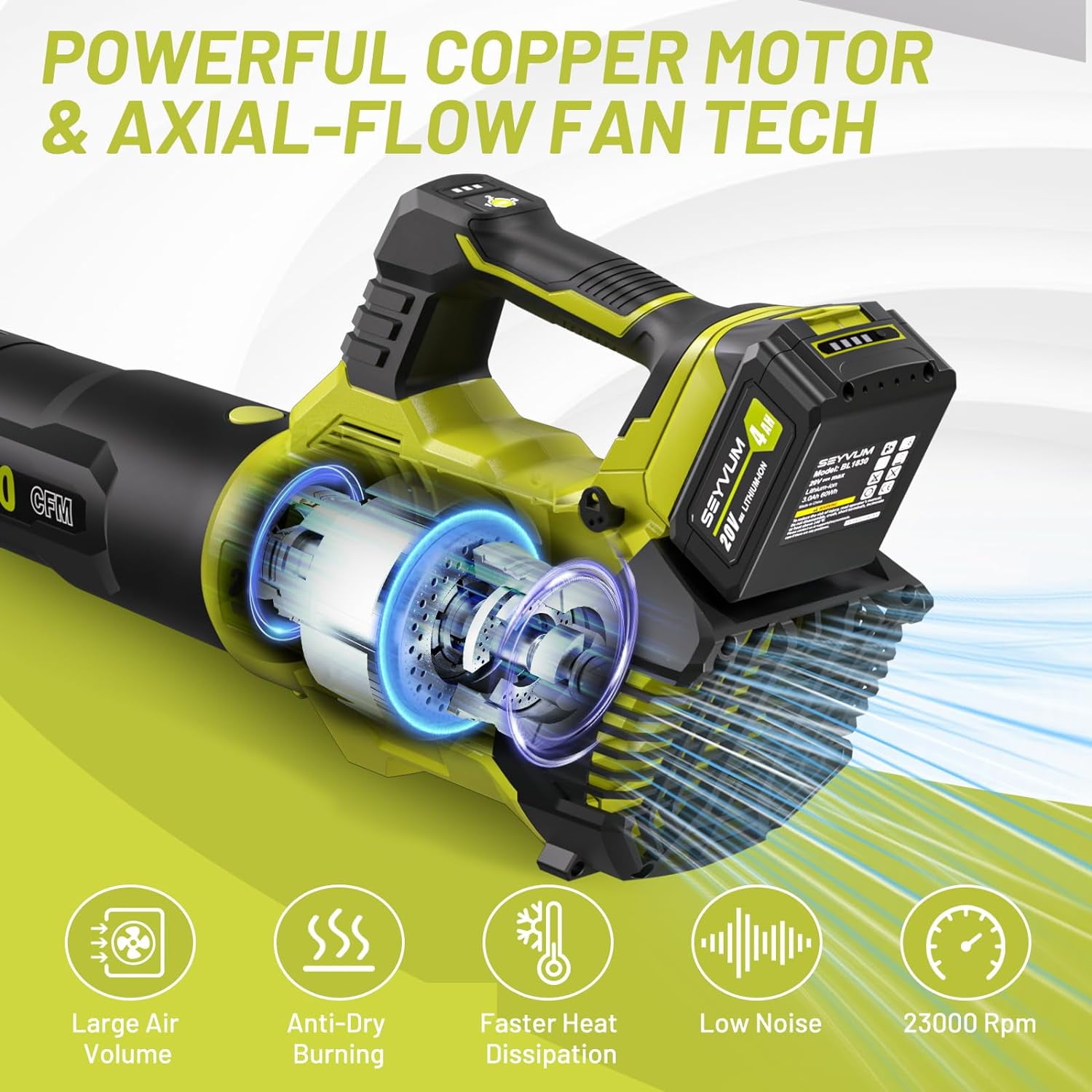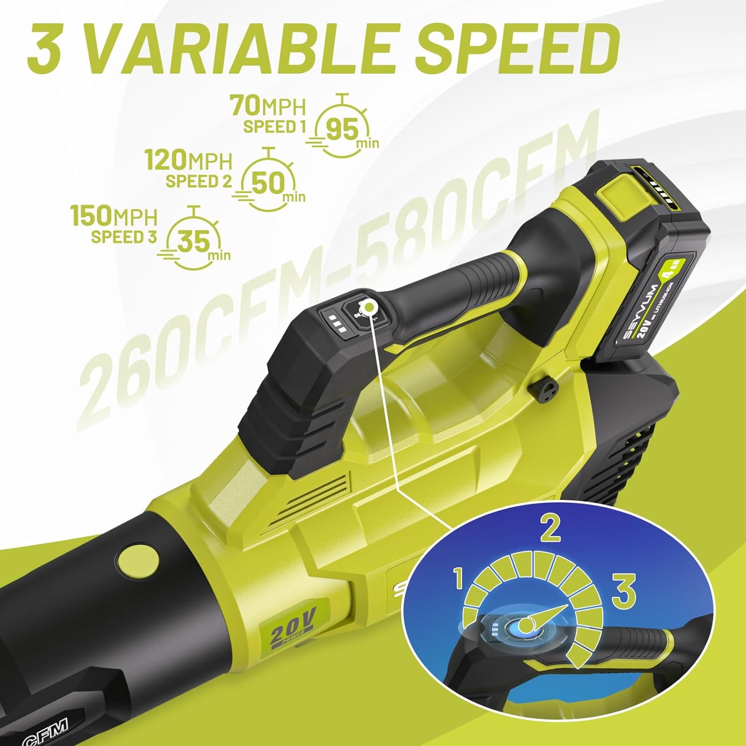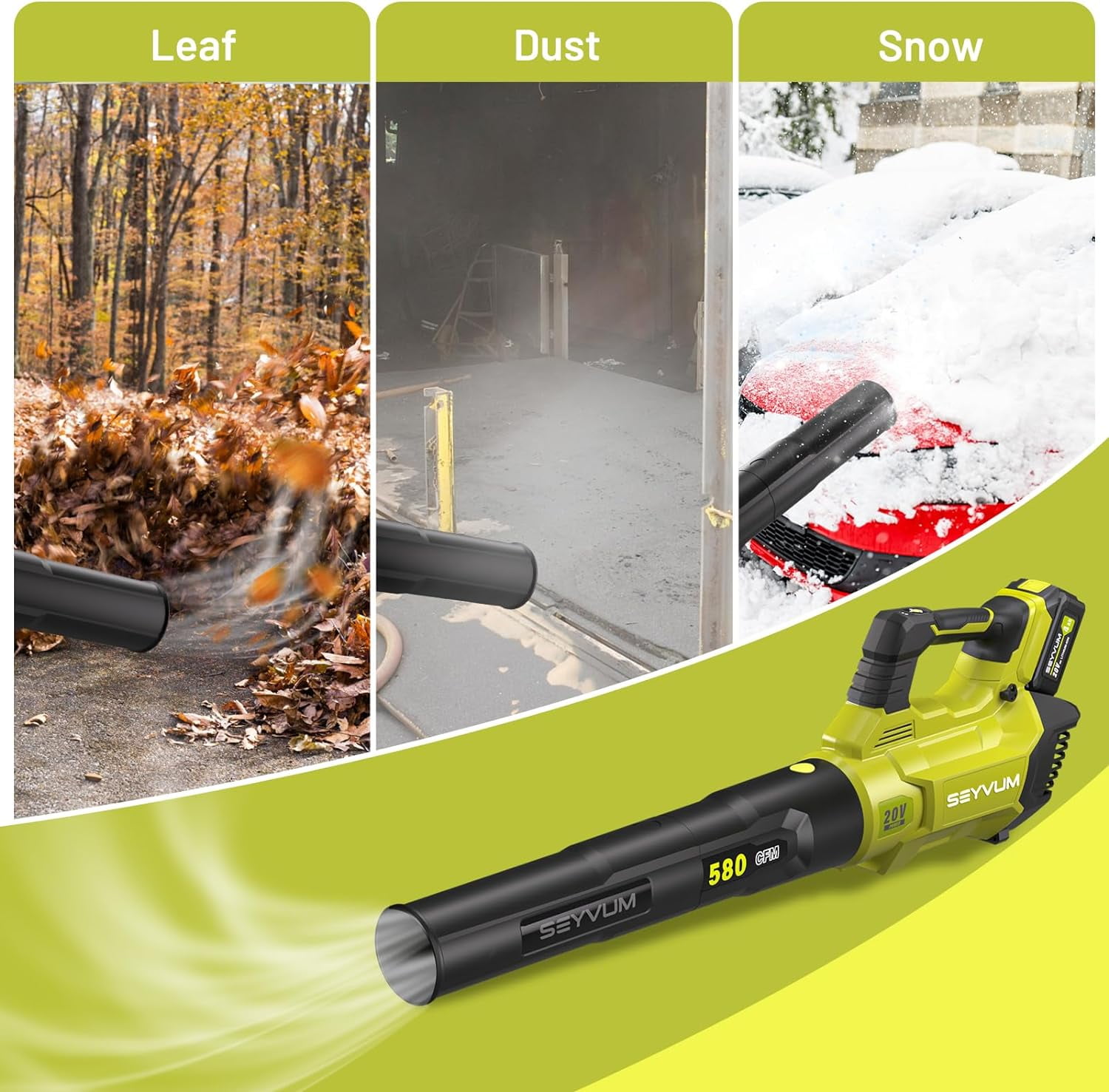 SEYVUM Leaf Blower – 580CFM 20V Leaf Blower Cordless with 2 X 4.0Ah Battery & Charger, 3-Speed Dial Electric Blower Handheld, Lightweight Powerful Battery Operated for Lawn Care, Jobsite