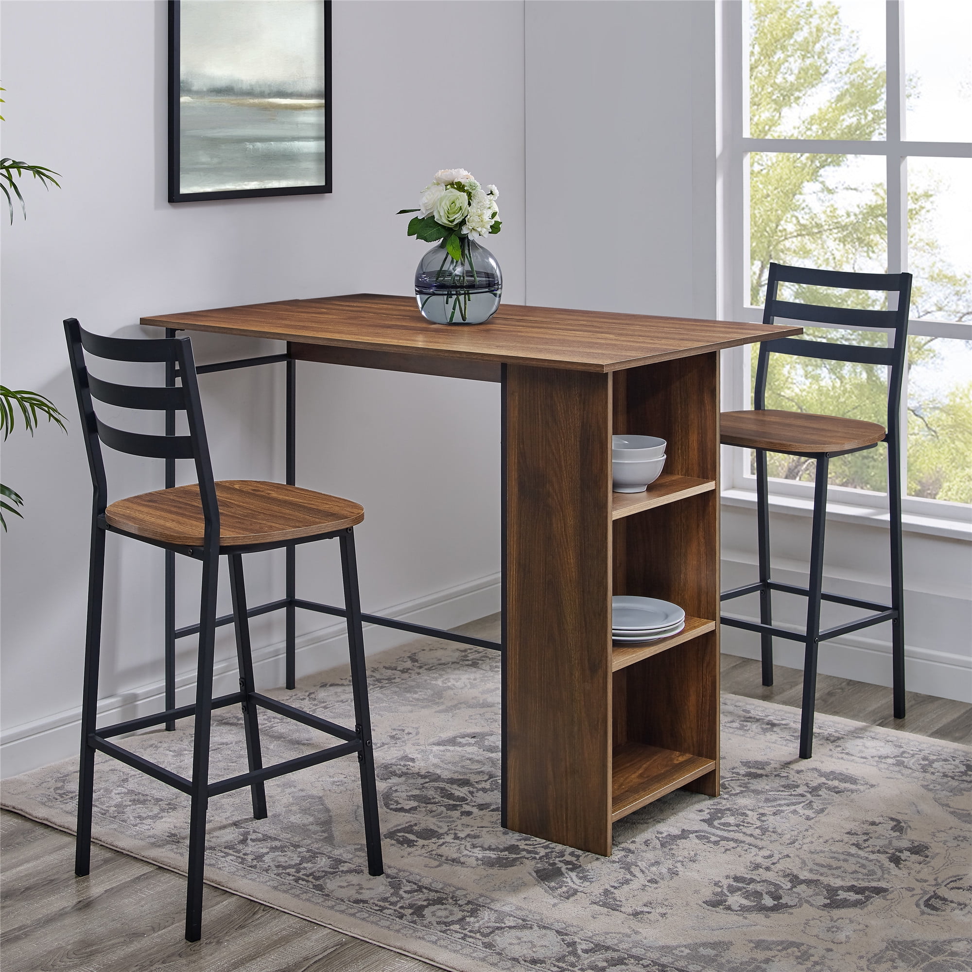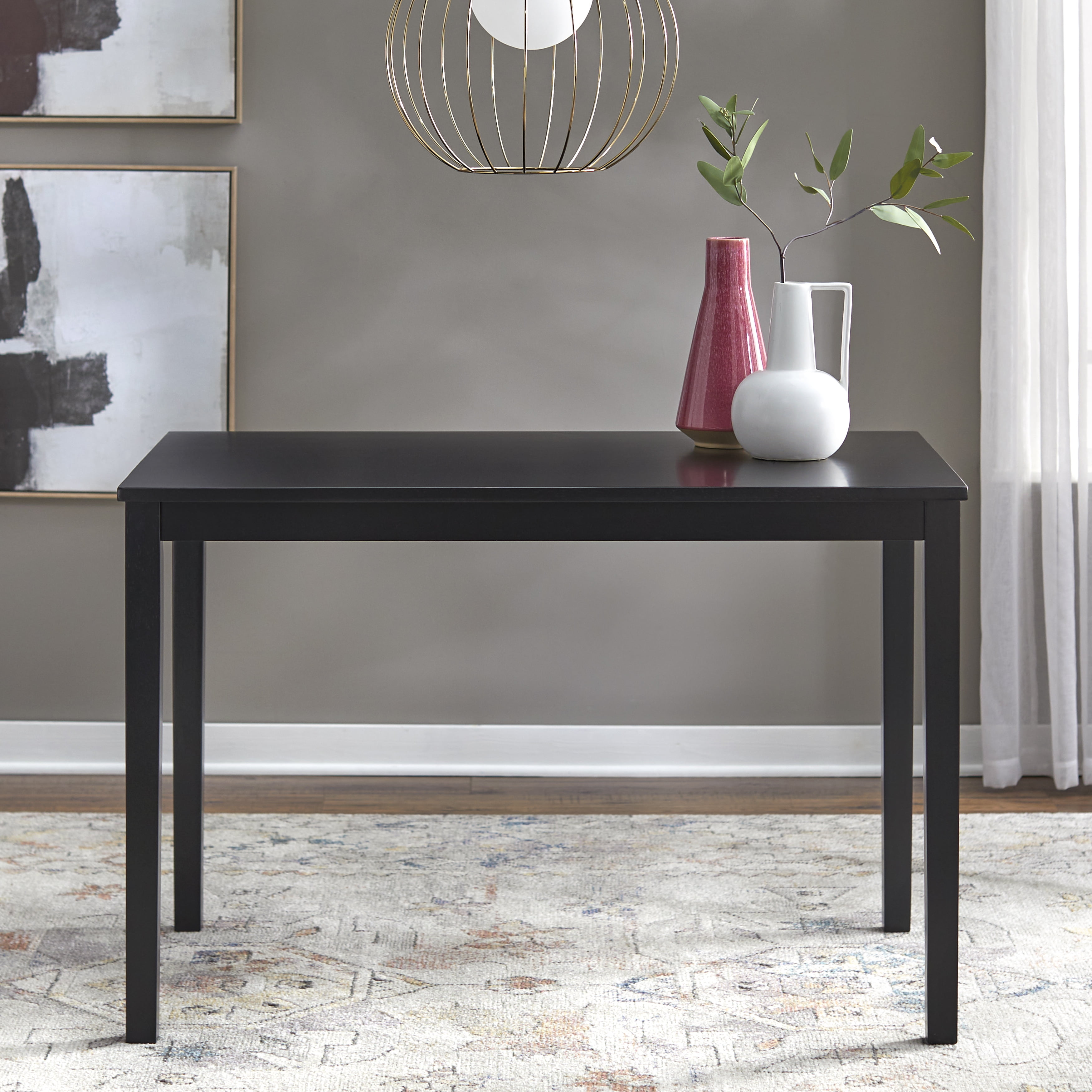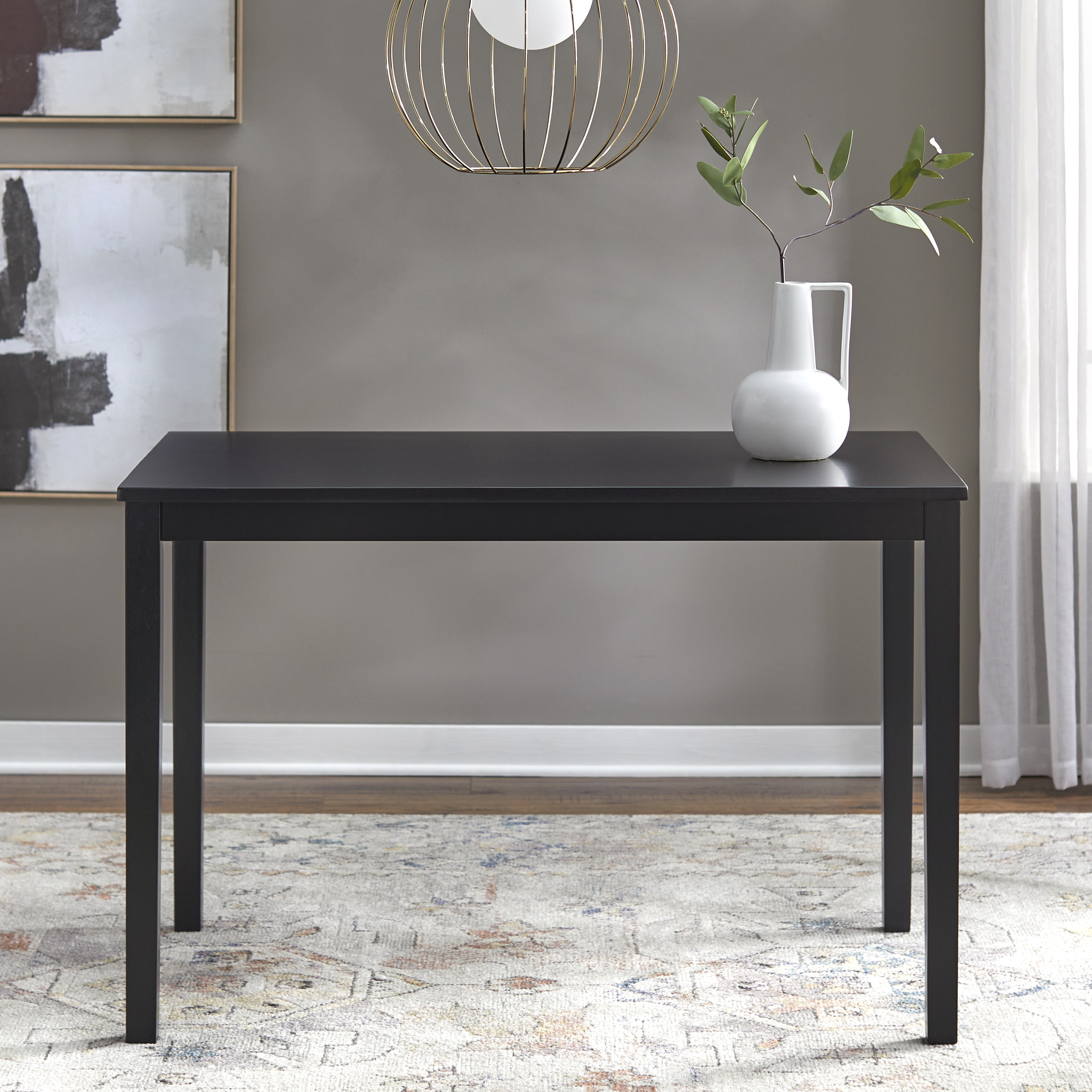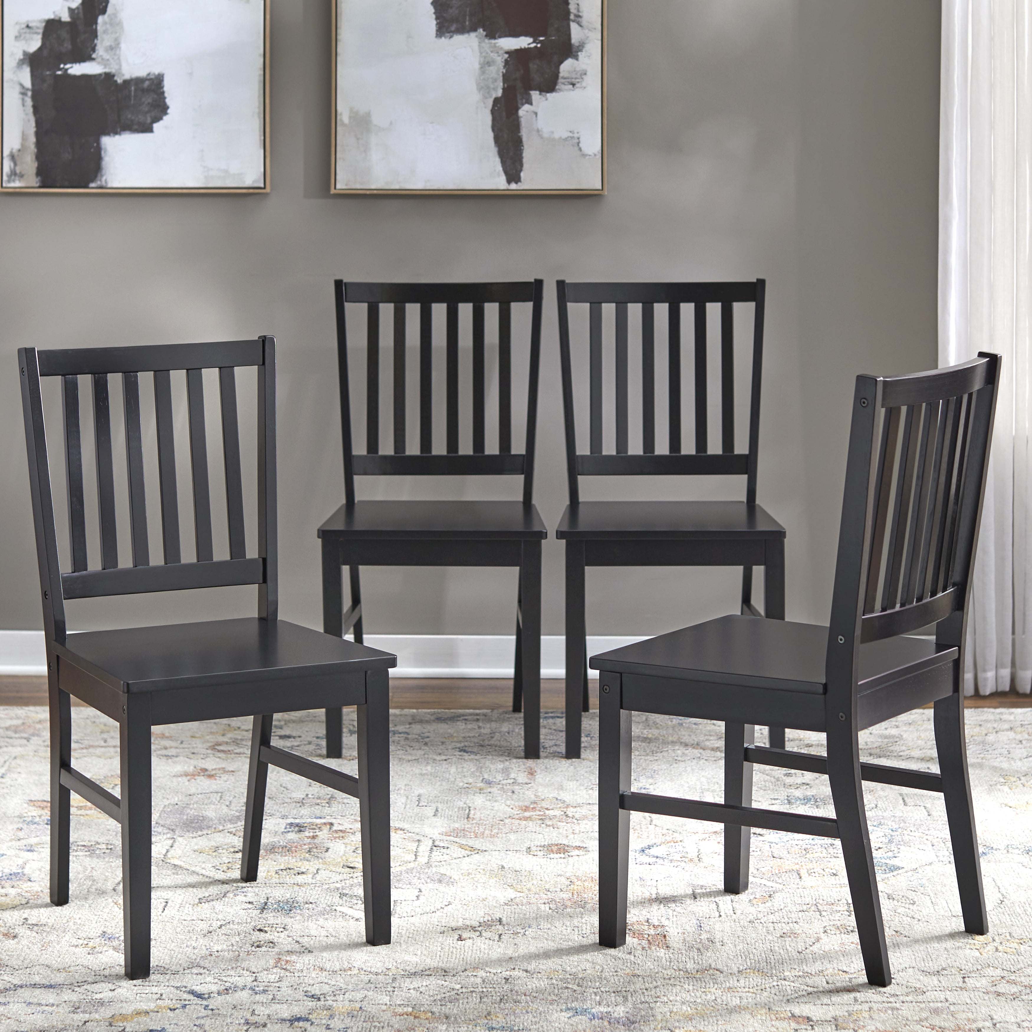 Updated shaker style table and chair set Spacious slat back chair design Transitional design works well in many styles of room decor Set includes: one (1) dining table and four (4) dining chairs Finish is available in Black, Espresso, and White Constructed of MDF and durable Rubberwood Ships in two (2) cartons, assembly required Chair overall dimensions: 17.5″W x 19.75″D x 35.25″H Chair seat dimensions: 17.5″W x 17.5″D x 17.5″H Table overall dimensions: 45″W x 28″D x 29″H For indoor use only Seats 4 comfortably