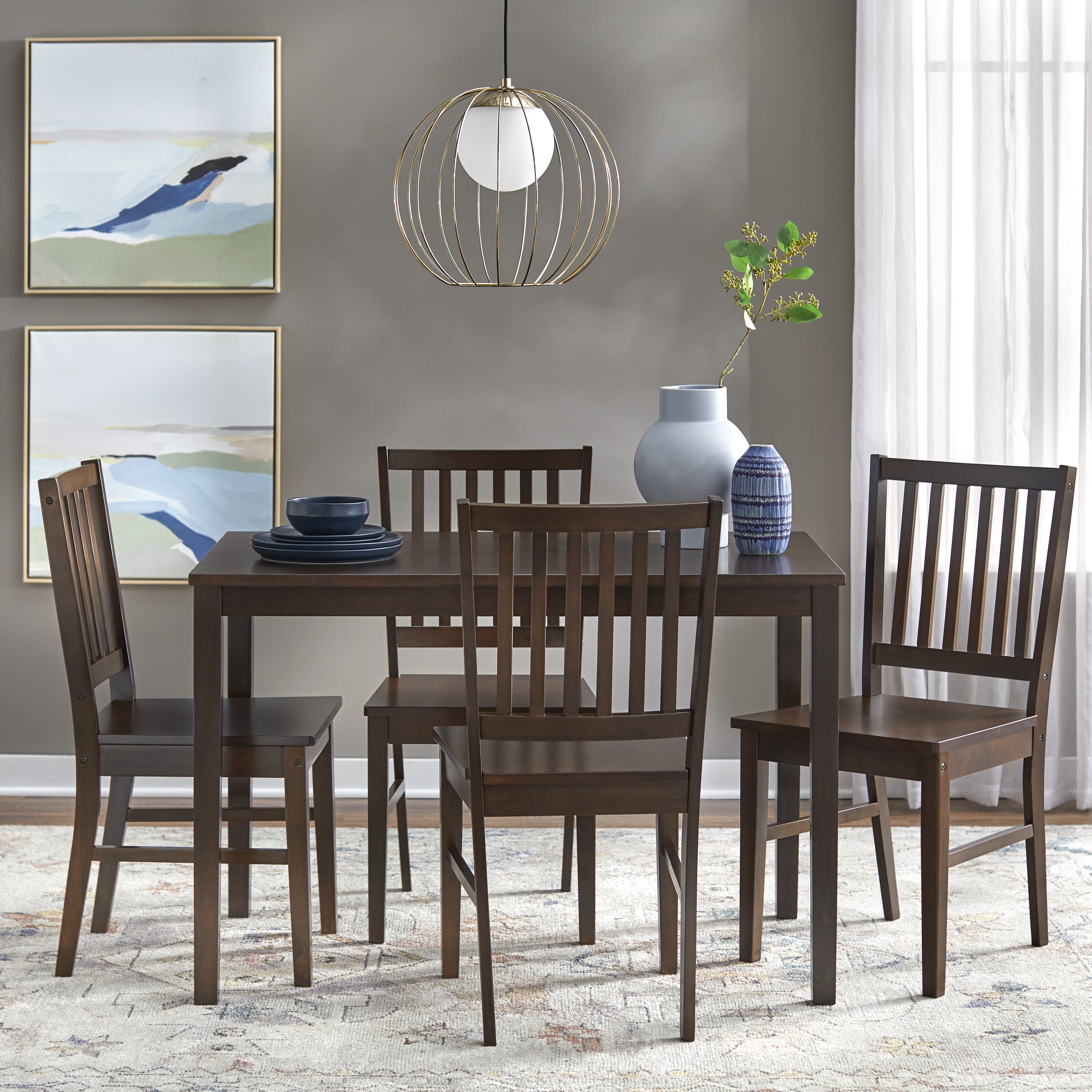 Update your dining room or kitchen with the attractive Shaker 5 Piece Dining Set from TMS. This dining set is a modern take on traditional Shaker-style furniture, creating a transitional design, that easily complements many room interiors. Unique vertical slat back chairs coordinate nicely with the rectangular dining table. The MDF tabletop construction and solid rubber wood, provide durability for long lasting gatherings with family and friends. Available in White, Black or Espresso finishes. Seats four comfortably.