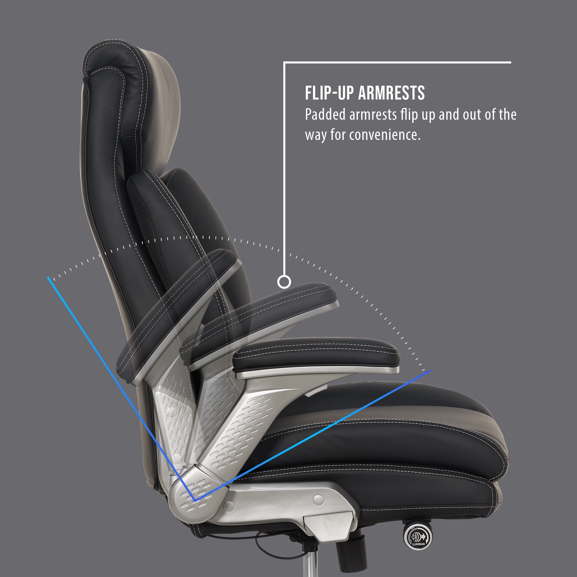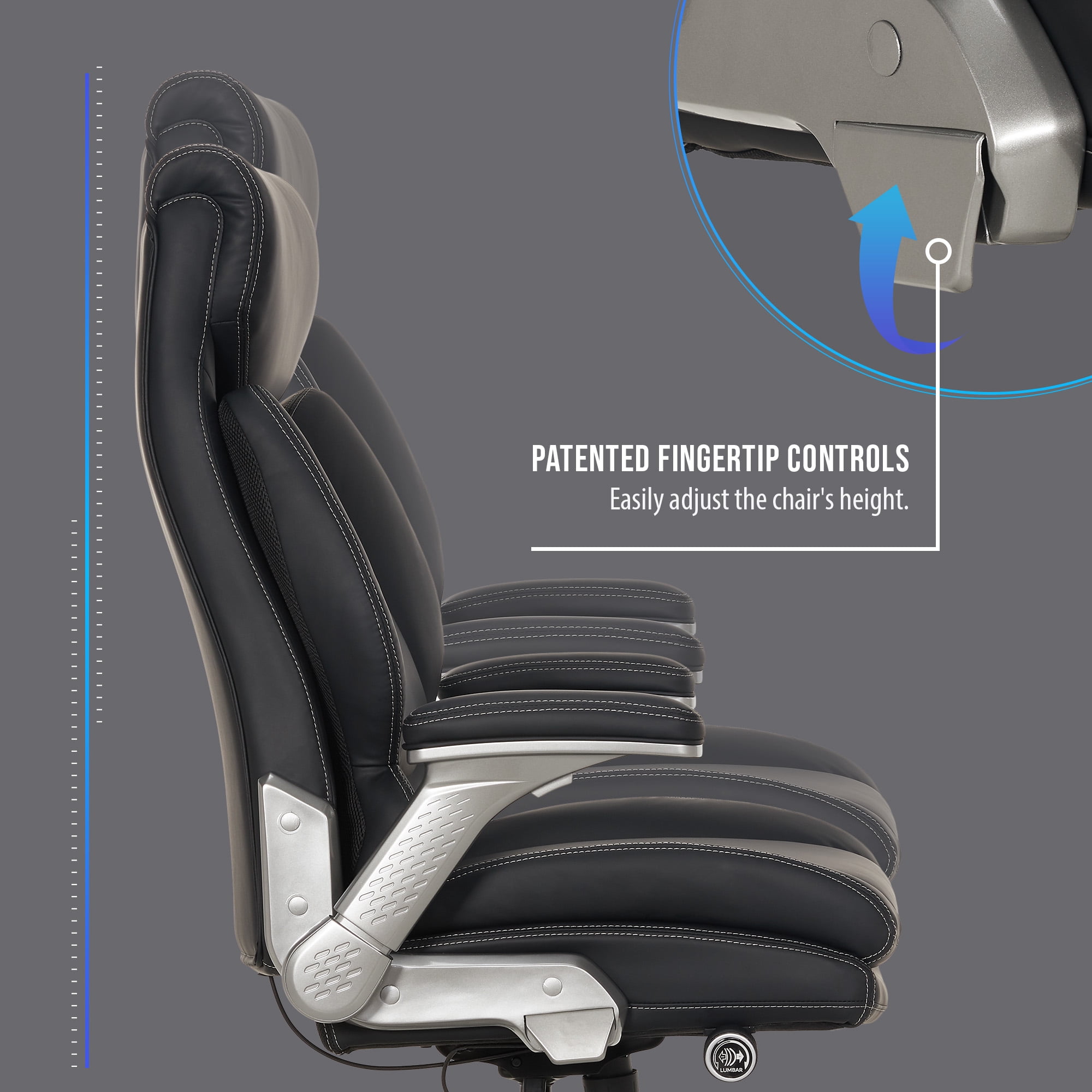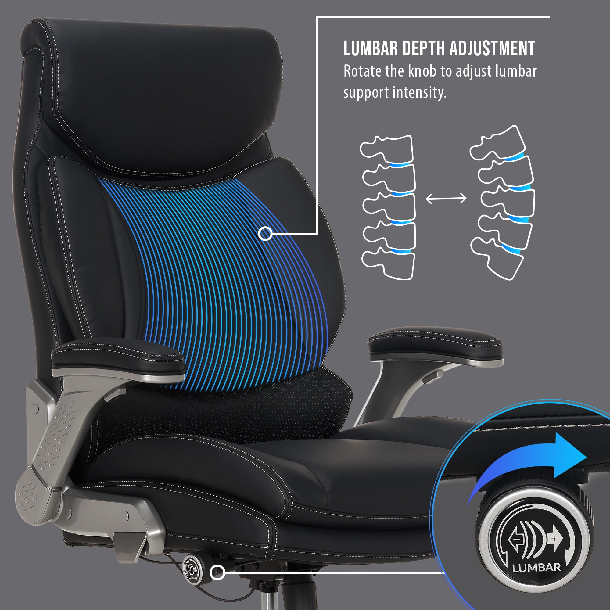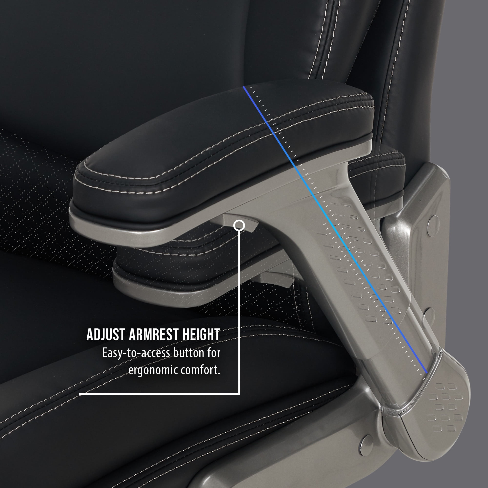 Comfort meets class with the Shaquille O’Neal™ Tarvos Big & Tall Office Chair. This premium seat combines innovative Shaq Comfort™ layers with PureSoft™ upholstery for a stylish, ultra-comfortable experience tailored to larger frames. Designed with AIR Ergonomic Support Technology® and a depth intensity adjustment knob, the advanced lumbar system dynamically adjusts with your movements, giving you personalized lower back support every moment of your day. Enjoy a perfect fit with seat-side patented height adjustment controls, letting you smoothly raise or lower the seat. Flip the fingertip control to recline, and adjust the tension knob to relax with ease. The high-back design includes a plush headrest and height-adjustable, padded flip-up armrests, providing full-body ergonomic comfort for hours of productive seating.