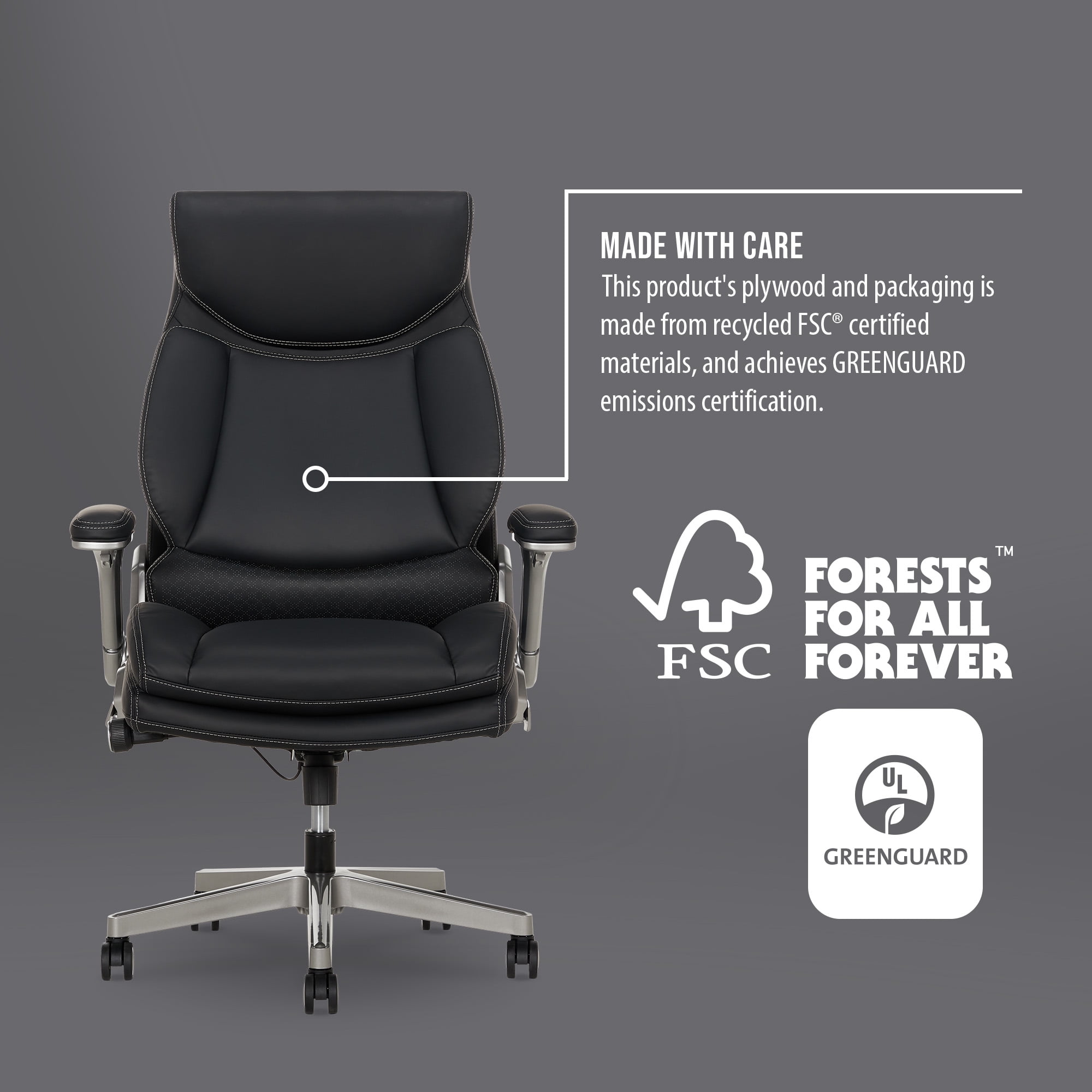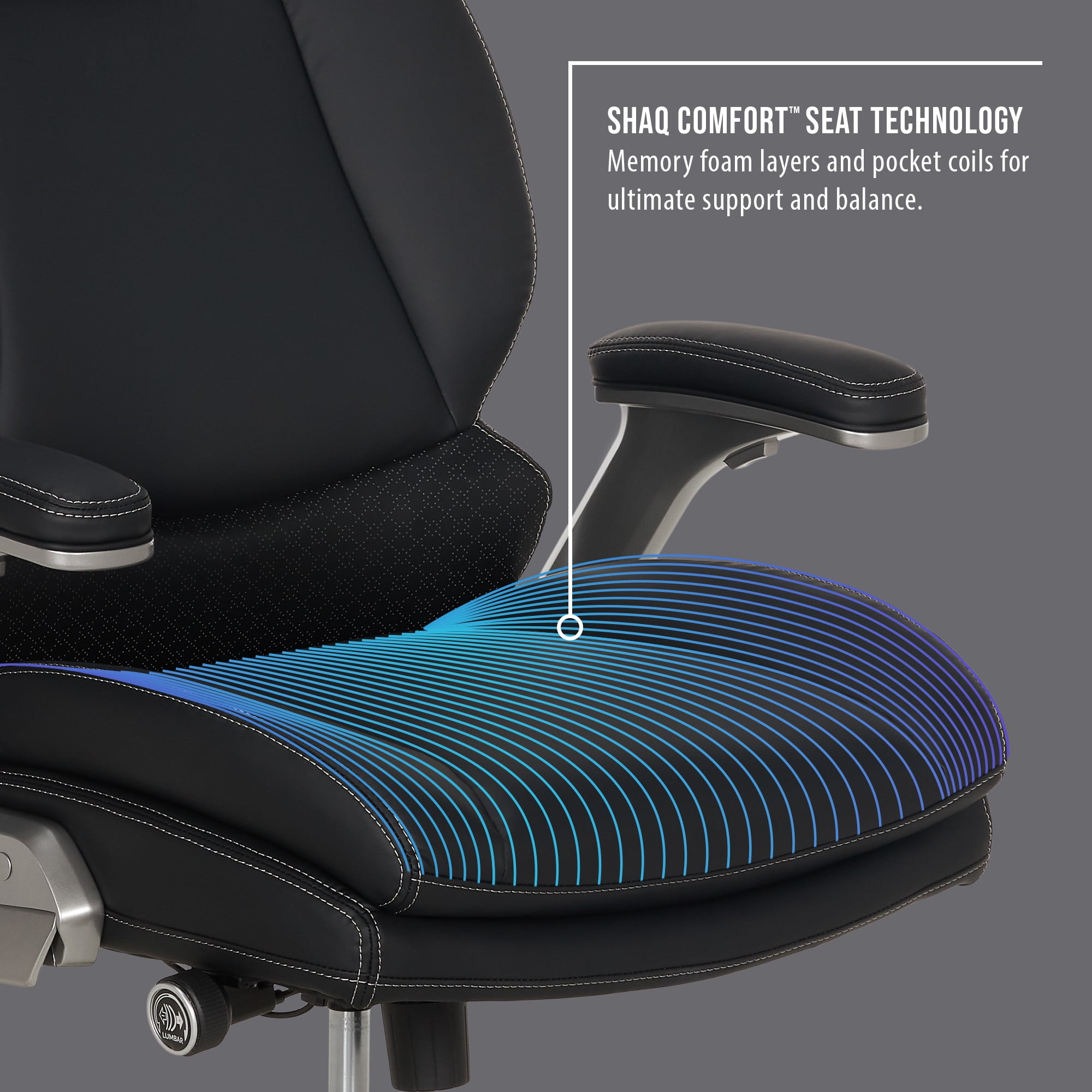 Pillow-plush headrest AIR Ergonomic Support Technology® lumbar moves when you move Lumbar depth adjustment knob increases or relaxes the support intensity Premium grade PureSoft™ upholstery Flip-up padded armrests with height adjustments Seat-side fingertip controls recline the chair and raise/lower the chair’s height Tilt tension control for customized relaxation Shaq Comfort™ seat construction with memory foam layers and pocket coil technology Heavy-duty construction made with high-quality materials safely supports up to 400 lbs Dual-wheel 360° swivel casters for easy movement on most carpet types Overall dimensions: 30” D x 29.5” W x 46.5” – 49.5” H Weight: 50.15 lbs. Casters are intended for use on carpet and are not recommended for use on tile or hardwood floors. Easy to assemble. No additional tools needed for assembly. Endorsed by the American Chiropractic Association This product exceeds BIFMA industry standards for safety, quality, and durability This product uses FSC® certified plywood and packaging made from recycled materials GREENGUARD certified meeting rigorous third-party chemical emissions standards, reducing indoor air pollution and the risk of chemical exposure Adults and Teens