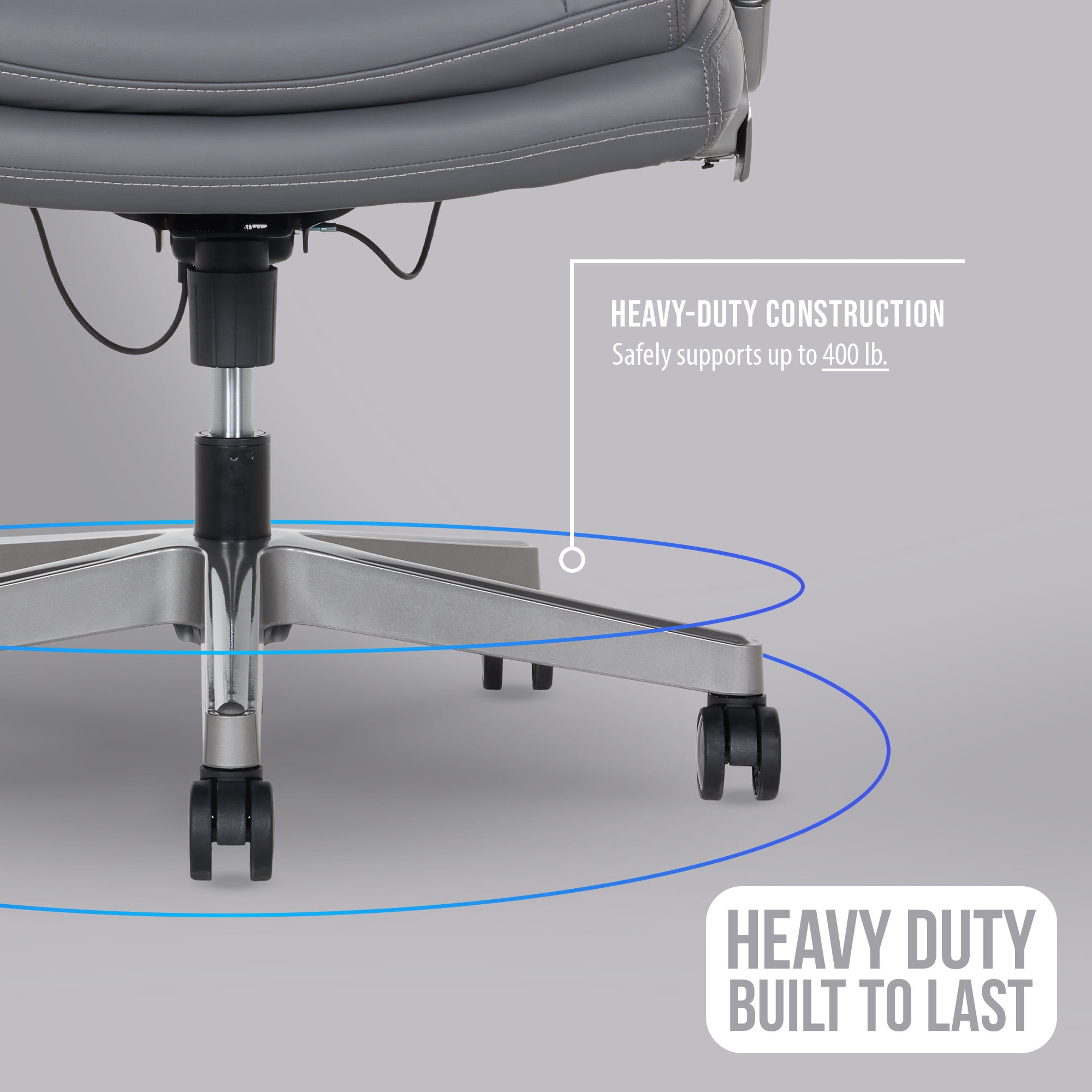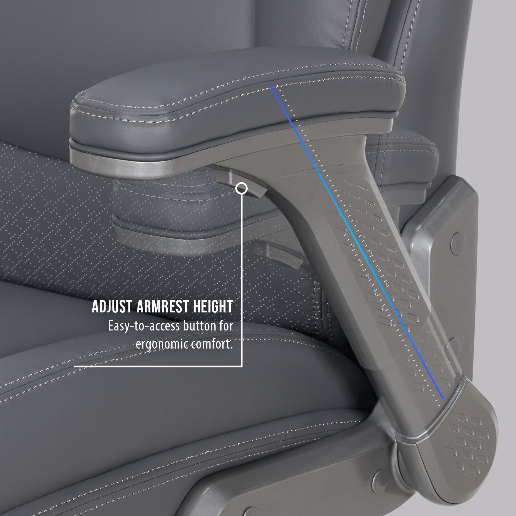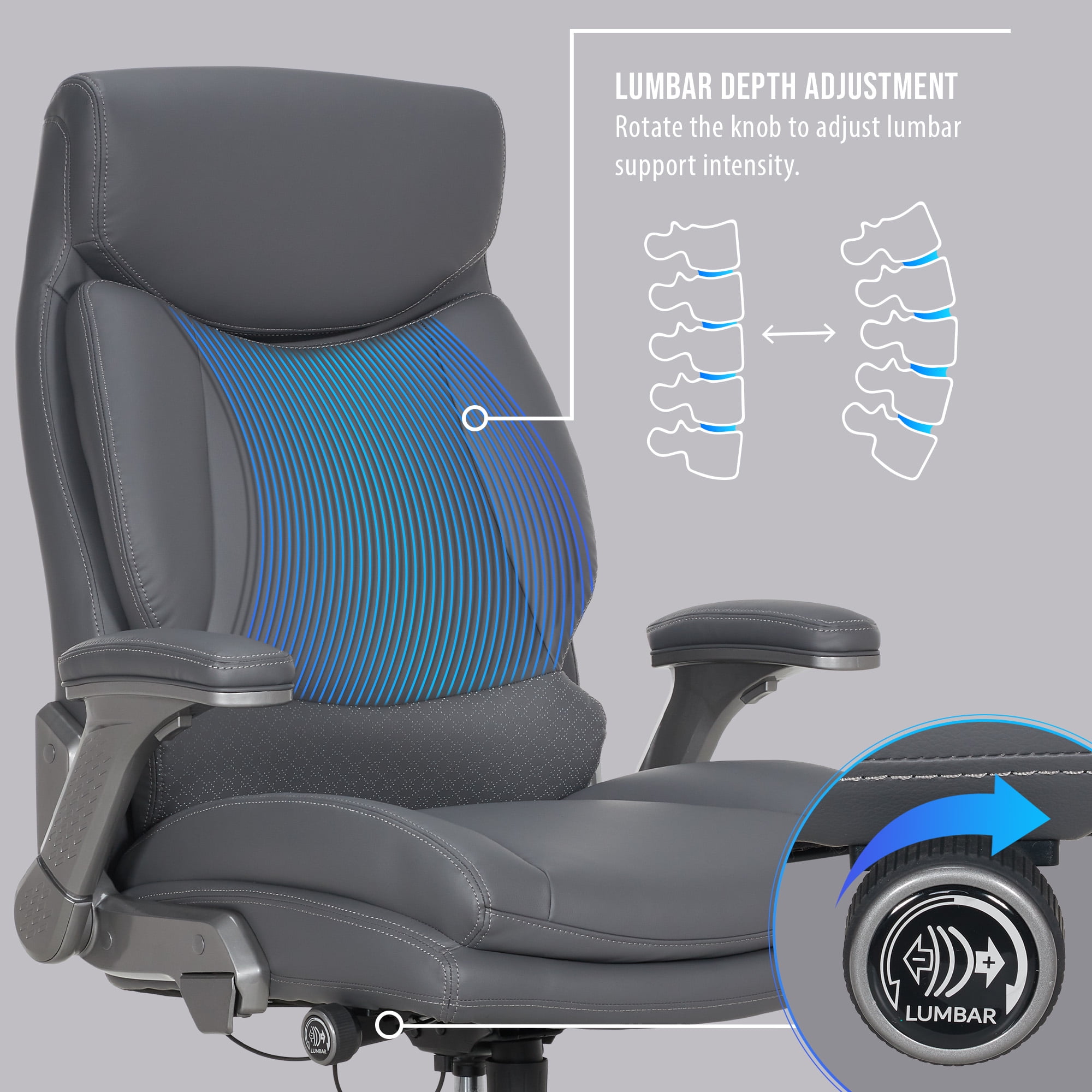 Comfort meets class with the Shaquille O’Neal™ Tarvos Big & Tall Office Chair. This premium seat combines innovative Shaq Comfort™ layers with PureSoft™ upholstery for a stylish, ultra-comfortable experience tailored to larger frames. Designed with AIR Ergonomic Support Technology® and a depth intensity adjustment knob, the advanced lumbar system dynamically adjusts with your movements, giving you personalized lower back support every moment of your day. Enjoy a perfect fit with seat-side patented height adjustment controls, letting you smoothly raise or lower the seat. Flip the fingertip control to recline, and adjust the tension knob to relax with ease. The high-back design includes a plush headrest and height-adjustable, padded flip-up armrests, providing full-body ergonomic comfort for hours of productive seating.