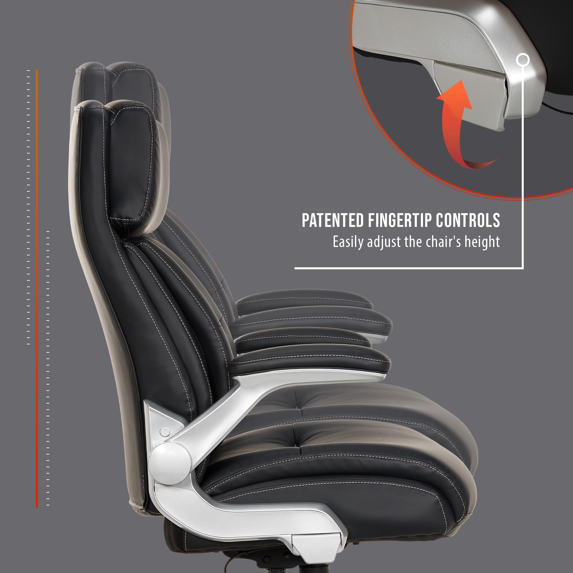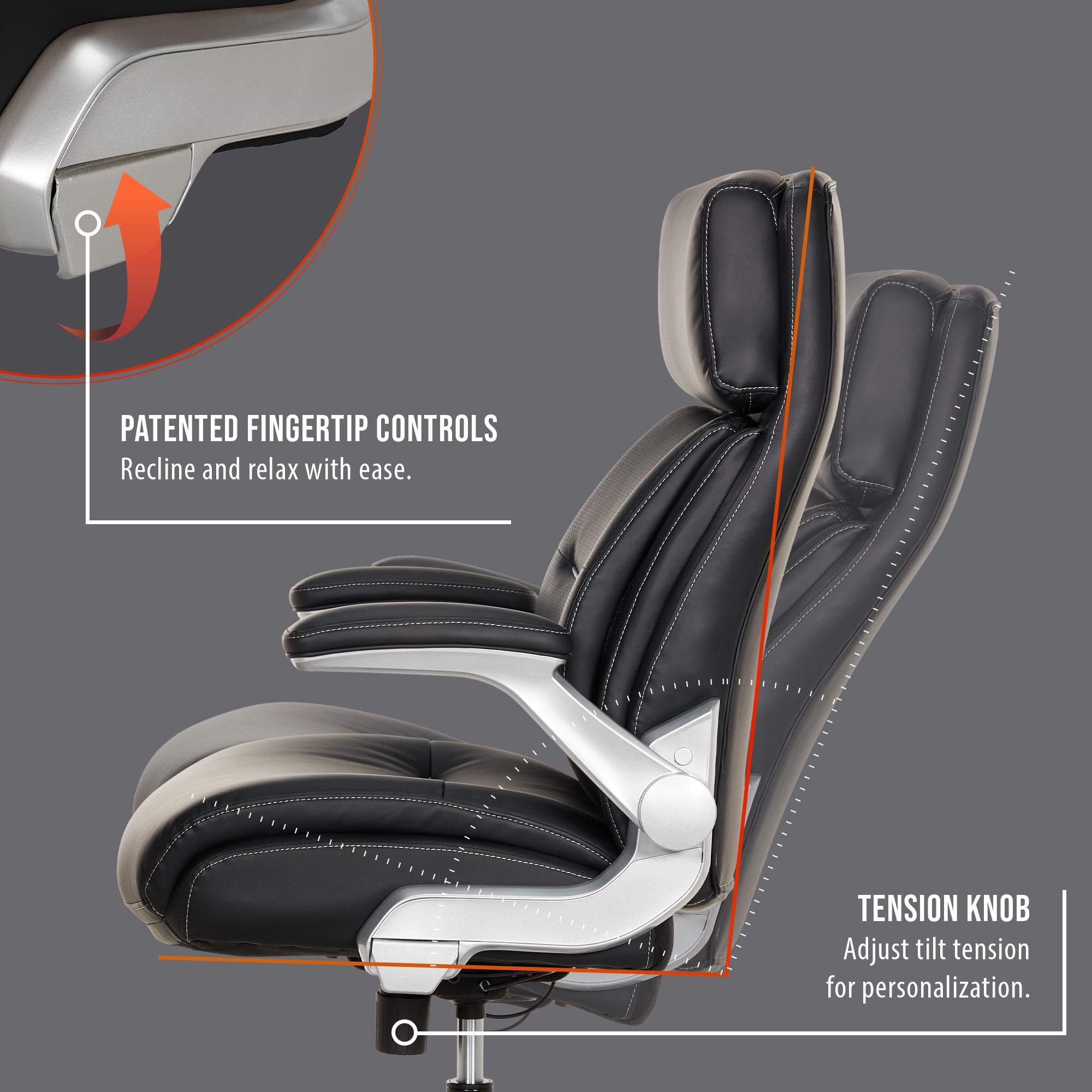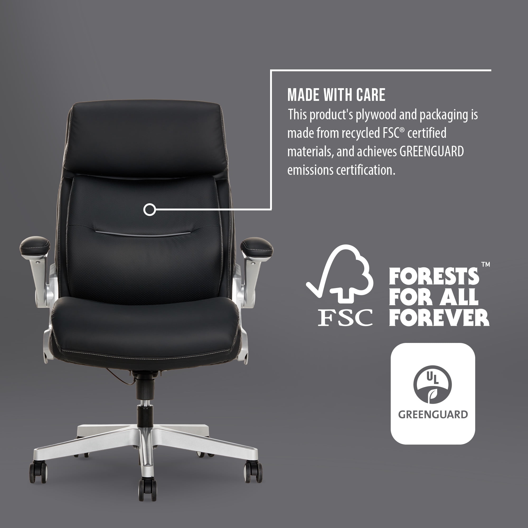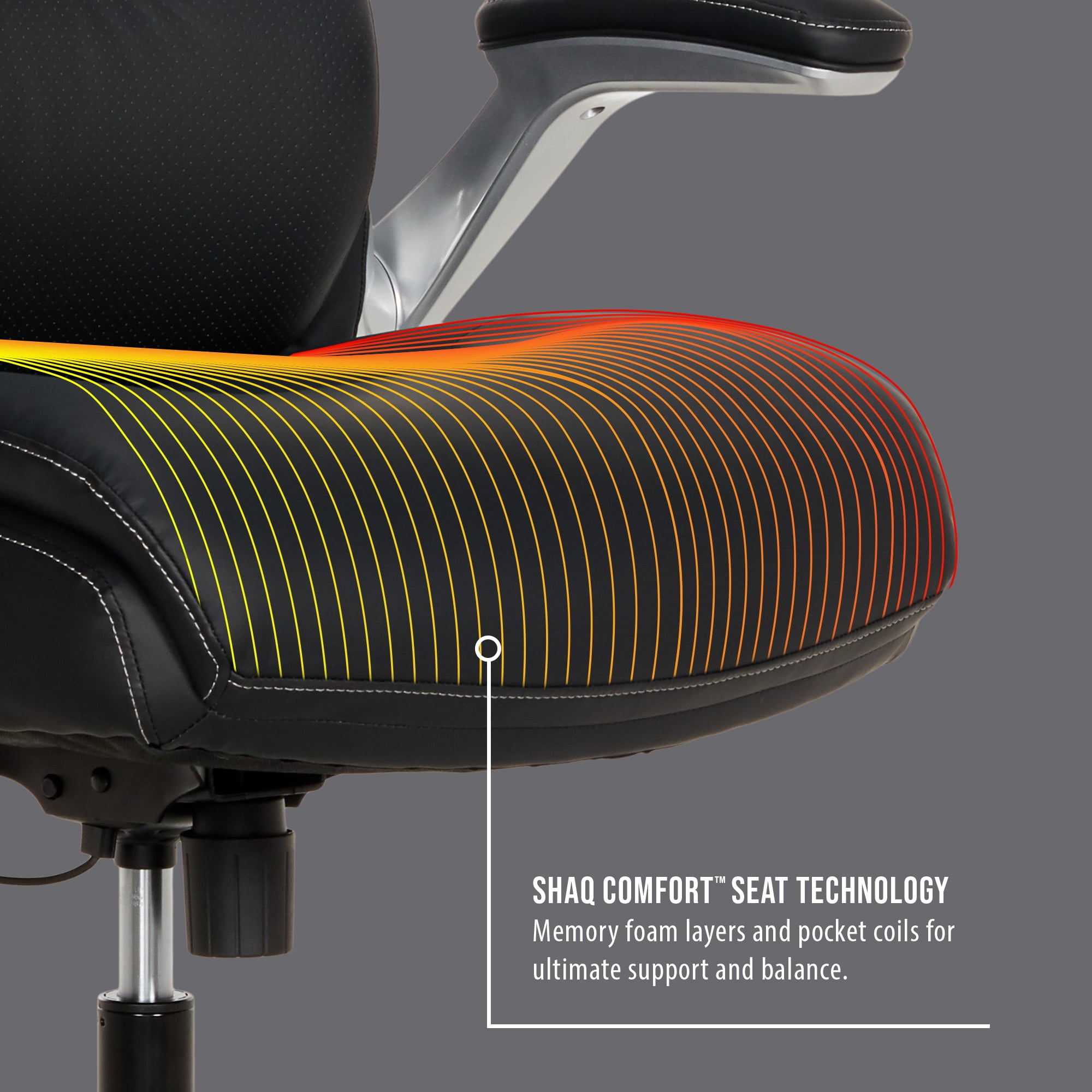 Ultra-plush headrest for pillow-like support Flexible AIR Ergonomic Support Technology® lumbar that moves with you Luxurious PureSoft™ upholstery Flip-up padded armrests with height adjustments Seat-side fingertip controls recline the chair and raise/lower the chair’s height Tilt tension control for customized relaxation Shaq Comfort™ seat construction with memory foam layers and pocket coil technology Heavy-duty construction made with high-quality materials safely supports up to 400 lbs Dual-wheel 360° swivel casters for easy movement on most carpet types Overall dimensions: 29.5” D x 28.5” W x 43.5”-46.5” H Weight: 47.4 lbs. Casters are intended for use on carpet and are not recommended for use on tile or hardwood floors. Easy to assemble. No additional tools needed for assembly. Endorsed by the American Chiropractic Association This product exceeds BIFMA industry standards for safety, quality, and durability. This product uses FSC® certified plywood and packaging made from recycled materials. GREENGUARD certified meeting rigorous third-party chemical emissions standards, reducing indoor air pollution and the risk of chemical exposure. Adults and Teens